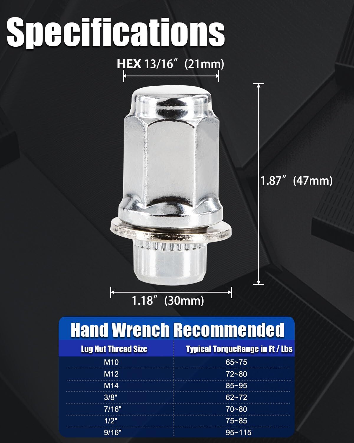 Toyota Factory Part # 90942-01058 Toyota Factory Part # 90080-17036 Toyota Factory Part # 90942-01095 GM Factory Part # 19204273 Dorman Part # 611-167 6 lugs 1995-2023 Toyota 4Runner 1995-2022 Toyota Tacoma 2009-2022 Lexus GX460 2007-2014 Toyota FJ Cruiser 2000-2006 Toyota Tundra 2001-2007 Sequoia 2003-2009 Lexus GX470 and More Specification: Thread pitch: 12mmx1.50/M12x1.5 Overall length: 1.87”(47mm) Overall width: 1.18”(30mm) Hex:0.8"(21mm) Material: Alloy Steel Mag Seat OEM/FACTORY wheels Package: 24pcs nuts silver U.S Based Brand Toyota Factory Part # 90942-01058 Toyota Factory Part # 90080-17036 Toyota Factory Part # 90942-01095 GM Factory Part # 19204273 Dorman Part # 611-167 12mmx1.5 Wheel Lug Nuts OEM 24 PC Please Check the Parameter Again before Placing your OrderTips FITMENT(The size is 12-1.5, the 24pc set is also fit for 20ps set,Extra 4pc can be used as a backup) 6 lugs 1995-2023 Toyota 4Runner 1995-2022 Toyota Tacoma 2009-2022 Lexus GX460 2007-2014 Toyota FJ Cruiser 2000-2006 Toyota Tundra 2001-2007 Sequoia 2003-2009 Lexus GX470 and More Specification: Thread pitch: 12mmx1.50/M12x1.5 Overall length: 1.87”(47mm) Overall width: 1.18”(30mm) Hex:0.8"(21mm) Material: Alloy Steel Mag Seat OEM/FACTORY wheels Package: 24pcs nuts silver U.S Based Brand Hand Wrench Recommended Please don't use the impact tool which may damage the surface coating and we recommend you to use hand wrench, here are the lug diam and suitable Torque(ft.lbs) 7/16'' 55-65(ft.lbs) 1/2'' 75-85(ft.lbs) 9/16'' 95-115(ft.lbs) 12MM 72-80(ft.lbs) 14MM 85-95(ft.lbs) Precision Threading Clearer threads make the installation smoother and not easy to fall off Silver Surface Formed By Chrome Plated Make the surface of the nut look more shiny and not easy to rust Cutting-Edge Rust Inhibiting Technology Through 72 hours Salt Spay test