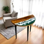 Product Information Size: 24x12 Inches Material: Wood, Epoxy, Resin & Handmade Arts Shape: Semicircle Epoxy table tops have become progressively well known lately, on account of their dazzling appearance and strength. These tabletops are made by blending epoxy pitch in with a hardener and pouring it onto a pre-arranged surface. When restored, the epoxy frames a gleaming, smooth completion that improves the regular excellence of the wood or different materials utilized. One of the vital benefits of epoxy table tops is their capacity to make a feeling of profundity and three-dimensionality. The straightforward idea of the epoxy permits the fundamental materials to radiate through, bringing about an extraordinary and eye-getting tasteful. Likewise, epoxy is accessible in a large number of varieties and gets done with, considering unending imaginative conceivablex outcomes. One more significant advantage of epoxy table tops is their uncommon toughness. Epoxy is exceptionally impervious to stains, scratches, and intensity, pursuing it an ideal decision for high-traffic regions like feasting tables or ledges. This strength additionally guarantees that the table top will stay in top condition long into the future, decreasing the requirement for continuous support or substitution. Besides, epoxy table tops deal a degree of customization that is unparalleled by different materials. Planners and mortgage holders can consolidate different components like wood cuts, stones, shells, or even photographs into the epoxy gum to make an exceptional piece that mirrors their own style. The capacity to feature novel and significant items inside the tabletop adds a nostalgic touch to the general plan. Notwithstanding, it is crucial for note that making an epoxy table top requires cautious planning and ability. The surface should be appropriately sanded, cleaned, and prepared before the epoxy is poured to guarantee a perfect completion. Also, the restoring system can require a few days, during which the table should stay undisturbed to forestall defects. All in all, epoxy table tops are a famous decision for those looking for an outwardly dazzling and sturdy surface. With their capacity to improve the excellence of materials, endure day to day mileage, and proposition unending customization choices, epoxy table tops have secured themselves as a go-to decision for inside creators and property holders the same. Kindly Note:-- As raw wood is used in its natural form and shape to make the table, the table shown in the photos has already been purchased so actual product may vary from the picture shown. This is only table, any kind of legs ( Iron, Wooden, Marble ) is not included in this price. If you want any kind of legs so please message us. You can customize your product easily like:- Shape , Colour , Size & Design. Thanks for Visiting.....