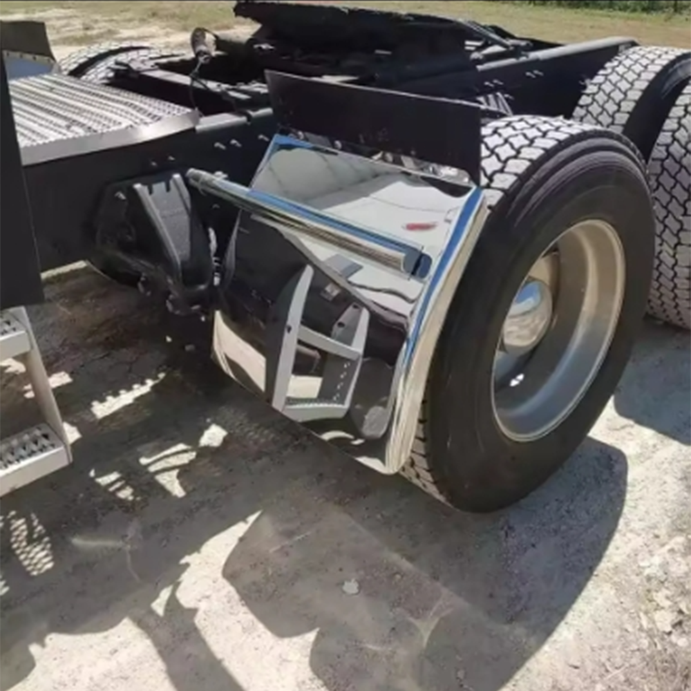 About this item COMPATIBLE WITH: this 24"x24" stainless steel quarter fender fit for most Semi Truck: Freightliner, Kenworth, Peterbilt, International, Mack, Volvo. EASY TO INSTALL: comes with all the accessories you need - round tube support brackets, standard mounting kit and single bolt bracket to make installation super simple. HIGH QUALITY: made of heavy duty 430 stainless steel construction for reliability, durability, anti-corrosion and long service life. FUNCTION: protect your truck and road neighbors from sand, rocks, and liquids, while maintain a tide appearance of your truck. WHAT YOU GET: A pair of 24"x24" stainless steel quarter fender set (left and right side) with top flap and all hardware to mount. 2 pcs single bolt mounting bracket are provided. If there is any needs or questions about the parts, pleae feel free to contact us, we will respond you within 12 hours as usual
