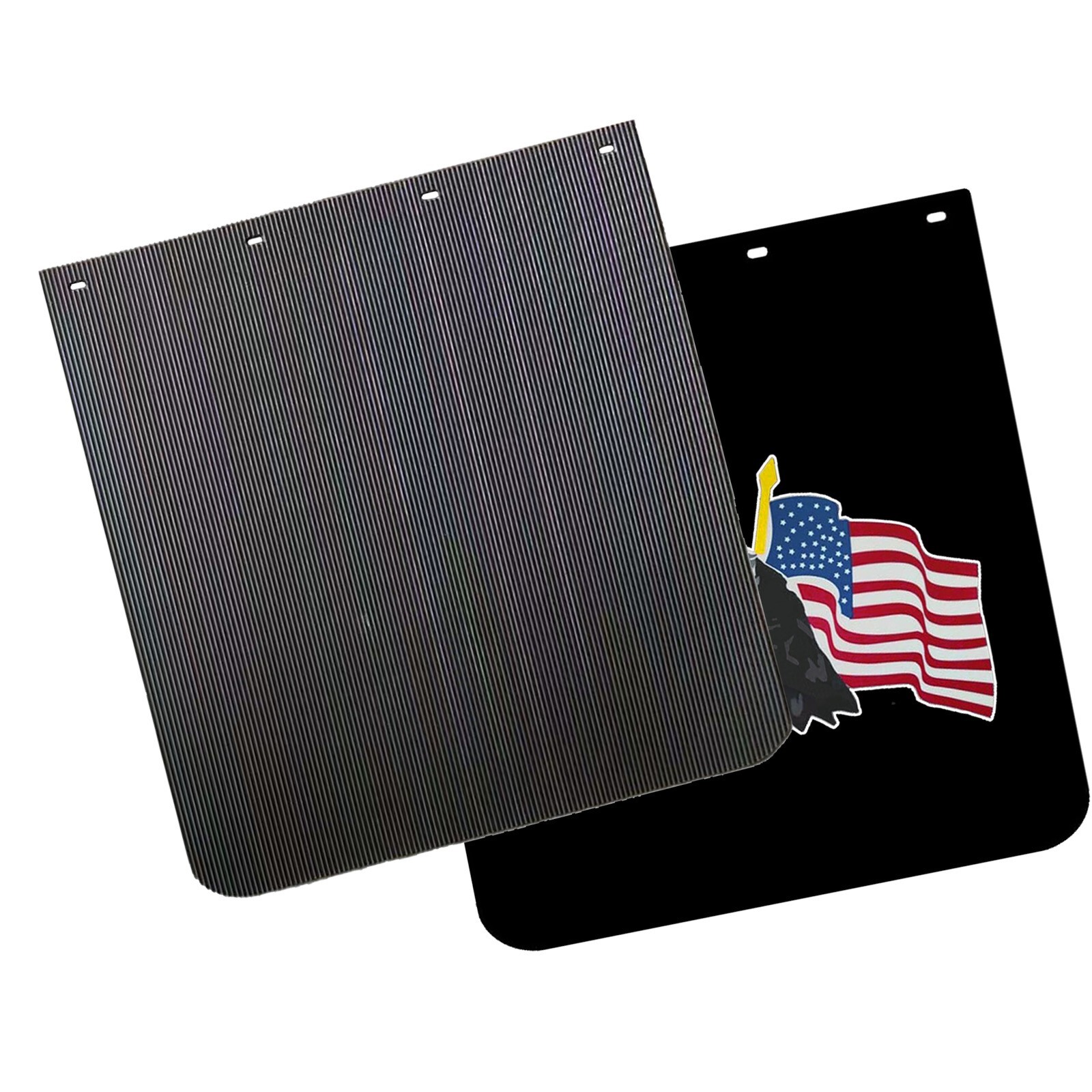 This product is a pair of 24" x 24" Black Heavy Duty Thick Rubber Mud Flaps designed for semi trucks and trailers. They are made of durable plastic material and feature a painted finish. The mud flaps come with 2 PCS included and have a universal fitment, making them suitable for various vehicles. They are designed to be car wash safe and washable, with a bolt-on attachment type for easy installation. These mud flaps are a performance part that provides protection for the rear of the vehicle from mud and debris while driving.