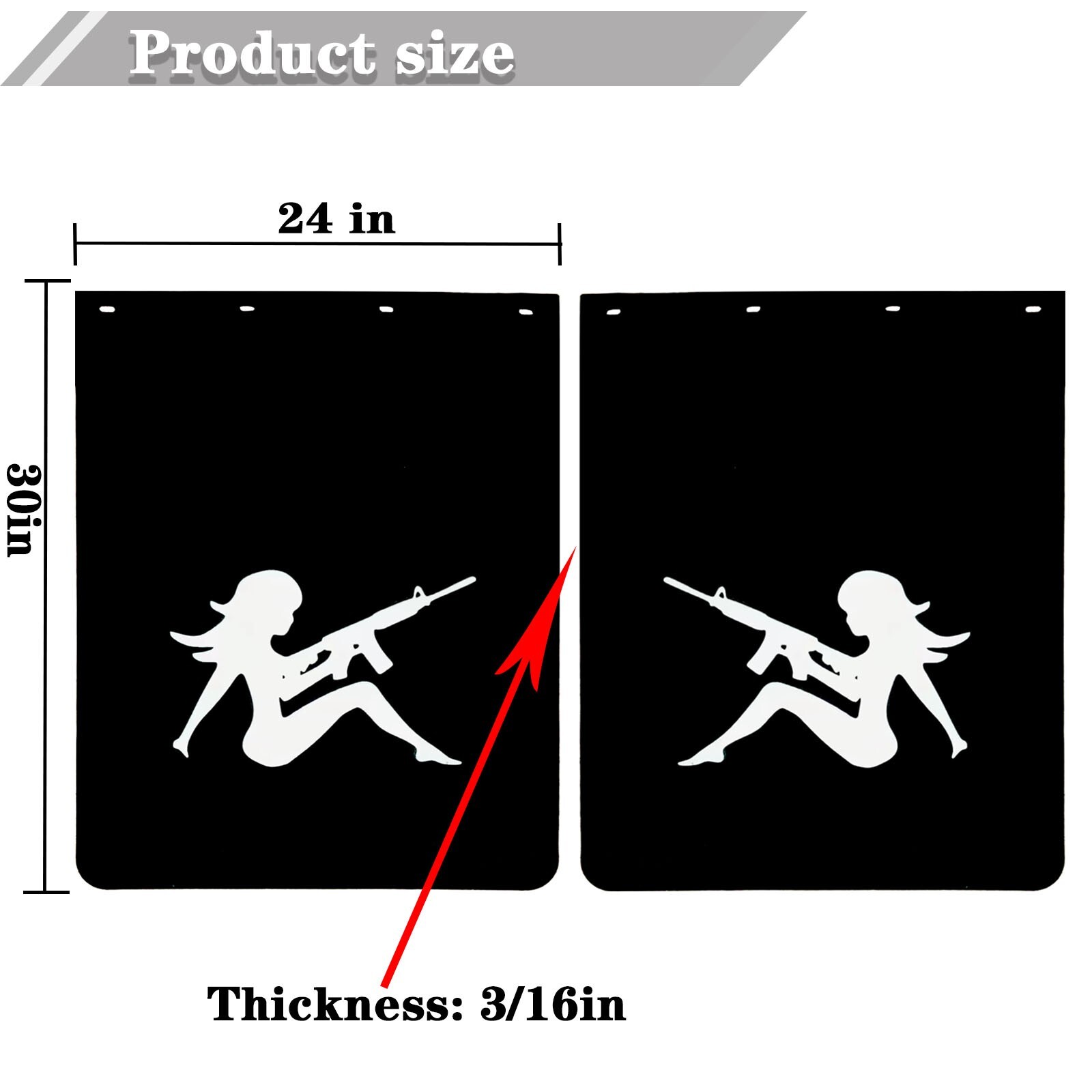 Is it important to have mud flaps on the truck? Mud flaps can keep the driver and other drivers safe on the road.The rocks, water, mud, and sand on the surface of roads can fly off the wheel and cause damage to your vehicle or to other vehicles on the road. The mud flap deflects these particles so that they do not fly off to other cars on the road and cause accidents,especially at high speeds. Mud flaps can protect your vehicle. The mud flaps can ensure the frame and undercarriage from road salt, grime and other debris that causes rust and corrosion. When you protect the mechanical parts of your truck from chemical and mud damage, you enhance their longevity. Our Mud Flaps Conidtion: 100% New in Box Size: 24 in x30 in Material: Polyethylene Installation: The mud flaps have pre-drilled holes to fit any mud flap hanger. Anti-spary Design: The back of the mud flaps has a unique long groove, which can effectively buffer rain erosion and the impact of mud and gravel. Package Included: 2 Pcs of Mud Flaps 24"x30" Shipment: All items will be shipped out in 1 to 3 Business Days after your payment is verified. Standard Shipping will take 1 to 5 business days. Customizable: We accept customization. You can personalize the size, colors, writings, pattern, and material of the mud flap. You can add a logo, the name of the business to the mud flaps. Then your mud flaps will stand out, unique and can help sell your product to people. The customization should meet with our MOQ. More details, please aks us freely.