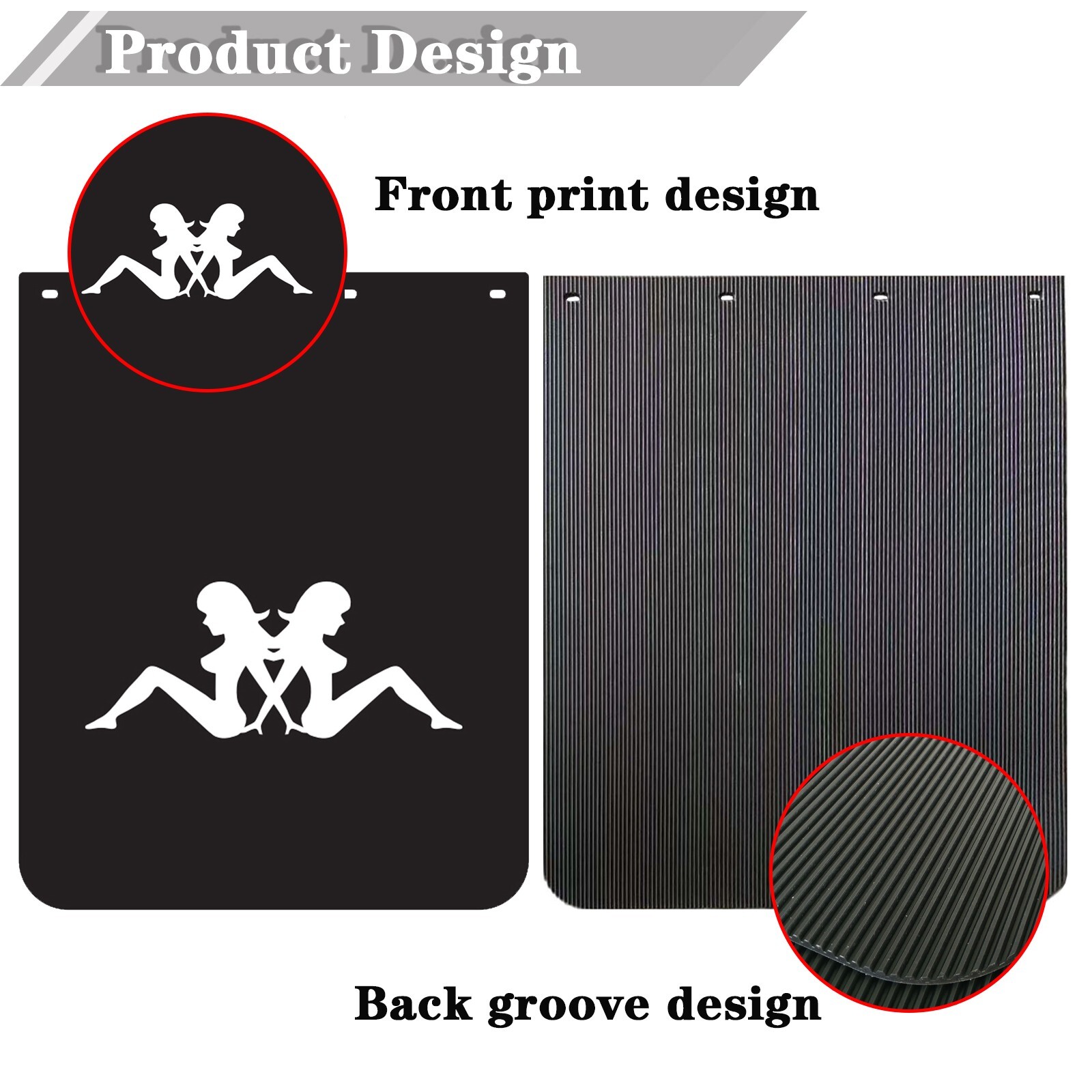 【Specifications】 Size: 24"x30"(WxL) ,Thickness:3/16" Please measure the length of your truck before ordering. Color:Black. Material: Rubber and PE. Package: 2 PCS Mud Flaps included,please use it as a complete set. Material Mudflaps made of 3/16" high-strength Rubber and PE, wear-resistant and durable .Not easy to break, excellent resistance to deformation, not easy to curl. Design The clear patterns on the front of the mudguards not only adorn the appearance of the car, but aslo graphics are hot stamped and will not wear off.and the back has a unique long groove, which can effectively buffer rain erosion and the impact of mud and gravel. Function Keep the truck body clean and tidy. Prevent soil from splashing on the car body or people, resulting in the body or people not beautiful. It can prevent the soil from splashing on the pull rod and ball head, resulting in premature rust. Reduce wheel noise. Increase truck driving safety. Se rvice Any questions about products and logistics, please email us and we will reply you at the first time.Promise to you the best service. Usually we arrange shippment in 1-2 labor days after order received.