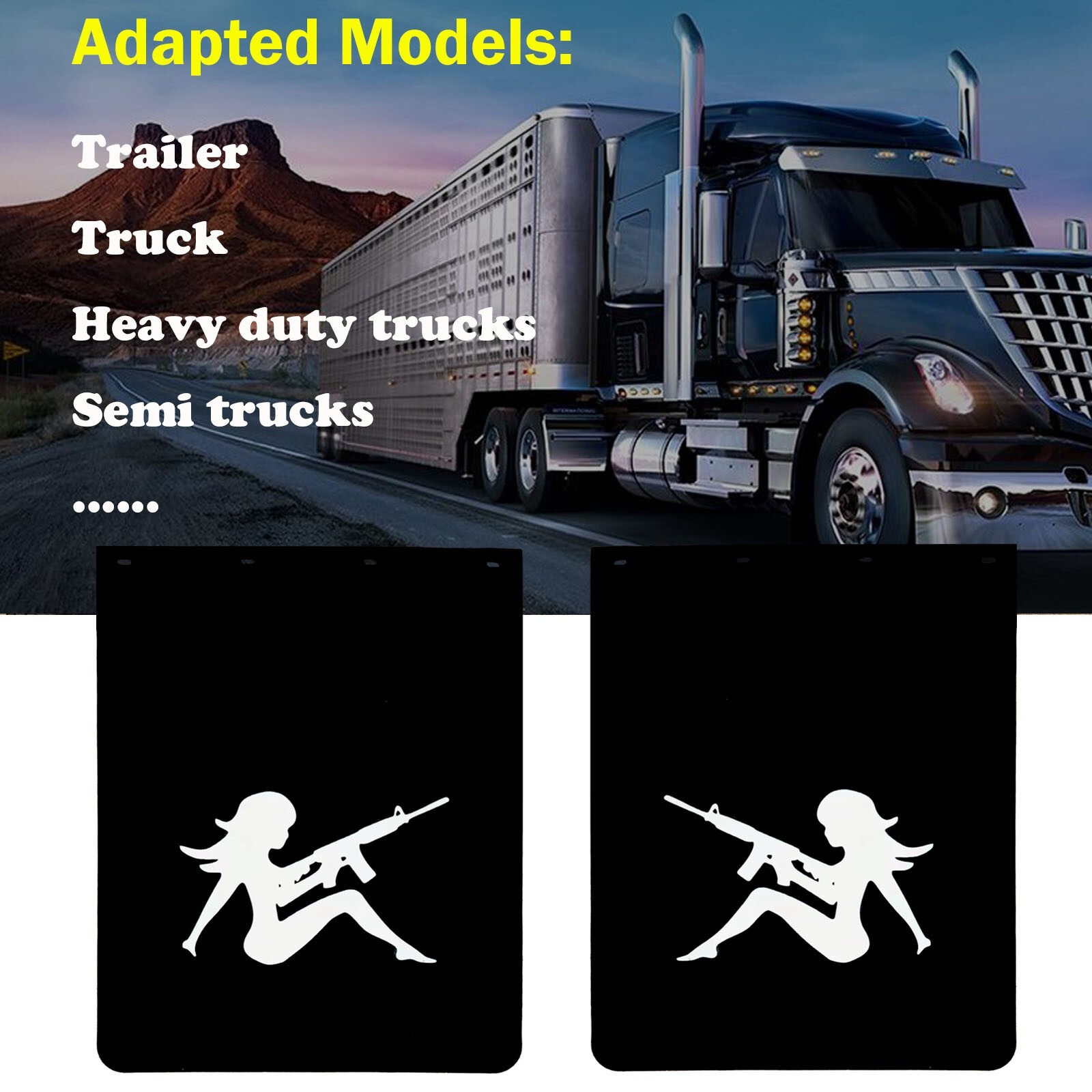 Introduction to the functions of mudguards Safeguard your semi truck and trailer from road debris with these heavy-duty Anti-Splash Truck Mud Flaps. Crafted from durable polymer material, these 24"x30"mudflaps semi truck are designed to withstand the rigors of long-haul trucking. The large size provides ample coverage, protecting your truck's undercarriage and preventing unsightly road grime from accumulating. The handsome and tough truck illustrations on the front well decorate the appearance of the truck, and the back has a unique long groove, which can effectively buffer rain erosion and the impact of mud and gravel. This pair of semi truck mudflaps is easy to install and ensures a smooth, safe ride, even on the roughest terrain. These semi mud flaps are easy to install and built to last, ensuring a smooth and safe ride mile after mile. Keep your rig looking its best and prevent costly damage with this essential truck accessory. Upgrade your semi truck's protection today with these reliable and long-lasting semi mud flaps. Payment All major credit cards are accepted through secure payment processor Ebay payment. Payment must be received within 7 business days of auction closing. Shipping We usually ship within 1-3 business days(Monday- Friday)after receiving cleared payment. We will ship our product from CA or TX United States, and it may takes about 3-10 business days to arrive your place. Returns Change-of-mind return can only be accepted within 7 days after purchase. All other returns can be accepted in 30 days. Contacts us And our Office is closed on weekends and public holidays. We apologize for the late reply during the holidays.