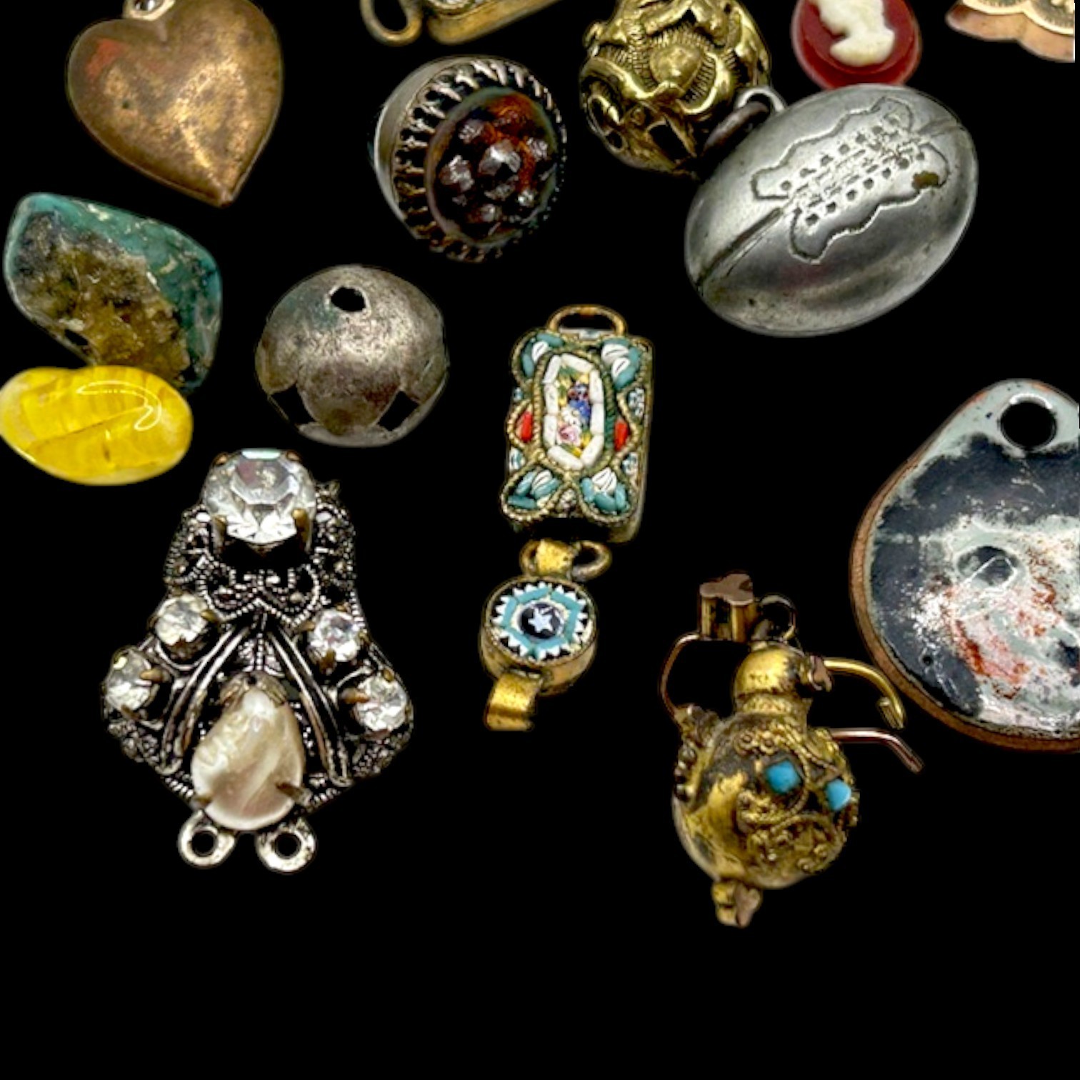 This collection of old charms and tiny misc. old old bits and bobs include over 25 pieces.Perfect for jewelry making and crafts, these tiny charms add a unique and nostalgic touch to any project. Whether you're creating bracelets, necklaces, or earrings, these mosaic charms offer endless possibilities for personalized and handmade accessories. Fun pieces to mention: Jestor Johnson ice skate pin, silver filigree Turkish slipper, tiny pair of jet heart earrings with a cross in the middle, a tiny gold Turkish orb with tiniest turquois beads, nothing has been tested, just a tiny treasure trove of beautifully made miniatures. Esoteric vintage collection of fobs, droplets, and tiny irresistibles compose this fun and whimsical collection so that a most creative person can make new fabulous upcycled pieces to wear and be proud. This one-of-a-kind collection is perfect for anyone who appreciates artistry and craftsmanship, and the courage to buck the trend of ho hum minimalism.
