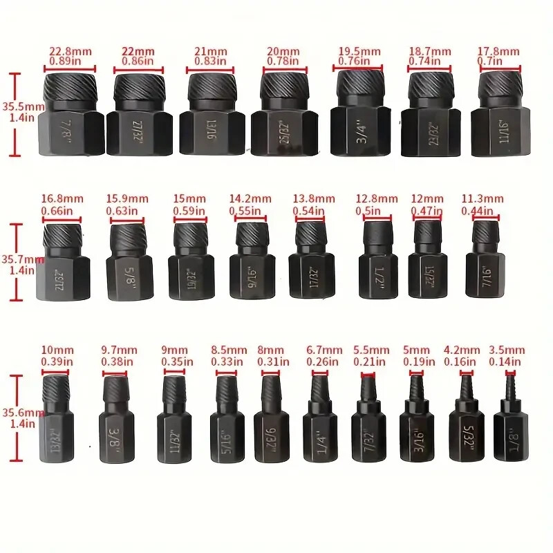 Features: [Extremely High Quality]: Premium chrome molybdenum steel industrial grade extractors are ideal for removing broken screws, bolts, nuts, studs, fittings, threaded pipes and pins and is perfect for any mechanic’s tool kit. [Precision]: Precisely machined aggressive multiplane teeth with left hand spiral design provides extra gripping power and faster threading. [Convenient and Safe, Easy to Operate]: High-visibility size markings on each extractor for quick selection of the right drill bit for extraction applications. [Unique and Simple Design]: Specially designed hexagon head for applying maximum torque with sockets and wrenches Specification: Brand: Unbranded Item Type: Screw Extractor Material: Steel Color: Black Set or Single Item: Set Number of Items in Set: 25Pcs Drive: Electrical Suitable For: Drill, Drywall Compound, Grout Application: Grinding and Cutting, Mixing, Grinding/Sanding, Cutting Condition: 100% Brand New Packing List: 1/8"(M3.5), 5/32"(M4), 3/16"(M5), 7/32"(M5.5), 1/4"(M6.5), 9/32"(M7.5), 5/16"(M8), 11/32"(M9), 3/8"(M10), 13/32"(M11), 7/16"(M11.5), 15/32"(M12), 1/2"(M13), 17/32"(M14), 9/16"(M14.5), 19/32"(M15.5), 5/8"(M16), 21/32"(M17), 11/16"(M18), 23/32"(M18.5), 3/4"(M19.5), 25/32"(M20), 13/16"(M21), 27/32"(M22), 7/8"(M23) How to Use It: Step 1: Select a drill bit that is smaller diameter than the screw or fastener to drill a whole aligned straight with the screw. Step 2: Insert the screw extractor clockwise into the bored whole of your stuck fastener until snug. Step 3: With a ratchet or wrench turn counterclockwise to remove the stuck fastener. Payment Serious bidding, please. Orders will be cancelled and an unpaid item dispute will be filled if payment is not received within 10 days after purchase. Shiping We will ship your order within 24 hours after receiving your verified payment (Excluding Weekends and Public Holidays) The estimated delivery time is within 3-7 working days (not including the weekend). United States:2-5 working days (not including the weekend) Before you pay, please make sure your address matches the address you would like us to ship to. Term Of Sales •We agree to return the goods and make a refund within thirty days, Return items must not be used or have any sign of abuse or intentional damage. •Buyer is responsible for all return shipping charges. •We reserve the right not to refund S&H when the item has been posted.