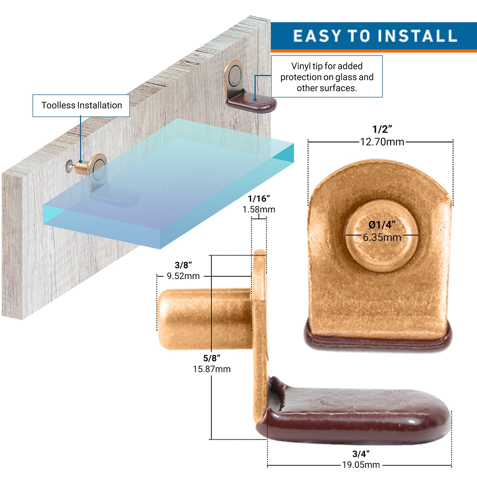 The L-Shaped glass shelf support pegs have an antique copper finish. Furniture cabinet closet shelf bracket pegs with vinyl tip fit into any predrilled 1/4" (6.35mm) holes. Glass cabinet shelving partition made easy with the help of Hardware 1/4" (6.35mm) L-Shaped Glass Support Furniture Cabinet Closet Shelf Bracket Pegs. These vinyl tip shelf pegs/pins are 3/4" (19.05mm) in length and are used to support a shelf in place on any cabinetry projects with 1/4" (6.35mm) shelf holes. Ideal for cabinets, entertainment centers, bookcases shelf, and more. The stylish spoon shape design is durable and guaranteed to stand the test of time. Installation is a breeze, no need for tools, you can assign or change cabinet partitions by hand. Comes in a super-saver pack in variations of 25, 50, & 100 pieces. FUNCTION: Cabinet shelf pins are hardware accessory that is used to support a shelf or glass support in place. These shelving tabs would come in handy with any DIY shelving projects with 1/4" (6.35mm) shelf holes. MATERIAL: These shelve bracket pegs are 3/4" (19.05mm) in length. L-Shaped bracket-style glass shelf support, the surface is with a brown vinyl tip for added protection on the glass and other surfaces, anti-corrosion property in antique copper finish. APPLICATIONS: Widely used by furniture makers to support shelves on kitchen cabinets, glass shelves, wardrobes, bookcases, closets, pantries, entertainment centers, and more. INSTALLATION: These bracket support pegs for furniture shelves are easy to install by hand, with no need for screwdrivers. Simply insert the pin into 1/4" (6.35mm) shelf holes. VARIATION: This durable L-Shaped Glass Support for cabinet shelves comes in a super-saver pack in variations of 25, 50, & 100 pieces.