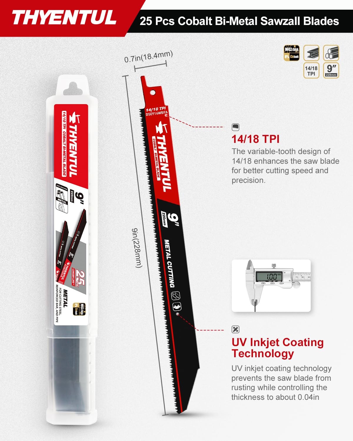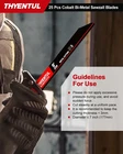 THYENTUL 25-Pack of 9-inch 14/18TPI Reciprocating Saw Blades for Metal Cutting; packaged in a box of 25 with UV new technology coating, convenient plastic box for easy access. 【Product Specifications】 25-Pack of 9-inch 14/18TPI Reciprocating Saw Blades for Metal Cutting;Blade thickness 0.037 in, packaged in a box of 25 with UV new technology coating, convenient plastic box for easy access. 【Premium Materials】 Tailored for real-world scenarios, the 25-piece reciprocating saw blades feature M42 metal with 8% cobalt for the teeth and D6A metal for the blade body. This robust combination not only delivers outstanding performance but also offers a higher cost-effectiveness,A good replacement for Diablo and Milwaukee saw blades 【Versatile Applications】 Ideal for cutting medium-thick metal sheets ranging from 0.1 to 0.125 inches (3 millimeters), these reciprocating saw blades are suitable for cutting steel, pipes, vehicle bodies, stainless steel, cast iron,stud,nails, and water pipes,A must-have tool for various cutting needs. 【Extending Service Life】 Incorporating a new heat treatment process significantly enhances wear resistance and heat resistance, minimizing the likelihood of sudden breakage during usage,This improvement contributes to extending the lifespan of the blade. 【Universal Shank】 The 1/2-inch shank is compatible with mainstream Sawzall tools on the market, including Dewalt, Bosch, Milwaukee, Makita, Black & Decker, Ryobi, and more.
