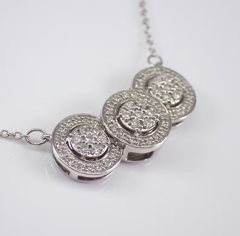 BRAND NEW shiny diamonds. The craftsmanship of this pendant is amazing, WHITE GOLD over silver, the diamonds are sparkly, the item came in the mail in a generic jewelry box and came with an extra chain that is perfect with the pendant because of the weight. Overall I’m satisfied with this item, the vendor is a great communicator, fast shipper and I will definitely buy again. JUST MAKE SURE ASK ASK ASK ASK QUESTIONS.