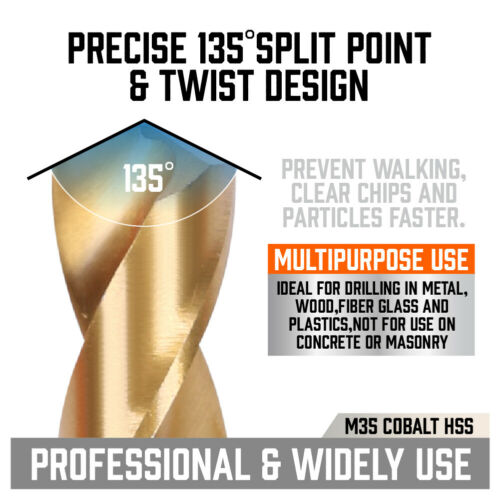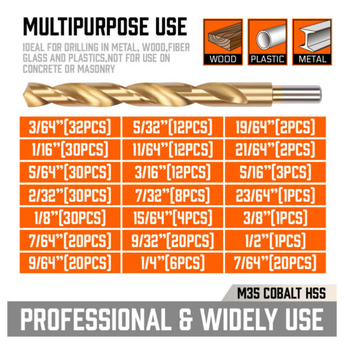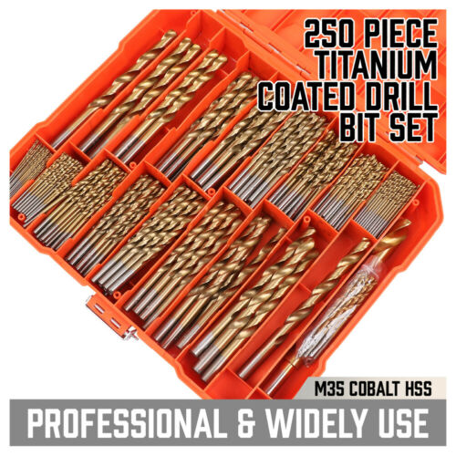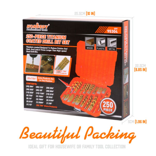 Product Overview 250PCs Drill Bits Set 3/64"- 1/2" HSS Titanium Twist Wood Metal Plastic W/ Case Detail TITANIUM COATING - Designed to prevent rusting, which increase the hardness of the drill bit and reduces heat buildup, make the twist drill bit more wear-resisting, and lasts 6 times longer than common high-speed steel drill bits. WIDELY USED: The 135° fast cutting point is automatically centered and penetrates quickly with less pressure, the drill kit meets all your requirements, including all common size specifications for metal, wood, fiber glass and plastics etc, not for use on concrete or masonry. It is your ideal choice for DIY projects and household maintenance and repair. WELL ORGANIZED & EXQUISITE PACKAGING - In the heavy-duty plastic storage case, all sizes are indexed on tray to keep all components organized, with sponge cushion between the upper and lower halves to avoid the drill bits straggling and mixing. 250-PIECES (Extra 20Pcs 7/64") SIZE INCLUDES: 3/64" (32Pcs), 1/16" (30Pcs), 5/64" (30Pcs), 3/32" (30Pcs), 1/8" (20Pcs), 7/64" (20Pcs), 9/64" (20Pcs), 5/32" (12Pcs), 11/64" (12Pcs), 3/16" (12Pcs), 7/32" (8Pcs), 15/64" (4Pcs), 1/4" (6Pcs), 9/32" (4Pcs), 19/64" (2Pcs), 5/16" (3Pcs), 21/64" (2Pcs), 23/64" (1Pc), 3/8" (1Pc), 1/2" (1Pc) BETTER THAN BEST - Whether you buy it for your own use or as a gift, this set of products will solve at least one of your worries, because we never carelessly make tools. Choose it and you can always trust it. If you have any question or advice,Please feel free to contact us. We will solve your problems in time. Safety Notice Read and understand power tool manual. Wear ANSI-compliant eye and respiratory protection. DO NOT use drill bit if cracked or damaged. Only apply pressure in line with the bit. In the process of use, excessive force may lead to the fracture of the drill bit. Please do not use too much force Shipping Policy Returns Policy Warranty Payment About Feedback Shipping Policy Ship within global. Items are generally dispatched from our USA local warehouse within 1 business days after payment is cleared however please allow approximately 2 - 6 business days for it to arrive in domestic. International shipping time depends on the country.Buyers will be able to trace the delivery online with a tracking number. Some of our large items sell with different freight costs. Please email us through the listing with your Post code and Suburb Name to inquire the postage. Also Large items are not able to oost to PO BOX address due to weight & size. Buyers have the full responsibility to provide us with the correct delivery address and mobile phone number on the ebays checkout page before payment. Any changes to address after checkout will not be considered as valid. Returns Policy 1. Customer satisfaction is our top goal. We believe our items are so outstanding. All products are quality checked. They are new and in good condition when shipped to our customers. We are convinced you will be happy with your Purchase. 2. If product is defective or damage upon arrival, or wrong product shipped, please contact us immediately. Returns accepted within 60 days of delivery date and item must be in original new condition, not worn or altered in any way with attached tags & wrap. Otherwise deal is final. 3. Please contact us first if you have any problems/questions/concerns. We will be happy to resolve any issues you may have in a cordial and friendly manner. 4. We appreciate your Postive Feedback, and will do the same in return. DO NOT leave negative feedback without first communication with us. Please allow max 2 business days for us to response. Warranty There is 12 month warranty on all our products starting from the date of purchase. When products are used for commercial purposes, they qualify for a 3 month warranty. All warranty claims must be directed through Customer Service. Please do not return or post items before obtaining instructions from Customer Service - if you do, there is a risk that your returned item may not be identifiable and your claim may not be accepted. Payment We require immediate payment. For your convenience, We accept all major credit cards through PayPal checkout. Customers please note: You do not have to have PayPal account to pay for an item. When eBay direct you to the PayPal payment page, you will be able to insert only the credit card info. Please make sure your Paypal Account is verified before paying with Paypal. Otherwise your payment will come through as an eCheque which may take 3-5 days to clear in our Paypal account. We will only process your order once payment has been confirmed in our account. Please check with Paypal to find out how to verify your account. About Feedback When you satisfied with our product and services please leave us positive feedback. If a problem occurs, contact us immediately with any email request. Just contact us using the " Ask the seller a question" link on eBay.