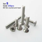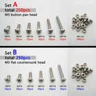 There are 250pcs assortment kit 304 stainless steel Metric Thread M2 M3 Phillips pan head/flat head screws and nuts Package: Set A M3 phillips pan head M3*6, M3*8, M3*10, M3*12, M3*16, M3*20 each size 25pcs + M3 nut 100pcs =total 250pcs Set B M3 phillips flat countersunk head M3*6, M3*8, M3*10, M3*12, M3*16, M3*20 each size 25pcs + M3 nut 100pcs =total 250pcs Set C M2 phillips pan head M2*6, M2*8, M2*10, M2*12, M2*16, M2*20 each size 25pcs + M2 nut 100pcs =total 250pcs Set D M2 phillips flat countersunk head M2*6, M2*8, M2*10, M2*12, M2*16, M2*20 each size 25pcs + M2 nut 100pcs =total 250pcs Description: Material: 304 stainless steel Screw size: D(thread diameter) x L(length) Metric thread diameter:M3(3mm) / M2 (2mm) Metric thread pitch: 0.5mm(M3) / 0.4mm(M2) On Dec 14, 2024 at 19:11:31 PST, seller added the following information: