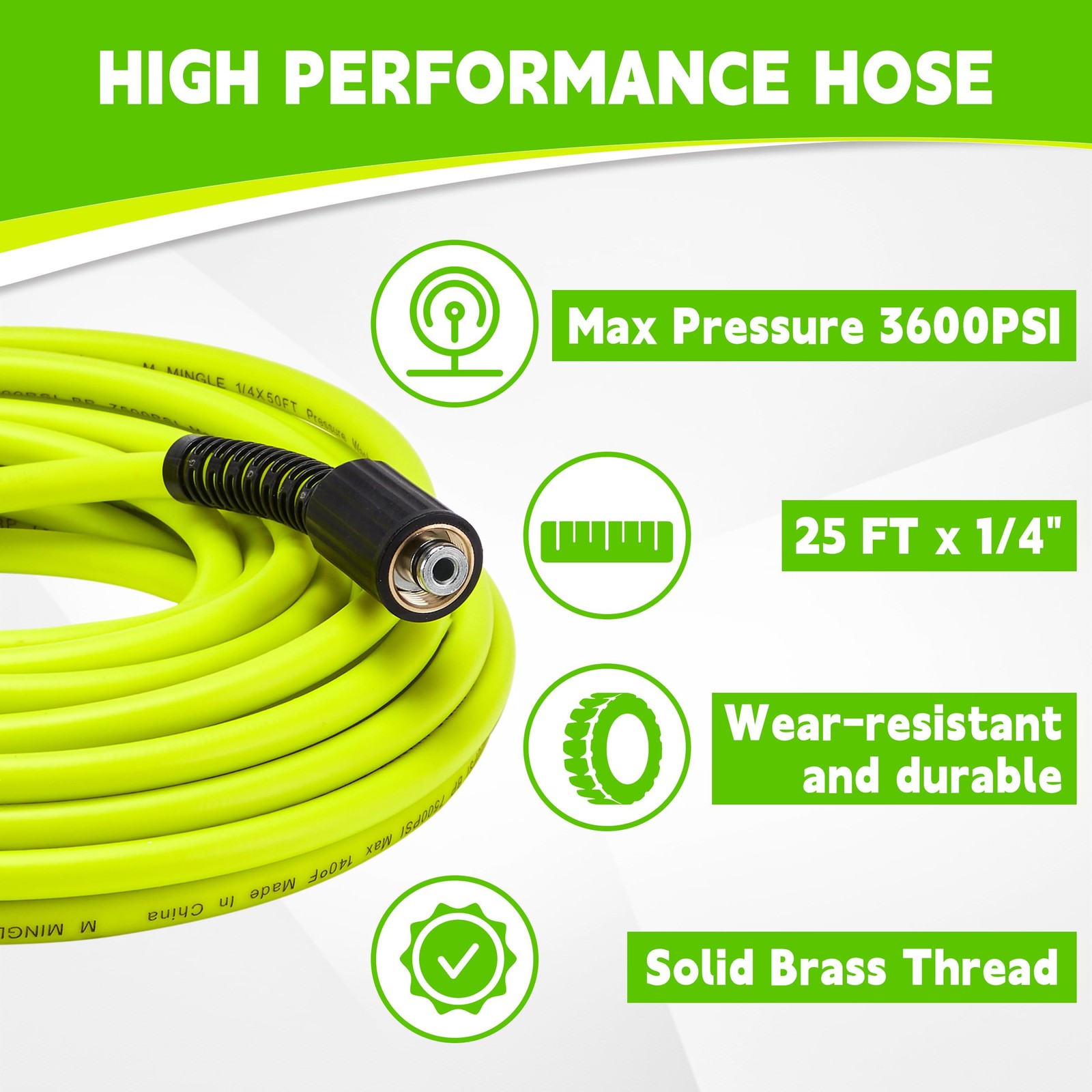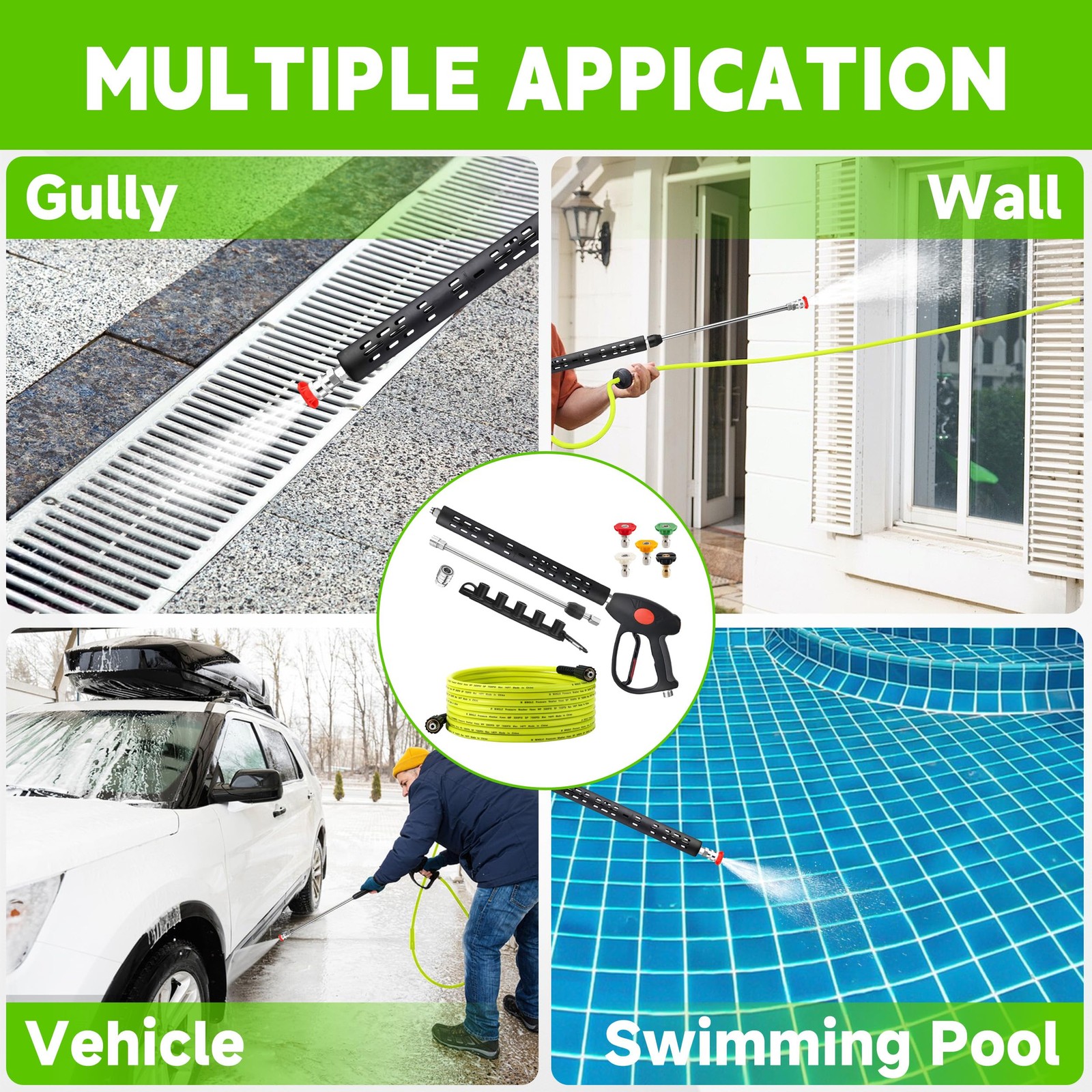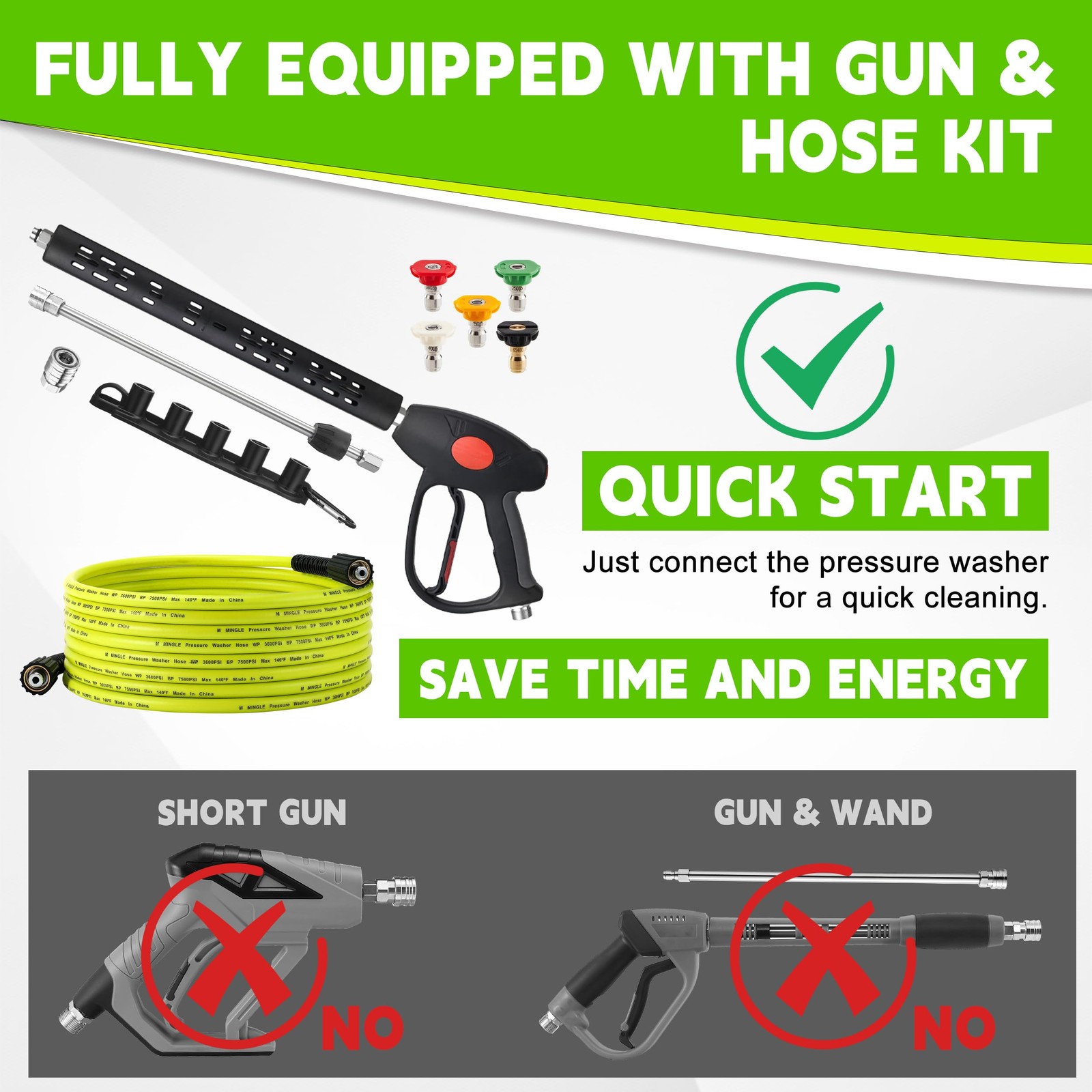 Description: Introducing our all - inclusive high - pressure cleaning kit, featuring a high - pressure washer nozzle, pressure washer hose, and a pressure washer gun. Every component is meticulously selected and perfectly matched, eliminating the common frustration of ill - fitting parts. Gone are the days of wasting hours trying to find a compatible hose for your gun or vice versa, only to end up spending extra money on replacements. With our kit, you can bid farewell to such time - consuming and costly ordeals. Setting it up is a breeze. Just connect this integrated set to your high - pressure cleaner, and you're good to start cleaning right away. It's an ultra - efficient solution that slashes the time and effort usually required for setup, allowing you to focus more on the task at hand and less on the hassle of assembling components. Save your precious time and energy for what truly matters. Grab this time - saving, labor - saving, and money - saving kit now! This pressure washer gun and hose come as a complete set, including 5 Spray Nozzle Tips, a pressure washer hose, and a pressure washing gun. Every component is perfectly matched, Say goodbye to the headache of ill-fitting parts. Setting it up is a breeze. Just connect this power washer hose and gun to your pressure washer, and you're good to start cleaning right away. It's an ultra-efficient solution that slashes the time and effort usually required for setup, allowing you to focus more on the task at hand and less on the hassle of assembling components. Made of reinforced materials and high-quality stainless steel, our pressure washer gun with hose ensures long - lasting use. Its adjustable extension wand can be disassembled or extended to 3 lengths, giving you the flexibility to handle various cleaning jobs easily. The pressure washer hose 25 ft is made from premium-quality, durable, weather and abrasion-resistant material. It is easy to carry, drag, and roll up. It is non-marking and not easily kinked. The power washer gun and hose kit is designed for household cleaning and commercial use. Compatible with Karcher, Troy Bilt, Ryobi, Honda, Simpson, Generac, Craftsman, Green Work, Briggs and Stratton, Dewalt and most brand power washers. ATTENTION: NOT FIT M22 15mm fitting.
