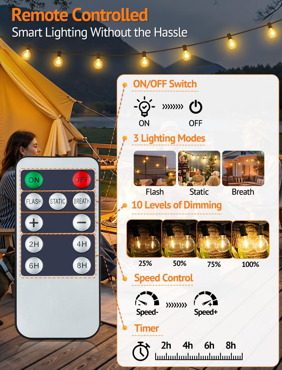 Store New Arrivals Add to Favorite View Feedback Contact 25FT Solar String Lights Outdoor with Remote, Waterproof Dimmable 3 Modes Patio Lights with 10+1 LED Shatterproof G40 Bulbs for Backyard-Black Description Item model number GLS-18J2P-G40-25 Light Source Type LED Style Antique Number of Items 1 Power Source Solar Powered Number of Light Sources 10 Control Method Remote Light Direction Adjustable Theme Beach, Christmas, Lantern, Space, Thanksgiving Controller Type Remote Control Batteries Required? No Bulb Shape Size G40 Material Plastic Seasons All Seasons Package Dimensions 9.33 x 5.71 x 4.49 inches Included Components 1 x 25FT Solar Outdoor String Light Black Cord, 1 x Remote, 1 x Solar Panel with Clip & Stake & Charging Cable, 1 x User Guide, 11 x E12 Base G40 LED Bulbs (1 Spare) Item Package Quantity 1 Bulb Features Dimmable Indoor/Outdoor Usage Outdoor Bulb Base E12 Light Color Yellow Water Resistance Level Waterproof Item Weight 1.34 pounds Occasion Anniversary, Birthday, Engagement, Housewarming, Seasons, Wedding Special Features Automatic On-Off, Blinking, Dimmable, Remote Controlled, Timer Special Feature Automatic On-Off, Blinking, Dimmable, Remote Controlled, Timer Part Number LKF-SL08-SG40-25FT-1 Color Temperature 2700 Kelvin Color Black Larkvue 25FT Solar String Lights: Transform your space into a magical oasis with our lights. Featuring 11 G40 LED bulbs (1 spare), our lights deliver a 2700K warm white glow perfect for creating a cozy, inviting atmosphere in garden, patio. The 2ft spacing between bulbs ensures dense, radiant coverage without dark spots, while the 6ft lead wire from the solar panel to the first bulb provide unmatched flexibility for installation in tricky areas (e.g., under shaded roofs or wrapped around trees) IP65 Waterproof & Shatterproof Bulb - Built to Last: Designed for outdoor use, our lights feature IP65-rated waterproofing to withstand rain, snow, and dust, along with unbreakable plastic G40 bulbs that resist cracks and fading. Unlike fragile glass bulbs, our shatterproof design ensures safety around children, pets, or high-traffic areas like pool party, backyard BBQ, or holiday gathering. The durable copper wiring adds flexibility for wrapping around railing, fence, or pergola without fraying Dusk to Dawn Auto ON/OFF Solar Outdoor String Light with Remote: Take full command of your lighting experience with 3 modes (Stactic/Flash/Breath) and 4 programmable timers (2H/4H/6H/8H). The built-in memory function will remember your last-used setting, so you never waste time reconfiguring the lights. For personalized brightness, we prepare dimmer for you, just adjust brightness by remote control from 0% (off) to 100% (vivid warm glow)-perfect for setting a romantic mood and highlighting decor Solar Powered + USB Dual Charging - Never Run Out of Light: Say goodbye to expensive electricity! Our high-capacity solar panel harnesses sunlight for 6-8 hours of charging, powering the lights for up to 8 hours nightly (adjustable via timer). For cloudy days or indoor use, the removable solar panel can charge by USB port and enjoy uninterrupted lighting. Our dual-power innovation ensures reliability in all seasons, making these lights ideal for camping trips, rainy climates, or winter holidays Hassle-Free Installation & Perfect for Every Occasion: Set up in minutes with no tools, outlets, or electrical expertise required! By opting for solar energy, you’ll slash energy costs. Whether you’re hosting a summer wedding, decorating for Christmas, or adding charm to a balcony, these lights adapt to any scene. Their warm white hue complements rustic, modern, or bohemian aesthetics. What’s Included: 25ft lights with 10+1 bulbs, solar panel, charging cable, ground stake+clip, remote and manual Warm Tips: After fully charging, make sure there is no light source on the panel, press the “on/off” button on the back of the panel before use! Our solar panel has a built-in light sensor that the light will auto turns on at night and off at dawn. There's a preset timing of the solar string lights (6H auto off) to saving energy and protect the battery life better. In continuous cloudy or rainy days, it still has power to provide light for your patio and yard. The connection between the solar panel and the light string must be tightly connected and then the tighten fixing ring, otherwise moving the solar panel will result in a less stable battery power supply to the light string Product Description Larkvue 25 Feet G40 LED Bulbs Hanging Solar String Lights - Create great ambience for your patio and outdoor spaces! Rain or shine, enjoy warm glow from dusk to dawn! Harness the Sun’s Power – Zero Effort Required 5-6 hours on "Static" and 8-10 hours on "Flash" and "Breath" modes after just 4-8 hours of daytime full charging. The built-in solar panel intelligently converts sunlight into energy - no manual switches or timers needed. Just position the panel in direct sunlight, and let nature handle the rest. Say Goodbye to Fumbling for Switches in the Dark Our solar string lights feature an intelligent auto dusk-to-dawn sensor that automatically activates your lights at sunset and powers them down at sunrise - no manual intervention required. Automatically lit spaces deter tripping hazards and unwanted visitors, offering peace of mind every evening. Dimmable 3 Modes 4 Timers Auto On Off Solar String Light with Remote Control Waterproof Shatterproof Solar Power+USB Charging Easy Installation String Light Enery-saving 25FT G40 Solar String Light with 6FT Additional Solar Panel Wire 25Ft 10 Sockets G40 Bulb Solar String Lights Transform your spaces with Larkvue’s 25ft solar-powered Edison string lights Package including: 1 x 25FT Solar Outdoor String Light Black Cord, 11 x E12 Base G40 LED Bulbs (1 Spare), 1 x Solar Panel with Clip & Stake & Charging Cable, 1 x User Guide, 1 x Remote 2FT bulb spacing: Perfect for draping over large patios, fences, or pergolas without overcrowdin