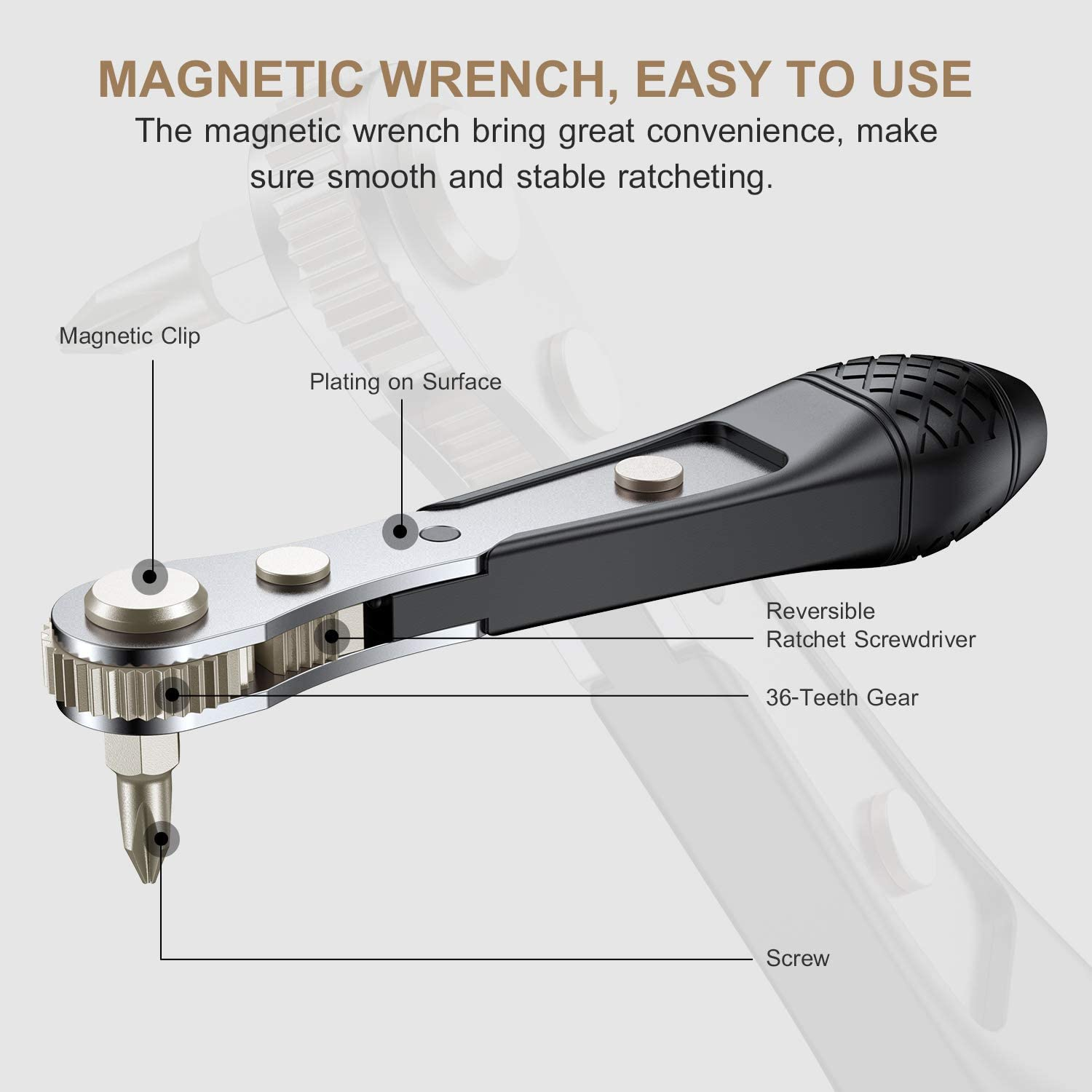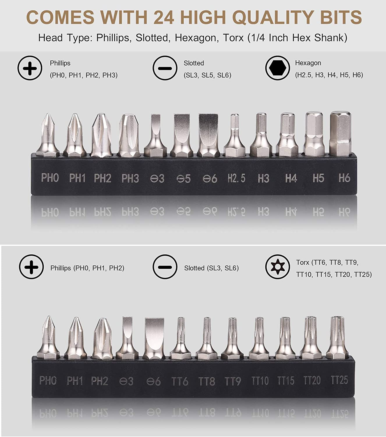 ✓【Perfect for Confined Space Operation 】The mini ratchet wrench screwdriver is small and light enough for operation in confined places where the traditional screwdrivers might be too long to fit. Especially in awkward places like U shape corner, lateral surface, and other tight spaces. The comfortable non-slip grip provides excellent handling. ✓【High-Quality Ratchet Wrench】The ratchet wrench (4.3" long) is powered with a 36-teeth reversible ratchet system to ensure smooth ratcheting in both directions. High-quality teeth provide high torque resistance and precise adjustment compared to 12-teeth or 16-teeth ratchet. Simply flip the spin button to change direction for tightening or loosening screws. Holders on the head and bottom of the wrench are strongly magnetized for holding the bits. No worries for bit drops. ✓【High-Quality S2 Steel Bits】The screwdriver bits are made of high-quality S2 steel, hardness reaching HRC60+/-. CNC machined and magnetized bits ensure precise fit, reducing wobbling. ✓ 【Daily-Range Bit Set】2x Phillips(PH0, PH1, PH2), 1x Phillips(PH3), 2x Slotted(SL3, SL6), 1x Slotted(SL5), 1x Hexagon(H2.5, H3, H4, H5, H6), 1x Temper-Proof Torx(TT6, TT8, TT9, TT10, TT15, TT20, TT25). Compatible with 1/4" socket, drill, etc. ✓ 【Wide Application】Suitable for domestic appliances, furniture, automotive, industrial use, computers, electronics repair, hobbies, toys and crafts, DIY home improvement project, etc. Bits also fit for any 1/4" hex shank screwdriver or extension bit holder for power tools. Product Description Package Content Package Content 1 x 36-Tooth Magnetic Ratchet Wrench (4.3" long and 0.4" thick) 24 x 1/4'' Drive Bits GreaTalent 25in1 S2 Steel Mini Ratchet Wrench Old Specifications Head Type: Phillips, Slotted, Torx, Hexagon Shank: 1/4 inch Hex Shank Bit Length: 1inch / 25mm Hardness: HRC60+/- Material: S2 High Hardness Steel Bit Set Phillips 2x PH0, 2x PH1, 2x PH2, PH3 Slotted 2x SL3, SL5, 2x SL6 Hexagon H2.5, H3, H4, H5, H6 Temper-Proof Torx TT6, TT8, TT9, TT10, TT15, TT20, Torx TT25