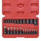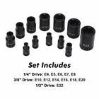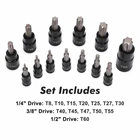 Set Include: 13 Star Socket Bits T: 1/4" Drive: T8, T10, T15, T20, T25, T27, T30; 3/8" Drive: T40, T45, T47, T50, T55; 1/2" Drive: T60 12 Female E-Torx Sockets E: 1/4" Drive: E4, E5, E6, E7, E8; 3/8” Drive: E10, E12, E14, E16, E18, E20 1/2” Drive: E22 25 Piece Torx Bit Socket and Female External Socket Set, 13 Star Socket Bits (T8- T60)& 12 Female E-Torx Sockets (E4-E22) Description The set is made from Heavy-duty Chrome-Vanadium steel alloy (50BV30) and S2 with a corrosion-resistant black phosphate finish, providing the durability for a hard use. The socket is High-contrast laser etched with high-visibility markings and hard stamped with size labels. Quality Heat Treated S2 Alloy Steel Torx Bits Heat Treated CR-V Sockets with Corrosion-resistant black phosphate finish Permanent high visibility laser etched size marking Come with a heavy duty blow molded storage case, easy to carry