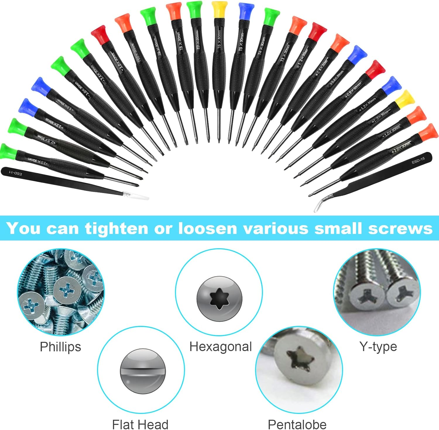 Store New Arrivals Add to Favorite View Feedback Contact Precision Screwdriver Set, 25 PCS Small Screwdriver Set Magnetic, with Torx Flathead Phillips Star Pentalobe Y Screwdrivers, ESD Tweezers for Eyeglass Watchmaker Computer PC Electronic Laptop Jewelers Description Batteries Required? No Number of Items 25 Color Red, Silver, Blue, Yellow, Black, Orange, Green Brand TEELLA Material Alloy Steel Country of Origin China Head Style Flat, Pentalobe, Phillips, Swivel, Torx Item Weight 10.2 ounces Batteries Included? No Head Size 1.2 inch Model Name Torx Screwdriver Set Recommended Uses For Product Electronics Item, Watch, Eyewear Special Features Magnetic Tip Special Feature Magnetic Tip Package Dimensions 8.58 x 6.42 x 0.83 inches Manufacturer TEELLA What Will You Get ? : A nice gift, our 25 pcs precision screwdriver set includes: 8 pcs torx screwdriver set T3 T4 T5 T6 T7 T8 T9 T10, 6 pcs flat head screwdriver 1.0mm 1.2mm 1.5mm 2.0mm 2.4mm 3.0mm, 6 pcs phillips screwdriver 0.8mm 1.2mm 1.5mm 2.0mm 2.5mm 3.0mm, 2 pcs star pentalobe screwdriver P2 P5, 1 pcs Y screwdriver 0.6Y, 2 pcs ESD tweezers ESD11 ESD15, a perfect kit for your daily repairs Saving Your Money And Safety: Use this professional tiny screwdriver set to repair yourself personal devices, glasses, watches, etc, at home, protect your privacy from strangers, you don't have to look for repair centers, this mini screwdriver set contains most screwdrivers, such as torx security screwdriver set, flathead screwdrivers, phillips head screwdriver, star screwdriver set, y screwdriver set, ESD tweezers, fit different screws to avoid damaging parts due to incorrect dimensions Outstanding material And Well Designed: Our electronic screwdriver set tip made of chromium-vanadium alloy steel and have been specially treated by the overall high-temperature quenching process, stronger, tougher, more wear-resistant, the handle of the electronics screwdriver set are made of premium PP-TPR material, the handle feels softer and has a better anti-slip effect, swivel end cap Multipurpose Magnetic Screwdriver Set: Repair for different digital products, such as mobile phone, computer, PC, laptop, desktop, cameras, game console, game handle, can also be used as glasses screwdriver, eyeglass screwdriver, watch screwdriver set, jewelry screwdriver set, micro screwdriver set, for IT technician engineer, electronics enthusiast, fixer, hobbyist, DIYer, student, jewelers, watchmaker ect, it is an ideal choice for professionals or families Satisfaction Guaranteed: If there are any problems with our screwdriver set, contact us and we would be very happy to solve your problems We focus on industry grade precision screwdriver set! Repair at home yourself, do not have to go to the repair center. Save your money and protect your privacy from being harmed. This 25-piece screwdriver set, contains most of the screwdrivers. It can make your daily repair become easier and simpler Product Material: This small screwdriver set for electronics made of premium chromium-vanadium alloy steel, stronger, tougher, more wear-resistant The handle of the screwdriver kit are made of premium PP-TPR material, the handle feels softer Scientific Design: 360° Swivel End Cap: Increase speed and efficiency Non-Slip Handle: Fish-scale-shaped surface, anti-slip Magnetic Tip: All the tiny screwdriver are magnetic Product Size: Screwdriver Size: 4.8 inch, screwdriver tip size: 1.2 inch ESD Tweezers Size: ESD11: 5.51 inch, ESD15: 4.76 inch Multifunction Screw Driver Set: You can used to disassembly screws, use it as eyeglasses screwdriver kit, watch screwdriver, computer screwdriver kit, jewelry screwdriver, jewelers screwdriver set, watchmaker screwdriver set. No more hesitation! Try it now! Satisfaction Guaranteed: If there are any problems with our screwdriver set, contact us and we would be very happy to solve your problems Just add to your cart now! Package Includes: 8PCS * Small torx security screwdriver set: T3 T4 T5 T6 T7 T8 T9 T10 6PCS * Small flathead screwdriver set: 1.0mm 1.2mm 1.5mm 2.0mm 2.4mm 3.0mm 6PCS * Small phillips screwdriver set: 0.8mm 1.2mm 1.5mm 2.0mm 2.5mm 3.0mm 2PCS * Small star pentalobe screwdriver set: P2 P5 1PCS * Small Y screwdriver set: 0.6Y 2PCS * ESD tweezers: ESD11 ESD15 ABOUT US We offer the best prices around on high quality products. Our E-store includes media such as books, movies, music and games while offering electronics, toys, sporting apparel, clothing, tools, general home, garden items and more. SHIPPING We are always working hard to ensure your package arrives as soon as possible. Please understand that some factors like weather, high postal traffic, and the performance of shipping companies are outside of our control. We offer free shipping to the lower 48 states and ship within 2 business days of payment, usually sooner. We do not accept P.O. Boxes. Please provide a physical address. RETURNS We offer a 30-Day Return Policy on items which you are not completely satisfied with. You have the option for a full-refund or an exchange of the item. No returns are available on items shipped outside of the USA. PAYMENT We accept PayPal. CONTACT US This page content is yet to come Please ad us to your favorite seller and visit again later Thank You CUSTOMER SATISFACTION We try our very best to make sure every customer is completely satisfied. If there's a problem, message us! We're happy to help.