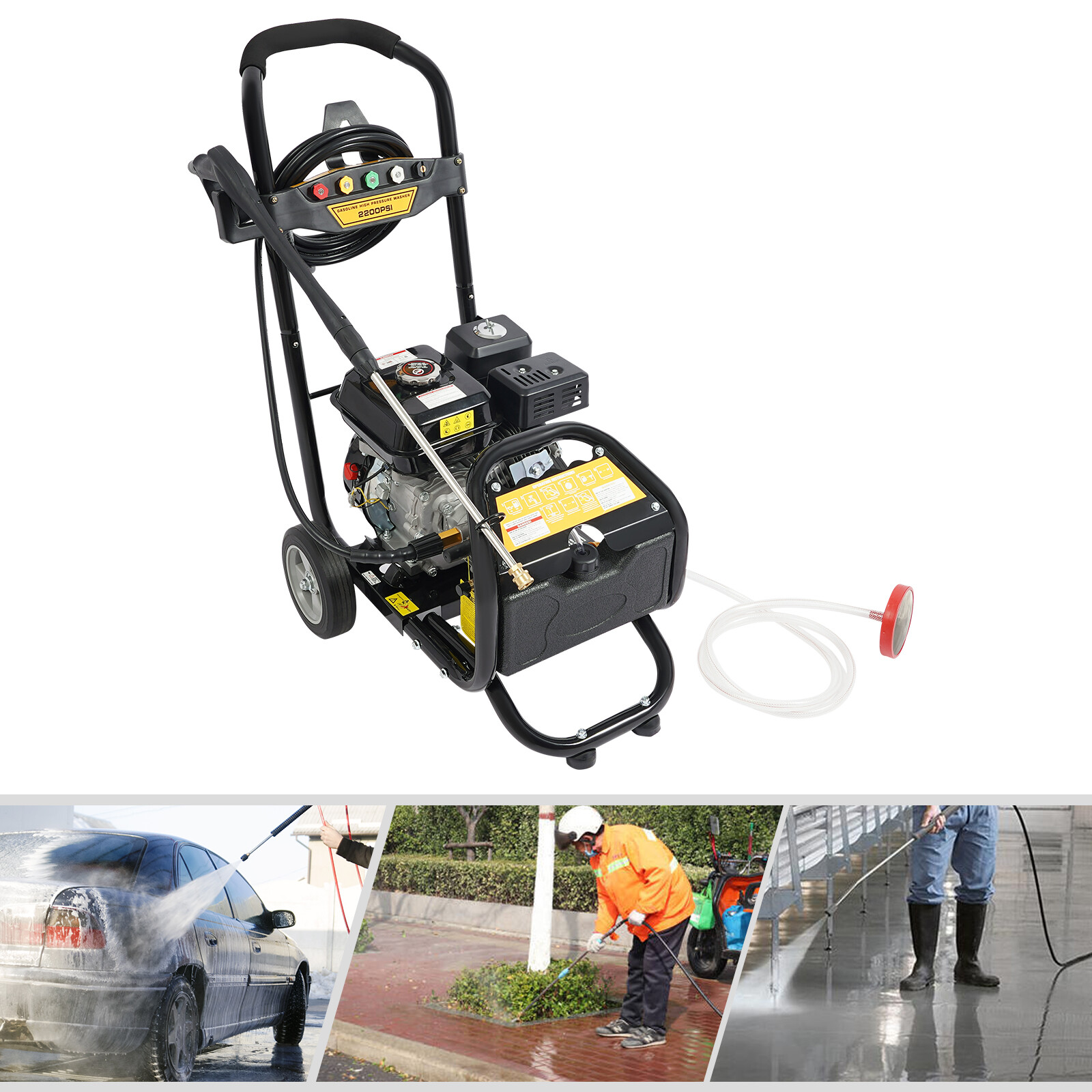 Specifications Color: Black Material: Metal, Plastic, Rubber Engine Type: Compact Engine Mount Type: Freestanding Assembly Required: Yes Start Mode: Manual Power Source: Gasoline Max. Pressure: 2600PSI(180Bar) Max. Flow: 9LPM(2.4GPM) Power: 7HP Rated Speed: 3400RPM Outlet Hose Length: 8m/26.25ft Applicable Temperature: 0-60℃/32-140℉ Liquid Absorbent Pot Capacity: 2L/0.53gal Fuel Tank Capacity: 3.6L/0.95gal (Actual Smaller) Product Size: 87*53*94cm/34.25*20.87*37in Package Size: 72*42*42cm/28.35*16.54*16.54in Gross Weight: 32kg/70.54lbs Net Weight: 30kg/66.14lbs Package Included 1* Gasoline High-pressure Washer 1* Water Gun Assembly 1* Outlet Hose 1* Inlet Hose 1* Strainer 2* Wheels 1* English Manual 1* English Operation Manual All Accessories fo 2600PSI Gas Pressure Washer Cold Water Gas Powered Washer 2.4GPM 7HP / Wheels Description Do you want to thoroughly clean the stubborn stains on your car? Or want to clean your yard thoroughly but the results are not satisfactory? Then try this high-pressure gasoline cleaning machine! It has five spray modes, so you can choose the right nozzle according to your specific needs. And with its high horsepower engine and fast speed rating, it will bring you the most convenient cleaning experience with high efficiency! Key Features Build to Last: It is mainly made of premium metal and plastic materials, waterproof, impact-resistant, and not easy to deform, which can prolong its service life. Multifunctional Cleaning: It has five different nozzles that are capable of intensively cleaning smaller areas, medium-sized areas, larger surfaces, producing rich foam to help clean, etc. High Security: It has a safety lock at the trigger of the water gun, which can effectively avoid improper operation resulting in injury to the user. High Efficiency: It is equipped with a 7HP engine rated to reach 3400RPM and a max. pressure of 2600PSI, it makes quick work of the most demanding tasks. Whether it's roof cleaning, stone cleaning, or vehicle cleaning, it reliably and quickly removes dirt. User-friendly Design: We equip you with a 26.25ft outlet hose to extend your working range and make your work more convenient. Easy to Move & Store: The two wheels allow you to move this product with less effort for convenient cleaning work, and the rubber foot pads ensure stable placement on the floor when not in move or use. Easy to Install: The complete accessories, detailed English manuals, and simple construction allow you to install and use this product with ease. Ideal Gift: With its beautiful appearance and practical performance, it's the ideal surprise for friends who need to clean their vehicles and yards. Buy with Confidence: We stand behind all our guests and look forward to assisting you with your purchase. It is our pleasure to answer your confusion and questions. The end of the story between us is not "we sell and you buy". Details 5 Different Types of Nozzles: The red color is a 0° direct injection nozzle, which is a bundle jet with very high pressure. Yellow is a 15° wide jet nozzle for intensive cleaning of smaller areas. Green is a 25° wide jet nozzle that can be used for intensive cleaning of medium-sized areas. White for 40° wide jet nozzles for intensive cleaning of larger surfaces. The black color is an 80° wide jet nozzle that produces a rich foam to aid cleaning. Practical Strainer: It is equipped with a filter screen to ensure that the water from the nozzle is clean, allowing you to clean your car more thoroughly. Hose Holder: There is a raised area at the back of the nozzle holder that can be used as a hose holder, allowing you to wrap the hose around it when you don't need it, making it easy to use and store. Application It is suitable for cleaning siding, stairs, fences, decks, patios, boats, RVs, farm equipment, vehicles, and more. Specifications Color: Black Material: Metal, Plastic, Rubber Engine Type: Compact Engine Mount Type: Freestanding Assembly Required: Yes Start Mode: Manual Power Source: Gasoline Max. Pressure: 2600PSI(180Bar) Max. Flow: 9LPM(2.4GPM) Power: 7HP Rated Speed: 3400RPM Outlet Hose Length: 8m/26.25ft Applicable Temperature: 0-60℃/32-140℉ Liquid Absorbent Pot Capacity: 2L/0.53gal Fuel Tank Capacity: 3.6L/0.95gal (Actual Smaller) Product Size: 87*53*94cm/34.25*20.87*37in Package Size: 72*42*42cm/28.35*16.54*16.54in Gross Weight: 32kg/70.54lbs Net Weight: 30kg/66.14lbs Package Included 1* Gasoline High-pressure Washer 1* Water Gun Assembly 1* Outlet Hose 1* Inlet Hose 1* Strainer 2* Wheels 1* English Manual 1* English Operation Manual All Accessories for Assembly Notes Please note that fuel is not included in this product. Please read the operating manual and product label completely before use. And pay particular attention to the safety instructions included. Please allow the slight color difference caused by the shooting light and 1-3cm error due to manual measurement, and make sure you do not mind before you order. Payment Delivery details Terms of sales About us Contact us Payment We accept ebay payment 。 Fees such as import duties, taxes are not included in the item price or shipping costs. These charges are the buyer's responsibility. Delivery details Shipping: 2-9 working days to: USA Terms of sales We maintain high standards of excellence and strive for hundred percent customer satisfaction. Feedback is very important to us. We hope that you contact us immediately before you give neutral or negative feedback, so that we can address your concerns. It is impossible to address issues if we do not know about them! About us Your satis faction is our ultimate goal. We work hard to earn your trust and future business. Our certified technicians have tested each item before shipping. The unit comes with 1 year limited warranty on all manufacturing defects. a) If you receive a defective item, you may return it or ask for a discount. Please contact us within 14 days after you receive the package. b) What you returned mus