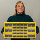 HEAVY DUTY CABINET WITH 26 DRAWERS: The 26-drawer small storage cabinet is made in the U.S.A. from rugged, high-impact plastic and measures 20" W x 6" D x 10" H; Organizer drawers - 6" x 4-9/16" x 2-3/16" (large); 6" x 2-7/32" x 1-9/16" (small) GARAGE ORGANIZATION: The small parts organizer is great for garages and workshops for both homeowners and businesses; The plastic storage drawers can be used as tool box, screw organizer or for battery storage; Keep nails and other small parts accessible CLASSROOM ESSENTIALS: Teachers can use the stackable storage drawers for classroom organization; Use it as a teacher toolbox, art supply storage organizer, craft storage cabinet for scrapbook supplies, and more HOME STORAGE AND ORGANIZATION: This plastic storage cabinet offers many uses around the home; It can be a lego storage organizer, craft organizer, or sticker organizer; Use it for makeup storage and organization or for medicine and first aid supplies FEATURES: Stack cabinets securely or use keyhole slots to mount for wall storage; Finger-grip drawer pulls provide easy access; Rear stop tabs prevent contents from spilling; Drawer dividers are included and molded into the back of the cabinet