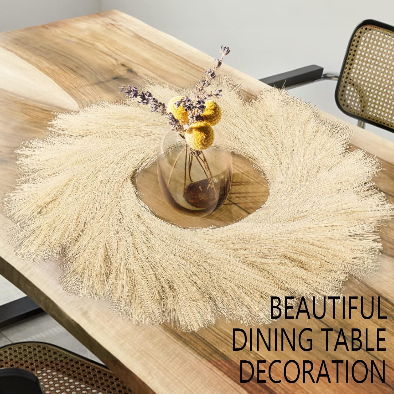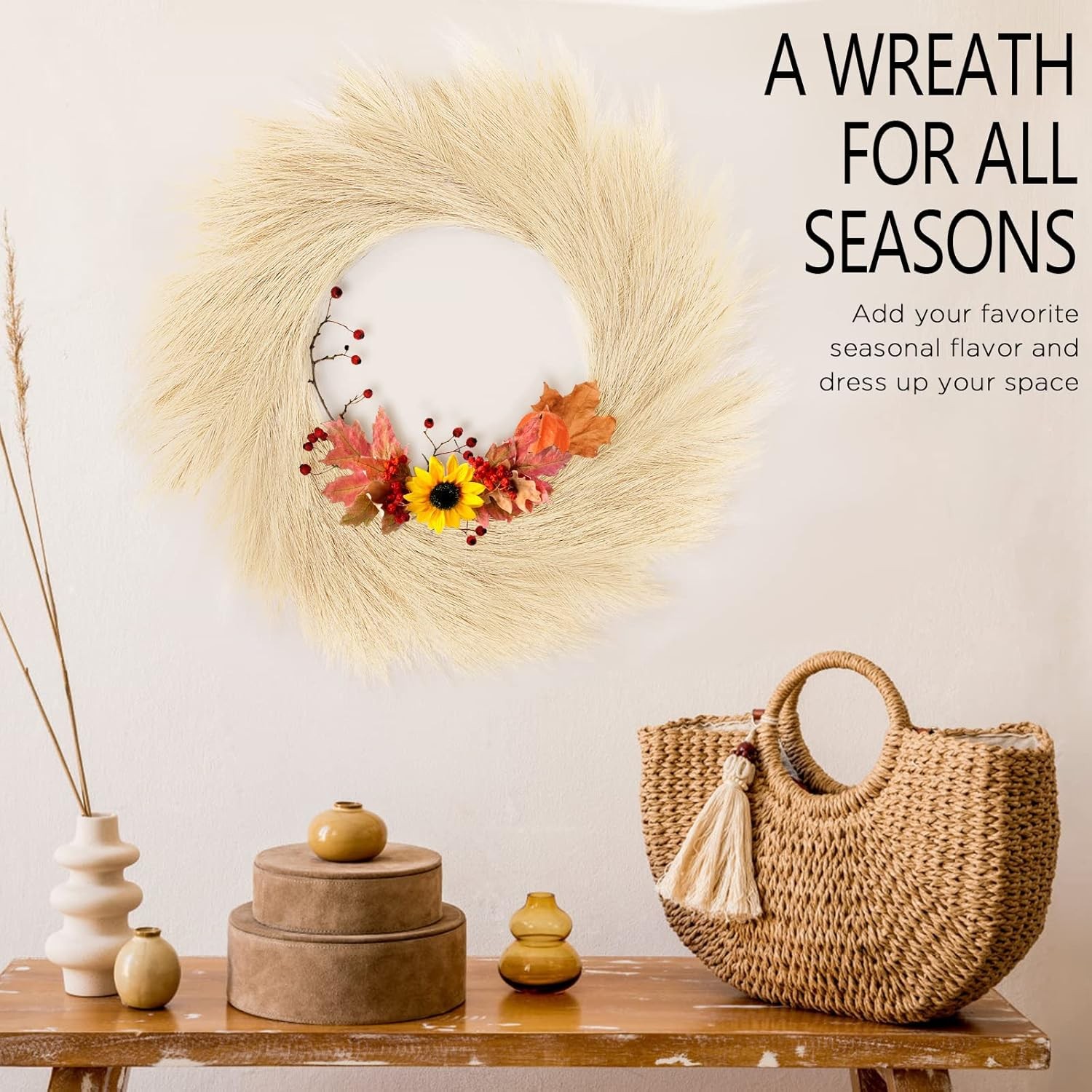 Hananona Artificial Pampas Grass Wreath, 26" Faux Decor Beige Product Details Color: Beige Brand: Hananona Material: Silk Mounting Type: Wall Mount Shape: Round Item Weight: 0.36 Kilograms Product Dimensions: 10"D x 5"W x 2"H Occasion: christmas Manufacturer: Hananona Item Weight: 12.6 ounces Item model number: Artificial Pampus Wreath ARTIFICIAL PAMPAS WREATH: Artificial pampas grass wreath is a great Boho home wall hanging decor. The artificial pampas wreath is simple designed to allow you to decor it with other ornaments. GREAT DECOR FONDATION: This artificial pampas wreath is suitable for weddings, anniversaries, birthdays, or at Christmas time. By add ornament and tinsel or Christmas flowers, it can be a fabulous decor for any holiday or celebration. VERSATILE: The pampas wreaths can be used as wall hangings, door hangings or table décor. There is a hook at the back of the wreath for your convenience. PACKAGE AND SIZE: The package include 1 beige artificial pampas wreath. It is around 24”-27.5” in diameter. PREMIUM MATERIAL: The artificial pampas wreath was made of silk, each wreath consist of 108 pampas stem which make it dense and fluffy. The wreath can be more fluffy when leave it for a while since they are taken out of the packaging. You can tease out the plume so that it can be bigger and fluffier.