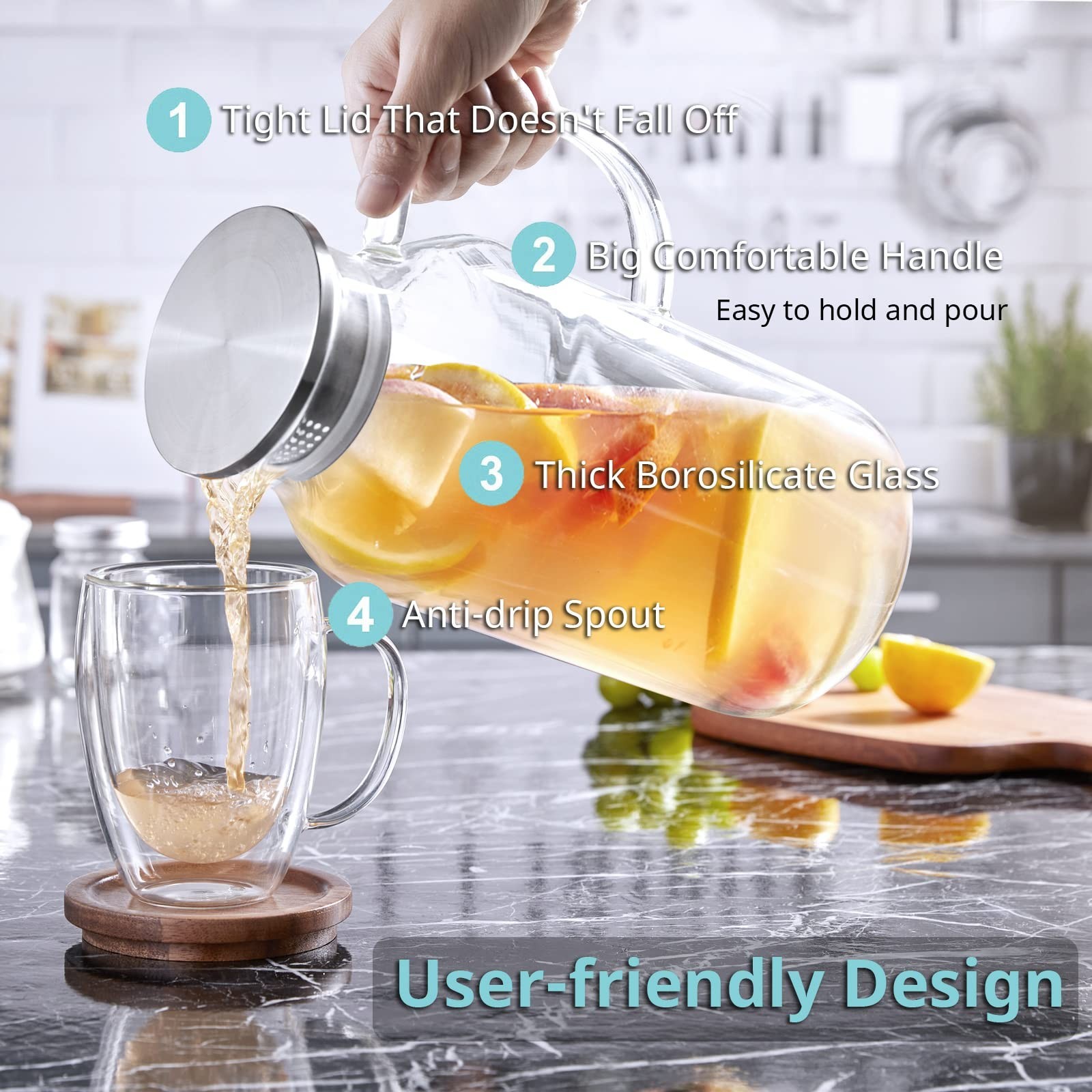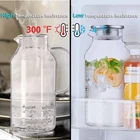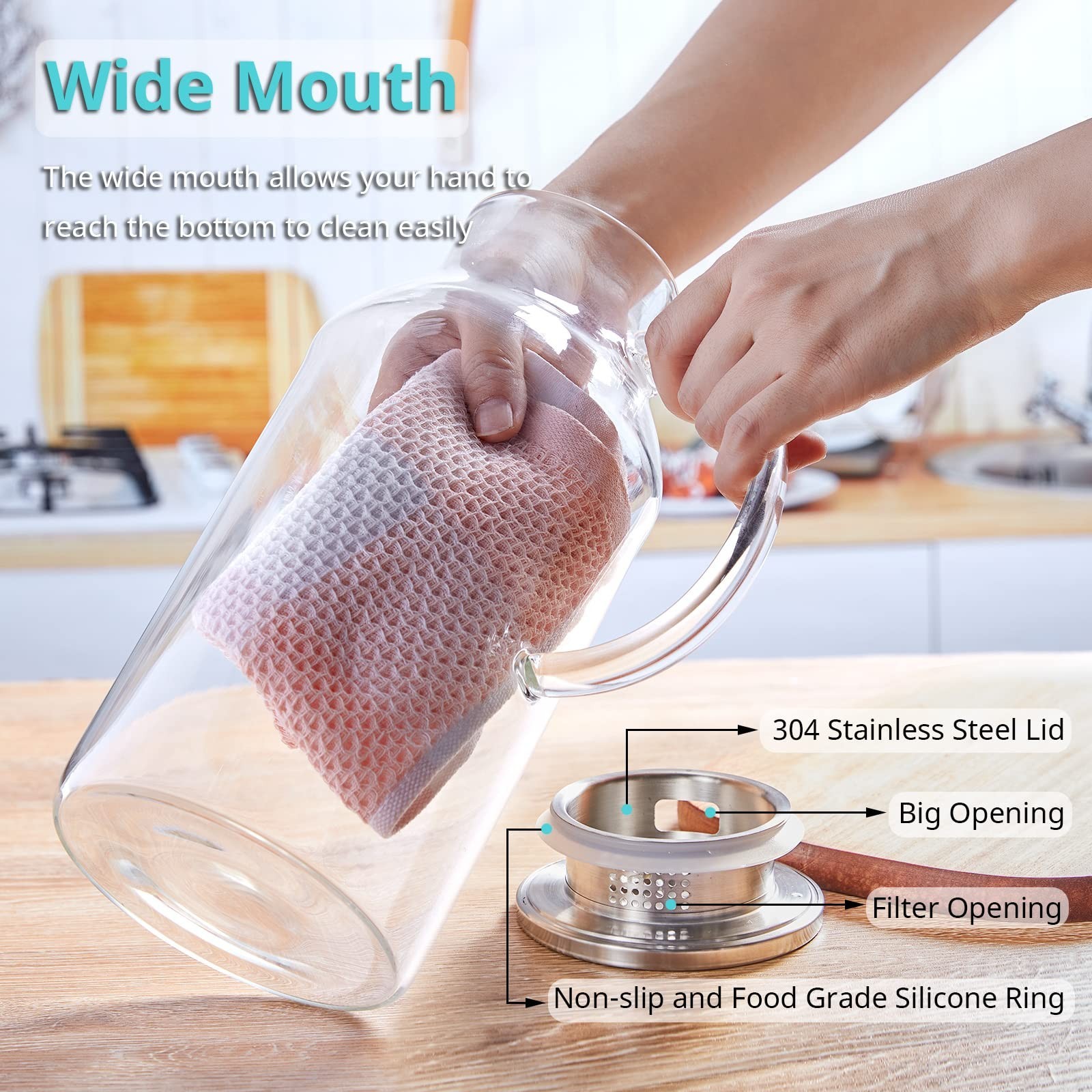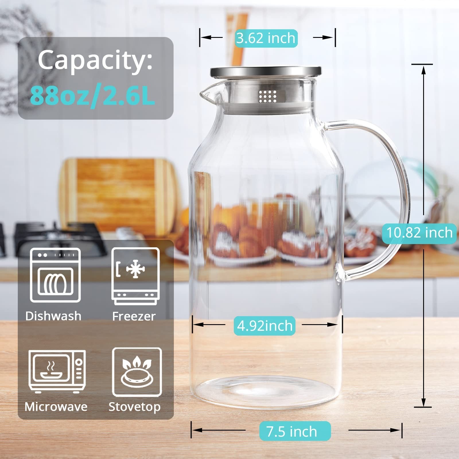 2.6 Liter 88 oz Glass Pitcher with Lid and Spout, Glass Water Carafe for Hot/Cold Water, Iced Tea Pitcher, Large Pitcher for Coffee, Juice and Homemade Beverage Product Details Size: 87.9 Ounces Brand: Bivvclaz MPN: BVH0005P26 UPC: Does not apply EAN: Does not apply Brand: Bivvclaz Material: Borosilicate Glass Color: Clear Capacity: 2.6 Liters Special Feature: Durable, Large Capacity Brand: Bivvclaz Material: Borosilicate Glass Color: Clear Capacity: 2.6 Liters Special Feature: Durable, Large Capacity Style: Modern Product Dimensions: 4.96"W x 10.86"H Included Components: Lid Material Feature: Dishwasher Safe Shape: Round Item Weight: 1.04 Kilograms Model Name: glass pitcher With Lid: Yes Item Weight: 2.29 pounds Manufacturer: Bivvclaz Country of Origin: China Item model number: BVH0005P26 Date First Available: March 6, 2023 Large Capacity for Versatile Use: The glass pitcher holds 88 oz or 2.6 liter, which is exceptionally practical and versatile for parties or everyday use. Perfect for water, milk, iced tea, homemade lemonade or juice, sangria, coffee, wine and so on. The size and shape are great to fit into the fridge. High Borosilicate Glass: The water pitcher is made of heat resistant Borosilicate glass and can withstand temperatures -4 to 302 degree F, so you can also use it to hold and dispense hot and cold liquids safely than other materials. Drinking from glass tastes better, enjoy a better tasting beverage with our water carafe. The glass pitcher with lid doesn't stain, and won't absorb odor or color, can ensure years of use. Two Different Pour Functions: The iced tea pitcher comes with premium 304 stainless steel lid that has 2 different pour functions, one with tiny holes to act like a strainer to keep ice or fruits inside pitcher when pouring and 180 degree turn of the cap provides a wider mouth. Comfortable Handle: The larger and wider handle is easy and comfortable for small and large hands to hold. Wide Mouth Opening for Easily Clean: Both the lid and the pitcher itself are extremely easy to clean, you can even clean it in the dishwasher. The wide mouth will allow your hand to reach in and clean down to the bottom. TIPS: THE METAL EDGES BENEATH THE RUBBER SEAL CAN BE VERY SHARP. WHEN YOU REMOVE THE SILICONE RING TO CLEAN LID, PLEASE BE EXTREMELY CAREFUL.