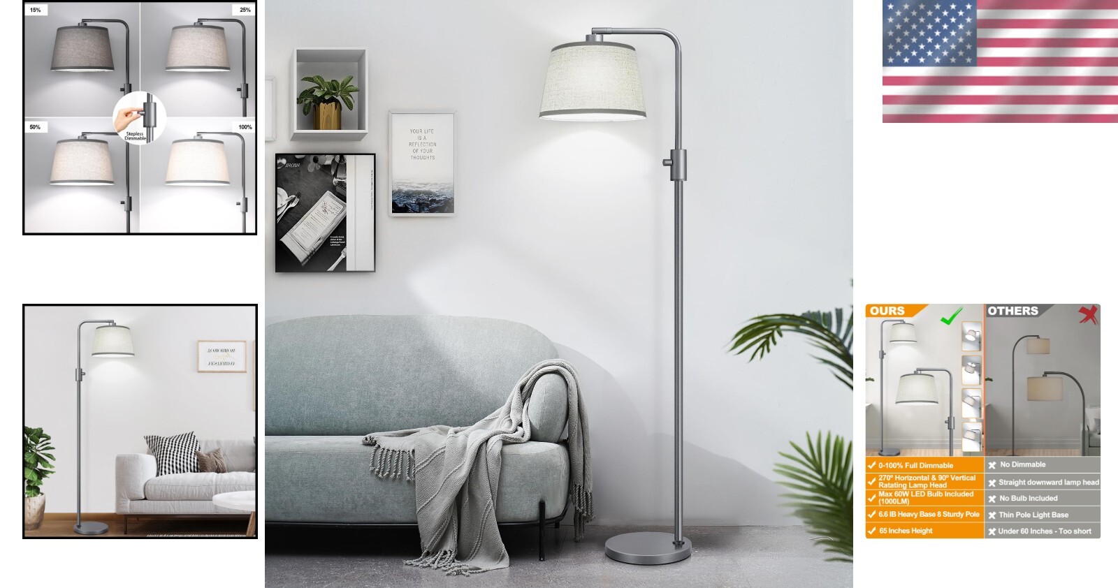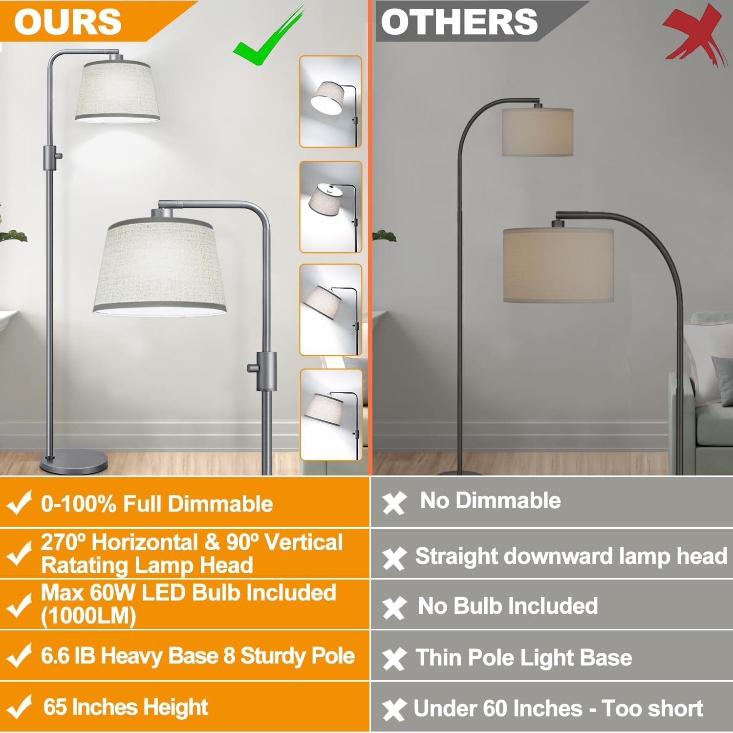 Flexible Rotating Floor Lamp with 270° & 90° Adjustment - 1000 Lumens ‹ › ‹ › ‹ › ‹ › ‹ › ‹ › ‹ › ‹ › ‹ › Flexible Rotating Floor Lamp -270° & 90° Adjustment -1000 Lumens Features: Fully Stepless Dimmable for all room styles and situations Convenient rotary switch for easy on/off and brightness adjustment 270º Horizontal Rotation & 90º Vertical Rotating Lamp Head for customizable lighting 1000 Lumens Bulb included for high brightness and energy savings Sturdy metal base for tip-resistance and stability Long 5.9FT power wire for flexible placement 3 Years Quality & Customer Services warranty Benefits: Customizable lighting for any task or mood High brightness and energy efficiency for reading and studying Sturdy and tip-resistant design for safety Long power wire for convenient placement 3-year warranty for peace of mind Why choose our Flexible Rotating Floor Lamp? Looking for a modern floor lamp that offers customizable lighting, high brightness, and stability? Our Flexible Rotating Floor Lamp is the perfect choice. With fully stepless dimming, rotating lamp head, and included 1000 Lumens bulb, this lamp is ideal for reading, studying, and working. Plus, with a sturdy base and long power wire, you can place it anywhere in your home with ease. And with our 3-year warranty, you can trust in the quality and durability of our product. Don't settle for ordinary floor lamps - choose our Flexible Rotating Floor Lamp for a brighter, more versatile lighting experience! Shipping Free & Fast Shipping - We offer free shipping to most of the USA with a normal delivery time of 3-7 days. However, due to the current situation, additional delivery time (up to 3 weeks) may be required for some items. Alternative Carriers - We may use alternative carriers (e.g. USPS, FedEx, UPS, etc.) to ensure your package arrives safely and on time. Due to the use of multiple carriers, we are unable to provide a tracking number automatically. Handling Time - Orders are processed and shipped within 1-2 business days of receiving cleared payment. Shipping Restrictions - Shipping to Alaska, Hawaii, Puerto Rico, Guam, and other US territories may incur shipping charges or delivery restrictions. Please contact us before ordering, or your order can be refunded/cancelled. State Restrictions - There may be restrictions based on your state of purchase. For example, certain items may not be shipped to California due to state regulations. Contact for Tracking Updates - If you require tracking updates or have any concerns about the delivery of your order, please feel free to contact us, and we will be happy to assist you. Return 30-Day Hassle-Free Returns - We want you to be completely satisfied with your purchase. If you are not, you can return the item within 30 days of receiving it for a full refund or exchange. Easy Return Process - To start a return, simply contact us and we will provide you with a prepaid return shipping label and detailed instructions. Restocking Fee - There are no restocking fees for returns. However, the buyer is responsible for return shipping costs if the return is not due to a seller's error. Refund Processing Time - Refunds will be processed within 5 business days of receiving the returned item in its original condition. Payment We accept all major credit cards, PayPal, and Apple Pay for your convenience. Your payment information is secure and encrypted to ensure a safe and seamless transaction. Please complete your payment within 3 days of purchase to avoid any delays in shipping. Feedback Your feedback is extremely important to us. We strive to provide the best products and customer service possible. If you are satisfied with your purchase, please take a moment to leave us a positive review. If you have any concerns or issues with your order, please contact us before leaving negative feedback. We are committed to resolving any problems and ensuring your satisfaction. Contact Us If you have any questions or concerns, please feel free to reach out to our customer support team. You can contact us through the eBay messaging system. We are available Monday to Friday, 9:00 am to 5:00 pm EST, and we will do our best to respond to your inquiry within 24 hours. Thank you for supporting our small family business!