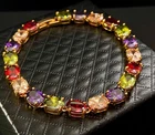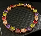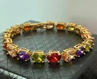 27 CWT Multicolor 4-Prong 6*8 Oval Gemstone Tennis Bracelet 6.5 inch 18k Gold Plated Finish Statement Luxurious Tennis Bracelet We carry the Same Bracelet in Bigger Size 7.5” and in 18k Rose Gold Finish at Our eBay Store Bracelet Design/ Details • Bracelet Type: Tennis Bracelet • Bracelet Size/Length: Bracelet length is 6.5 inch (17cm) • Bracelet Dimensions: Bracelet circumference is 6.5 inch (17cm) • Bracelet Dimensions: Bracelet width approx. 1/4 inch (6mm) • Bracelet Clasp/ Closure: Fold over box clasp • Bracelet Extension Clasp: No Gemstone Details • Gemstone Type: Garnet, Citrine, Peridot, Amethyst • Gemstone Count: 5 Garnet, 5 Citrine, 4 Peridot, 4 Amethyst • Gemstone Total Count: 18 Gemstones • Gemstone Color: Multi-Color • Gemstone Shape: Oval. All gemstones; garnet, citrine, peridot, amethyst is oval shape/cut • Gemstone Composition: Natural • Gemstone Treatment: Heating • Gemstone Setting: 4-Prong • Gemstone Size : 6*8 mm • Carat Weight per stone: Each gemstone is 1.5 carat • Gemstone Carat Total Weight (cwt): 27 carat total weight Metal Details • Metal: 18K Gold plated copper • Base Metal: Semi-precious metals copper and tin • Metal Color: Gold • Metal Plating: 5 Layers of 18k gold over base metal • Finishing Technique: Polished metal • Metal Stamp: No Thank for Shopping with us! Feel Beautiful Every day!