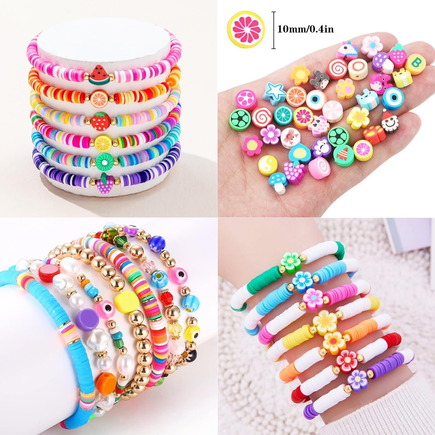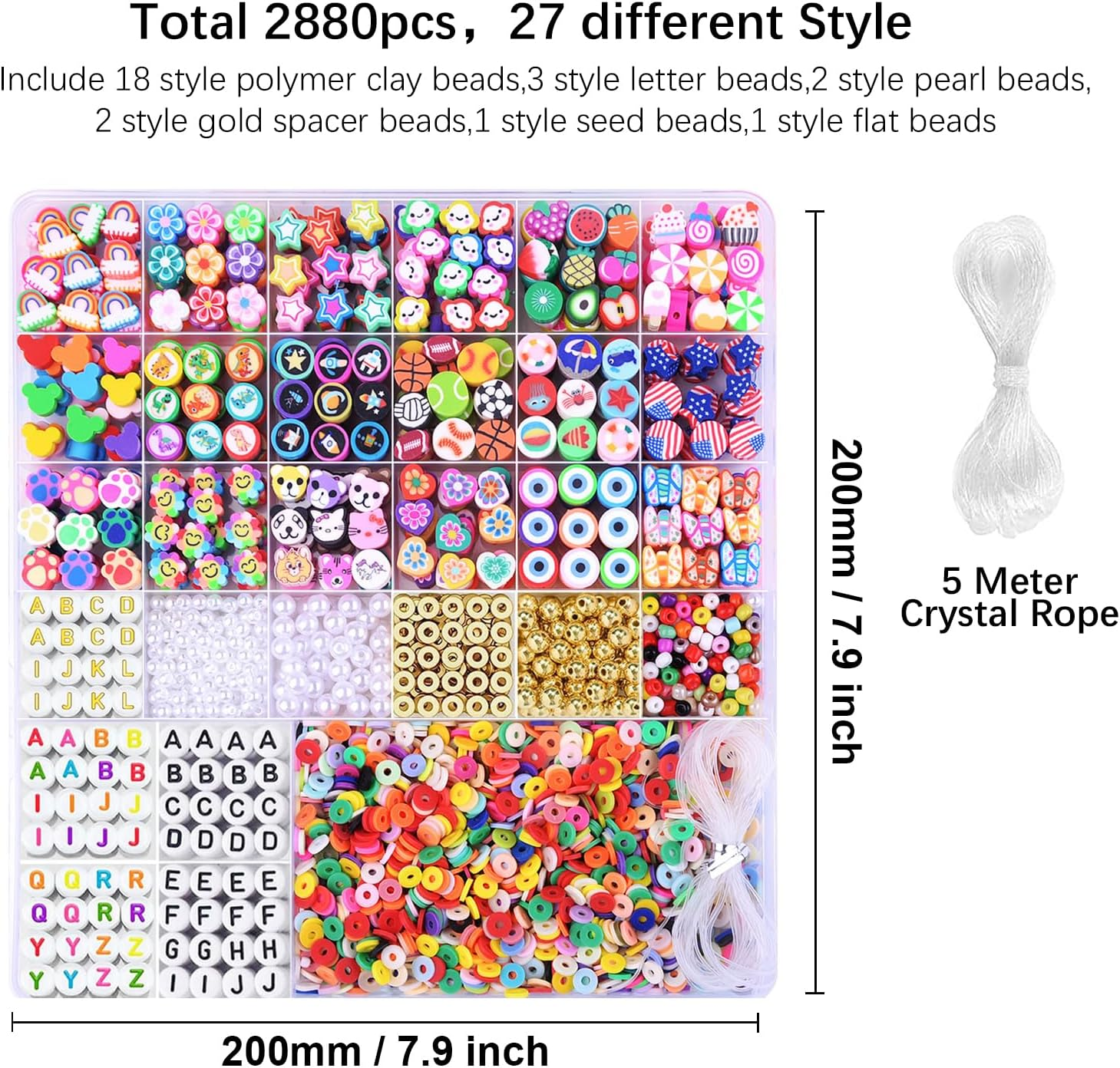 【2880PCS BRACELET MAKING KIT】Include 1 storage box, 27 different styles Bracelet Making beads,contains pony beads, flat round beads, opaque letter beads,colorful letter beads,white letter beads,gold letter beads,peal beads,flat gold spacer beads,round gold spacer beads, rainbow, flower, pentagram, cloud, fruit, candy, mouse head, dinosaur, universe, football, basketball, volleyball, rugby, ocean series, national flag, cat's paw, sunflowers, animals, love, eyes, butterflies beads etc and plus 5 meter elastic string, unique and creative to meet all needs. 【Suitable Size】The polymer clay beads about 6mm long with a 2mm hole, and the size of letter beads is 6*6*3mm,the diameter of the hole is 2mm. the diameter of the other beads are about 10mm, the holes are about 2mm, All beads are separately stored in a 26 grid plastic box, which is very convenient to store and carry 【Premium Materials】 All of our beads are made of healthy materials, light and durable, comfortable to the touch, not easy to fade, waterproof, and can be worn when bathing or swimming. You can use and wear it with confidence 【Wide Application】 Perfect for Beading, Jewelry Making, bead bracelet keychain for women, bracelet earring necklace making supplies, phone charm, phone lanyard wrist, pendants, waist beads kit, hairpin or hair braids, fashionable shoes decor and party decoration. Animal beads adhered to hairpin would be a perfect hair decoration. 【Great Gift for Friends】 This great value bracelet making kit would be a perfect gift to help your Friends to improve hand-eye coordination, improve the practical ability and concentration, broaden imagination, training creativity and logical thinking. Your best friend will love to receive this craft kit for Christmas, Birthday, Thanksgiving Day. Not for children under 3 yrs:Toy contains a small part. Not for children under 3 yrs. To be used under the direct supervision of an adult Product Description