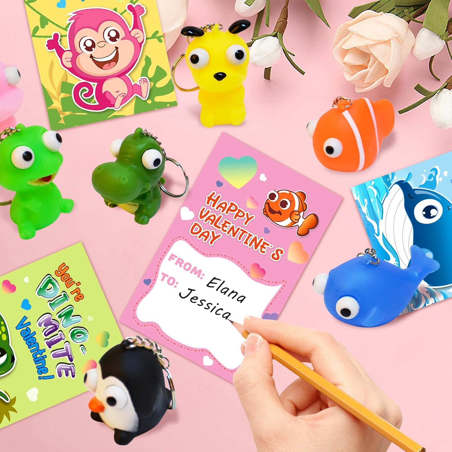 Great Valentine's Day Gift Set - If you're looking for a unique and funny Valentine's Day gift for kids, our popping eyes keychain is the perfect choice! This set includes 28 pcs cards + 28 animal keychains in 7 different styles. Each Valentines Card has a special blessing that matches the animal keychains. Quantity enough for your child to share with classmates. Let’s prepare interesting Valentine’s Day gifts for the kids! Great Valentine's Day Gift Set - If you're looking for a unique and funny Valentine's Day gift for kids, our popping eyes keychain is the perfect choice! This set includes 28 pcs cards + 28 animal keychains in 7 different styles. Each Valentines Card has a special blessing that matches the animal keychains. Quantity enough for your child to share with classmates. Let’s prepare interesting Valentine’s Day gifts for the kids! Funny Card Design - Compared with traditional Valentine's Day cards, our cards add more lovely cartoon elements and rich colors, making your child's gift stand out. Each Valentines card has a cute, humorous messages that uniquely match the animal keychains. Get ready to write blessings on the card and exchange it on Valentine’s Day, will bring endless fun to the kids. High Quality & Easy to Assembly - For the health and safety of children, we use high demanding quality standards. Animal keychains made of safety material, non-toxic, non-BPA. And the cards part is made of high quality coated paper, which is Clear printing and bright colors. The entire set of products has passed the children's product safety test and complies with US toy standards. Tie the keychain and card together with a twist tie, the unique Valentine's Day gift is ready! Fit for Various Occasions - This great value is Ideal gifts for kids valentines day gifts, school event prizes,valentines class exchanging gifts and other. By squeezing the animal, children can atisfying relax fun and entertaining, both entertaining and practical.We believe kids will like this, but if you are not satisfied for any reason, please let us know and we will refund your amount. Product Description