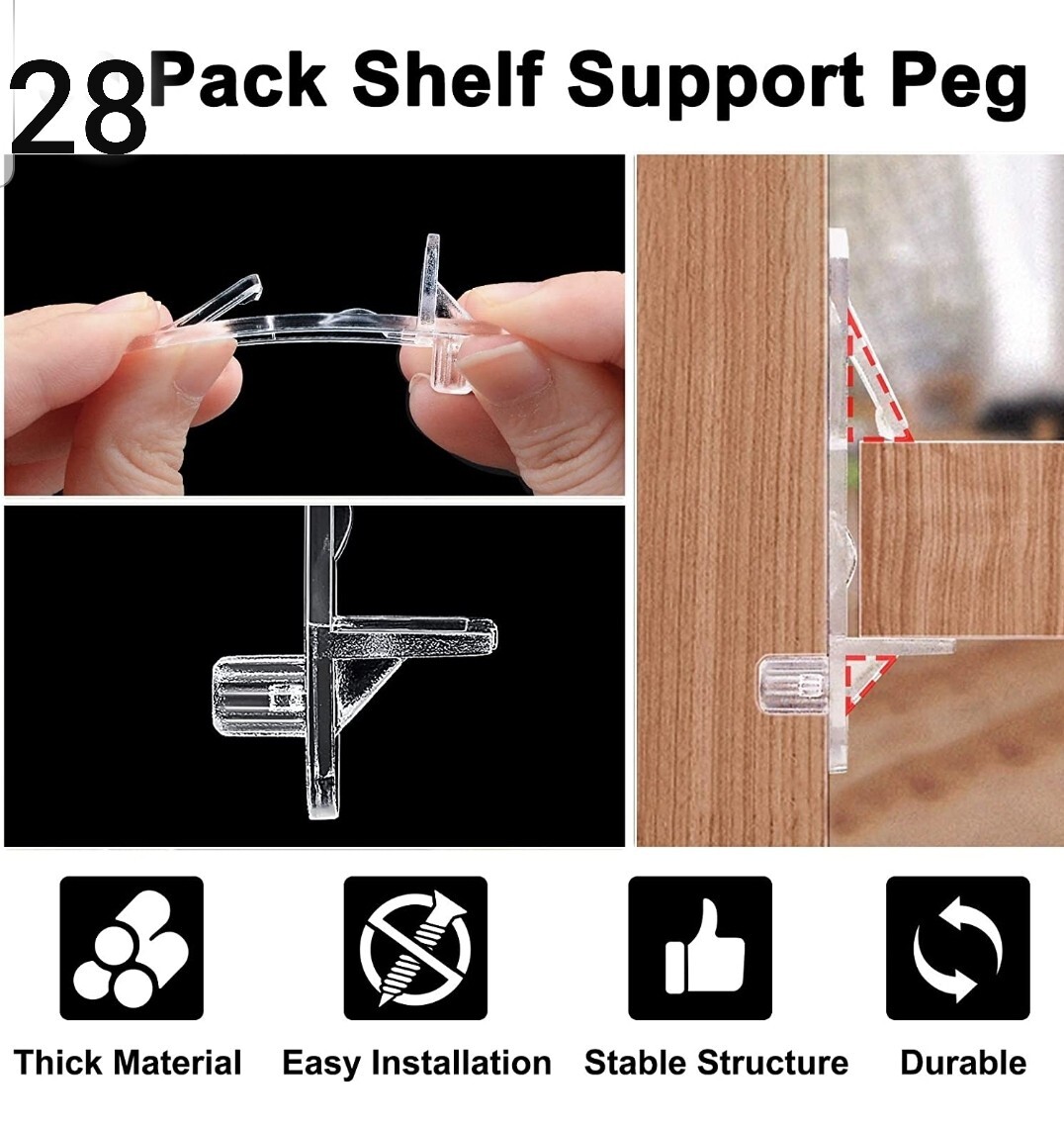 INCREWAY 28 Pack Shelf Support Peg, Clear Plastic Cabinet Shelf Pins, Self-Locking Bracket Clips for Supporting Furniture Kitchen Bookcase Closet Shelf, Fits 7.9mm Diameter Hole and 20mm Shelf New never used opened for inspection