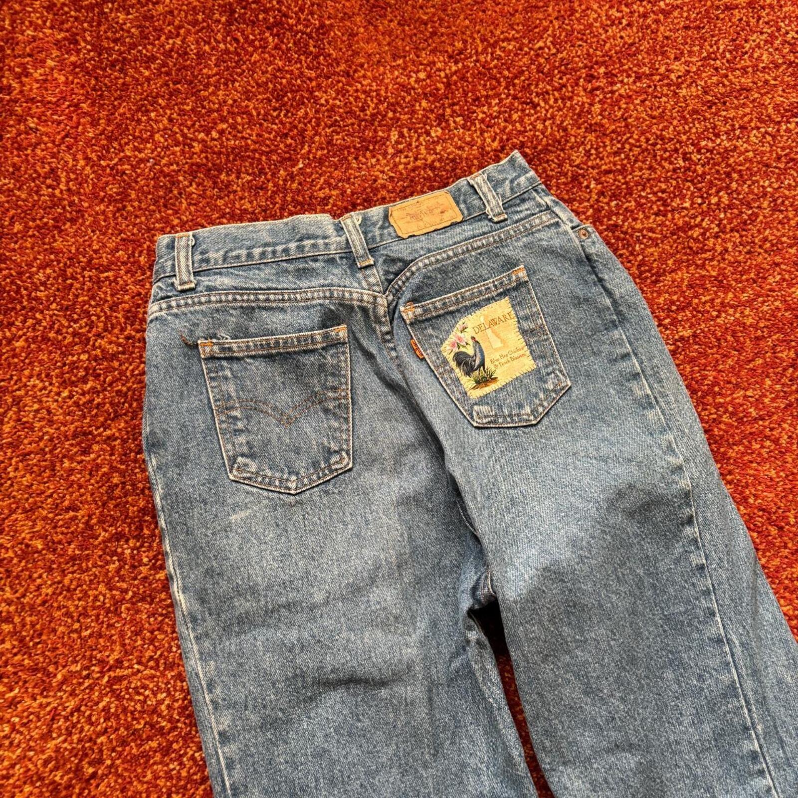 28x30.5 patchwork vintage 1970s-80s Levis orange tab jeans Good condition, original Delaware rooster patch on the back Ladies style levis with zipper fly, good shape Bundle for free shipping
