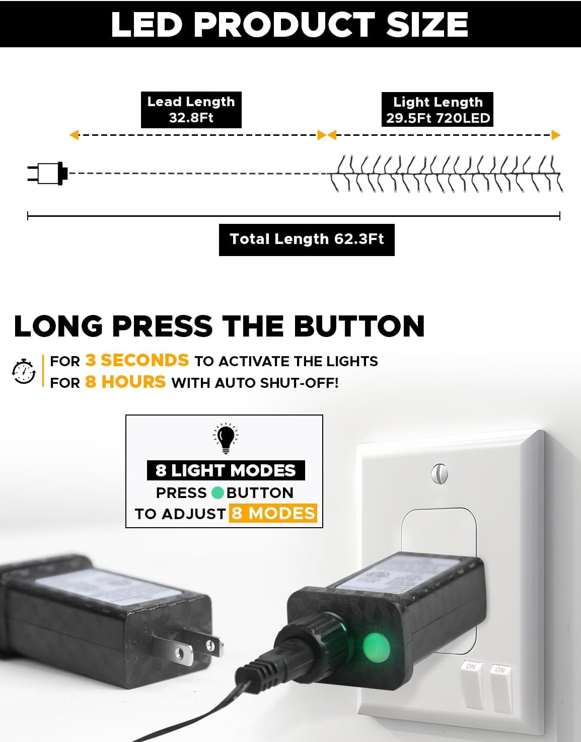 Bright & Festive Cluster Lights for Christmas Tree : Transform your home into a sparkling wonderland with EcoNour LED Cluster Christmas Lights! These cluster twinkle lights for Christmas tree and garland add a rich, dense glow perfect for decorating trees, windows, balconies, and fireplaces. The warm white cluster Christmas tree lights create a cozy festive atmosphere ideal for holiday decor, parties, and outdoor displays. Weatherproof & Durable LED Cluster Christmas Lights : Our IP44 waterproof LED cluster lights are made for indoor and outdoor Christmas decorations. Built with strong insulated copper wire, they can withstand rain, snow, and wind, ensuring year-round reliability. Ideal for Christmas tree cluster lights outdoor, balcony décor, or garden lighting, these LED cluster twinkle lights add a premium glow to any festive setup. 8 Lighting Modes & Memory Function : Bring your tree to life with 8 lighting effects steady on, wave, slow fade, chasing flash, and twinkle. The memory function saves your preferred mode, so your twinkle cluster lights warm white shine perfectly every evening. Ideal for twinkle lights for Christmas tree, twinkling cluster Christmas tree lights, and firecracker Christmas lights that make your home glow. Energy-Efficient Micro LED Cluster Lights : Enjoy brilliant brightness with energy-saving micro LED cluster Christmas lights. These fairy cluster lights stay cool to the touch and offer long-lasting performance perfect for Christmas, New Year, and wedding décor. The LED cluster twinkle lights deliver vibrant illumination with low power consumption, making them ideal for tree, garland, or window decorations. Easy Setup & Multiple Length Options : Decorate in minutes with plug-in cluster string lights that feature flexible, tangle-free wire. Available in 480 LED, 720 LED, 1000 LED, 1500 LED, and 2000 LED cluster lights, these are ideal for Christmas tree, garland, or outdoor patio décor. Perfect cluster fairy lights for Christmas tree and firecracker string lights for home, shop, or festive events beautiful, safe, and easy to install. Product description EcoNour Christmas Tree Cluster Lights The video showcases the product in use. The video guides you through product setup. The video compares multiple products. The video shows the product being unpacked. Econour Christmas Tree Cluster Lights Merchant Video
