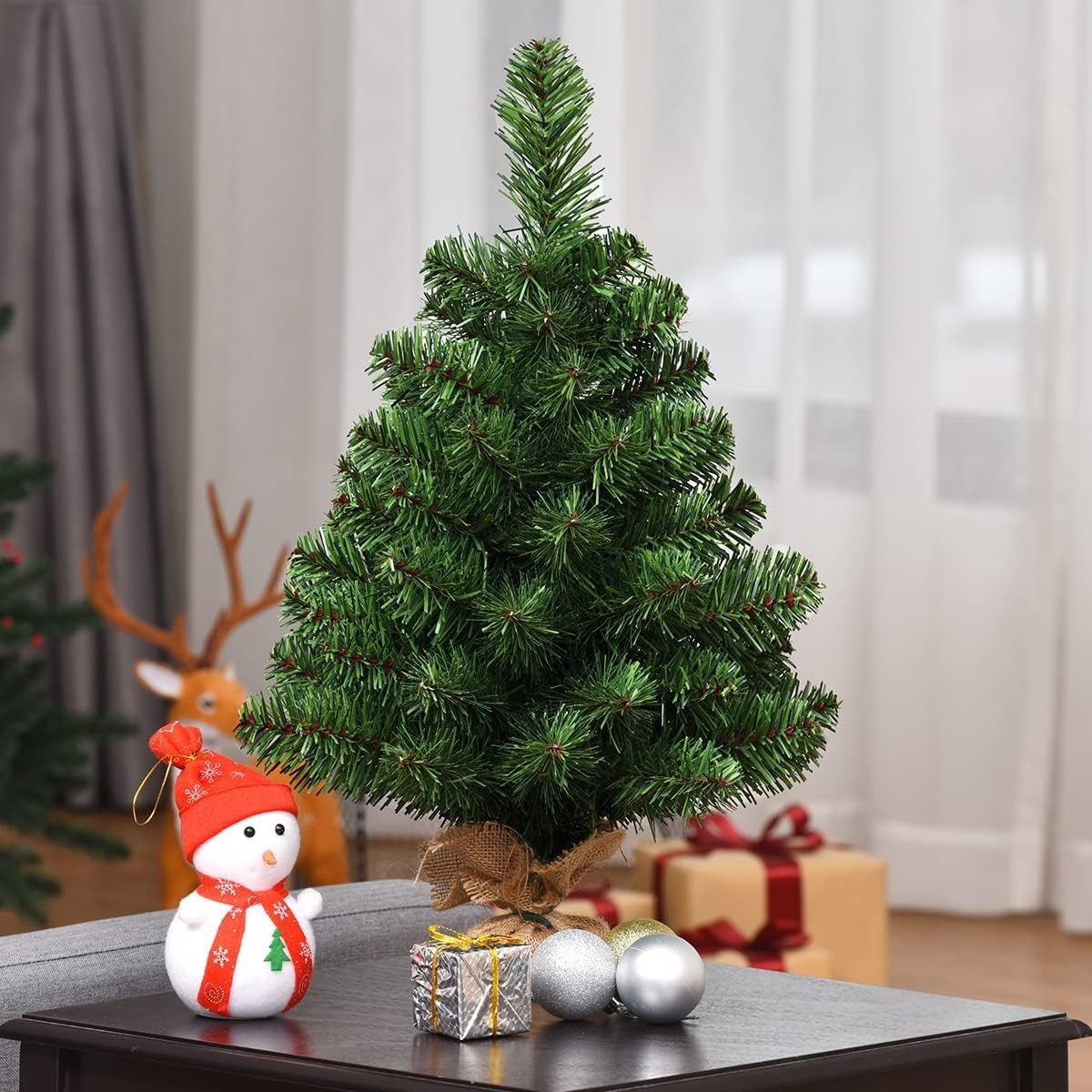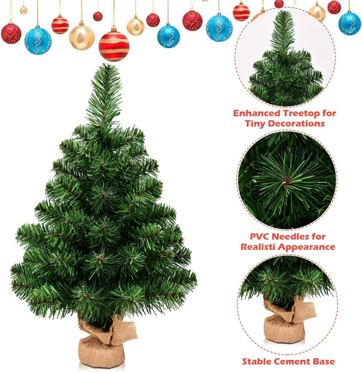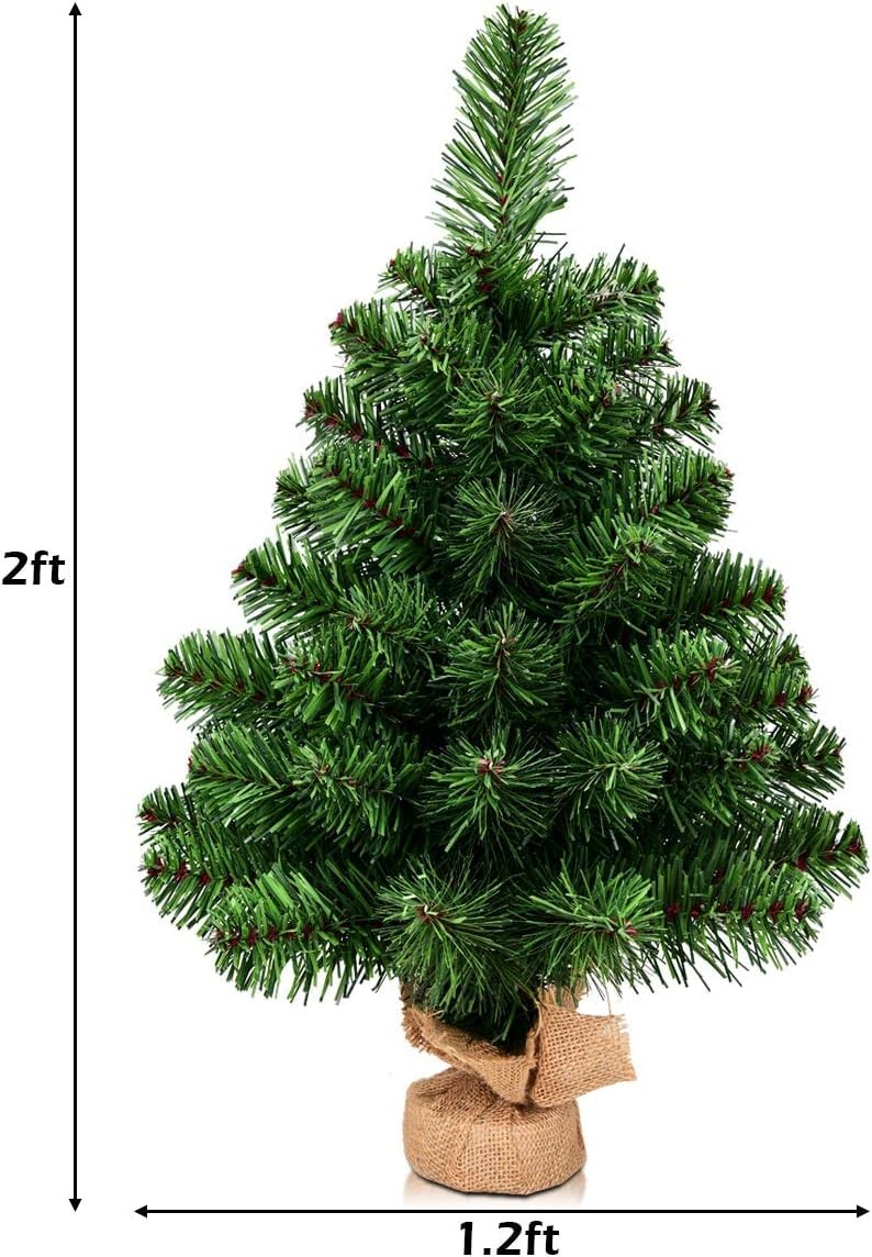 【Burlap Base】 HOMGX Christmas tree features a sturdy burlap base that helps support and balance the trees against falling over. The burlap base is also easy to fix, so you can plant the Christmas tree in a pot. 【 Material】 The blades of our Christmas tree are made from high quality PVC material, which not only makes the tree looks more real and more full, but also add the anti-crush capacity to the tree. And the 67 branch tips help emulate a real Christmas tree. 【Exquisite Decoration】 The branches of the Christmas tree are thick and fluffy, and the 2-foot-long Christmas tree can be placed on the dining table or on the desk. This Christmas tree can undoubtedly be a compelling addition to any room during the holidays. It can add more fun to your life. 【Easy to Set Up】 Our Christmas tree comes in piece , which allow you set up the whole tree in a second. All branches are attached to the trunk make it easy to set up and more effective. What the whole tree need you to do is to make the branches fluffy, so the tree will achieve the best effect. 【Perfect for Many Occasions】 This charming table top tree is full with festive atmosphere, and you could put this in your kitchen, dining table or office desk and any other smaller places. This is a unlit tree, there no extra decorations on the tree, we leave the imaginations of decorating to you and your family.