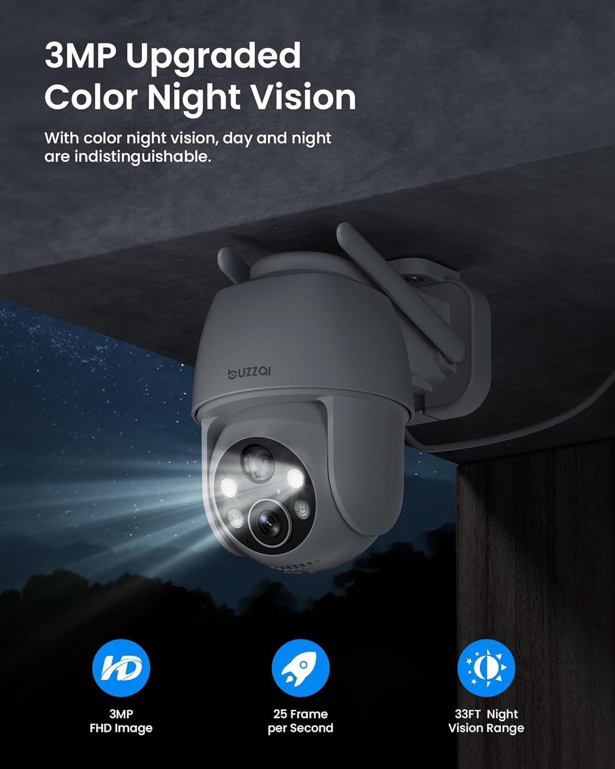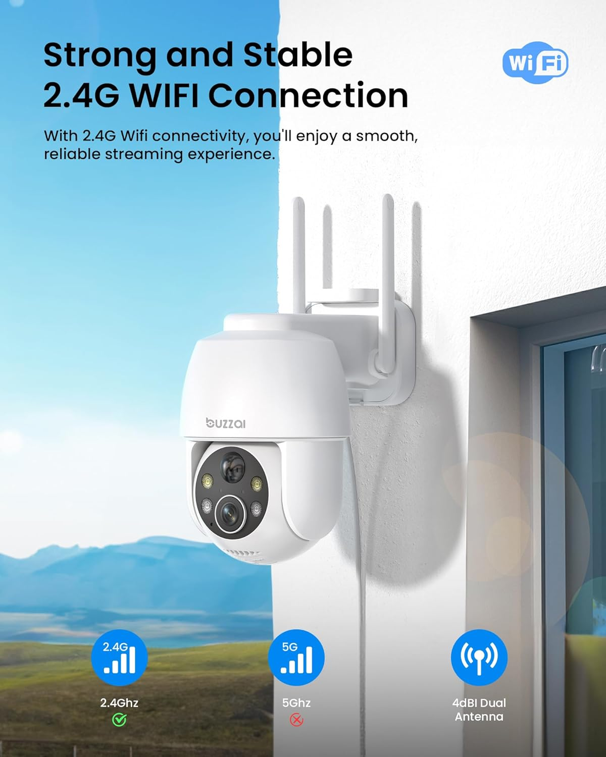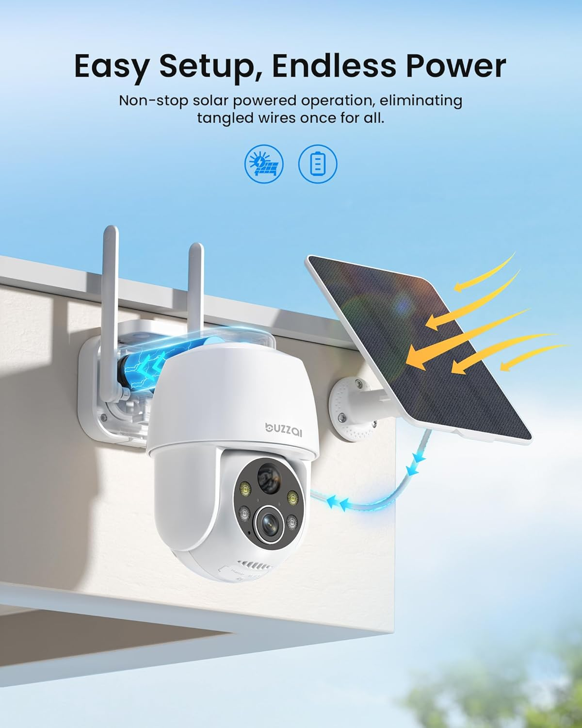 【Wire-free & Solar Powered】This wireless outdoor camera has a built-in 5200ma rechargeable battery to provide non-stop power by the solar panel without any wires or cables. When the wifi camera for home security is turned off, it can automatically enter the energy saving mode,reducing power consumption.The battery powered camera comes with easy quick-fit design, saving your time on installation. 【2K HD & 360°Panoramic Coverage】The solar security camera providing in both 2k(2048*1536) and SD(640*480) resolutions. Buzzai solar ptz security camera rotates up to 355 degrees horizontally and 120 degrees vertically.The solar outdoor camera is equipped with 2 IR lights and 2 white lights to ensure excellent visual effects during the day and night. 【PIR Detection & AI Real-Time Alarm】Outdoor surveillance camera has PIR detector and AI algorith,providing“ Human Detection”without charge,paid for Detection of pets, vehicles and packages, self-adjustable 1-10 levels of sensitivity to provide higher accuracy and fewer false alarms, thus reducing the hassle of frequent message notification. 【Two-way Talk and Smart Playback】You can use“Buzzai Pro APP”to interact with children, guests, couriers, etc.;and also drive away bad guys with lights and sirens, meanwhile, the video recordings of these alarm events can be stored in the cloud( 7 days free) or SD card(no-inculded) for playback. 【Data Security &2 Ways Storage】Encrypted data is transmitted to the cloud via WIFI(2.4Ghz only),The solar camera for home security supports local storage up to 128GB SD card (not included) and basic 6-second cloud storage (for 7 days). Product Description The video showcases the product in use. The video guides you through product setup. The video compares multiple products. The video shows the product being unpacked. 1 2 Mounting Options 2 3MP Day & Night HD 3 Light & Sound Alarm 4 Weatherproof 5 Remote Access 1 Smart AI Detection 2 Real Time Talk 3 Smart Playback 4 Smart Video 5 Smart Home Assistance Dose this solar security camera support 5Ghz wifi connection? No,This solar security camera dosen't support 5Ghz wifi connection(2.4Ghz wifi only). Why doesn't the cameras for home security outside support 7*24 hours continuous video recording? In order to saving power,the camera will start recording based-on events for seconds in SD card or CloudStorage.Also you could start manual video recording as long as you want in smart device when you login to Buzzai Pro APP Can the camera support charging via Type-C interface? The solar security camera supports charging via Type-C interface for several hours in case of an emergency.When the camera is on working,you could see the charging status on Buzzai Pro APP. How can we know whether the solar panel is charging and working? When the solar panel is charging and working, the charging indicator light next to the blue indicator light of the camera is always in red. In addition, in the Battery Management option of the Buzzai Pro App, you can see the battery level.