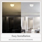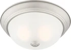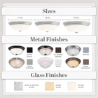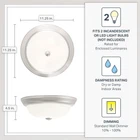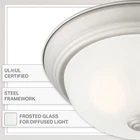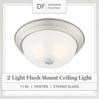 FLUSH MOUNT LIGHT COVER: This sleekly modern overhead light fixture features a durable steel construction with a sleek pewter finish, and a beautiful etched glass shade for soft diffuse light and a professional and sophisticated aesthetic suitable for a wide range of home decors; ideal for indoor lighting fixtures VERSATILE USE: Perfect for a wide range of home settings, this round light fixture is ideal for adding illumination and a touch of class to your kitchen, bathroom, bedroom, dining room, hallway, entry way, stairwell, laundry room, closet, and much more; compatible with standard wall dimmers EASY INSTALLATION: This dome light fixture includes mounting hardware to allow for quick and easy installation, and the close to ceiling light fixture also allows for easy bulb replacement DURABLE CONSTRUCTION: Our light covers are constucted with a strong and sturdy steel construction to provide long-lasting and reliable lighting, and feature etched glass to add a touch of elegance and sophistication to any room SPECS: Our ceiling light fixtures measure 11.25 W x 11.25 D x 4.75 H in inches, and are suitable for use with two medium base 60W LED or incandescent bulbs (Bulbs not included); flush mount ceiling lights are cULus certified for use in damp indoor areas and backed by a 1 year warranty Add bright interior illumination and a touch of elegance to your home with our DESIGNERS FOUNTAIN ceiling mounted light fixture. Constructed with durable long-lasting steel and sleek etched glass, this ceiling mounted light fixture cover is great for adding a touch of class and sophistication to your home decor, and is perfect for use in bathrooms, bedrooms, stairwells, hall ways, utility rooms, or even the entrance to your home. This interior light fixture includes the necessary mounting hardware to allow for easy installation onto ceilings, and the flushed ceiling light also allows for easy bulb replacement. Our simple light fixture measures 11.25 W x 11.25 D x 4.75 H in inches, and is suitable for use with two 60W LED or incandescent bulbs (Bulbs not included). This round ceiling light is cULus certified for use in damp indoor areas, and backed by a 1 year warranty. Enhance your home's lighting with this elegant and contemporary light fixture.