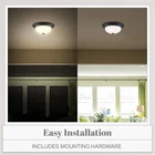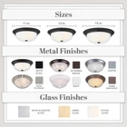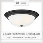 FLUSH MOUNT LIGHT COVER: This sleekly modern overhead light fixture features a durable steel construction with a sleek matte black finish, and a beautiful etched glass shade for soft diffuse light and a professional and sophisticated aesthetic suitable for a wide range of home decors; ideal for indoor lighting fixtures VERSATILE USE: Perfect for a wide range of home settings, this round light fixture is ideal for adding illumination and a touch of class to your kitchen, bathroom, bedroom, dining room, hallway, entry way, stairwell, laundry room, closet, and much more; compatible with standard wall dimmers EASY INSTALLATION: This dome light fixture includes mounting hardware to allow for quick and easy installation, and the close to ceiling light fixture also allows for easy bulb replacement DURABLE CONSTRUCTION: Our light covers are constucted with a strong and sturdy steel construction to provide long-lasting and reliable lighting, and feature etched glass to add a touch of elegance and sophistication to any room SPECS: Our ceiling light fixtures measure 13.25 W x 13.25 D x 5.25 H in inches, and are suitable for use with two medium base 60W LED or incandescent bulbs (Bulbs not included); flush mount ceiling lights are cULus certified for use in dry indoor areas and backed by a 1 year warranty Add bright interior illumination and a touch of elegance to your home with our DESIGNERS FOUNTAIN ceiling mounted light fixture. Constructed with durable long-lasting steel and sleek etched glass, this ceiling mounted light fixture cover is great for adding a touch of class and sophistication to your home decor, and is perfect for use in bathrooms, bedrooms, stairwells, hall ways, utility rooms, or even the entrance to your home. This interior light fixture includes the necessary mounting hardware to allow for easy installation onto ceilings, and the flushed ceiling light also allows for easy bulb replacement. Our simple light fixture measures 13.25 W x 13.25 D x 5.25 H in inches, and is suitable for use with two 60W LED or incandescent bulbs (Bulbs not included). This round ceiling light is cULus certified for use in dry indoor areas, and backed by a 1 year warranty. Enhance your home's lighting with this elegant and contemporary light fixture.