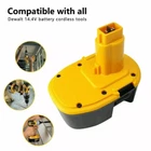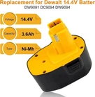 Replacement for Dewalt 14.4v battery DC9091 DW9091 DW9094 DE9095 DE9038 DE9091 DE9092 DE9094 DE9502 Battery Specification: Voltage: 14.4V Capacity: 3600mAh Battery Type: Ni-Mh Package includes: 1x Replacement for Dewalt 14.4v Battery Replacement 1 x User Manual Battery Advantage: High-quality battery cells, the battery provides excellent running time, power and performance. 100% compatible with original equipment and chargers, easy to install and disassemble. Using high-quality batteries and raw materials, no pollution to the environment. Replacement PN: DC984, DC9091, DC730KA, DC930KA, DCD920KX, DCD930KX, DW935, DW954, DW941K-2, DW9091, DW9094, DE9091, DE9038, DE9095 Compatible with: (Please use "Ctrl+F") For DCD Series :DCD930B2, DCD930VX, DCD935B2. For DW Series: DW054K-2, DW055K-2, DW906, DW918, DW928K, DW928K-2, DW931K, DW931K-2, DW935K, DW937K, DW941K, DW966K, DW966K-2, DW969K-2, DW983K, DW983K-2, DW984, DW984K-2, DW985, DW985K-2, DW985KV-2, DW991K-2, DW992K-2, DW994KQ, DW996K-2, DW996KQ. For DC Series: DC528 (Flash Light), DC551KA, DC612KA, DC613KA, DC614KA, DC615KA, DC728KA, DC731KA, DC731KB, DC732KL, DC733KA, DC733KL, DC735KA, DC735KB, DC757KA, DC757KB, DC830KA, DC830KB, DC833KA, DC835KA, DC835KB, DC935KA, DC935KB, DC935VA, DC936KA, DC936VA, DC983KA, DC983SA, DC984KA, DC984KB, DC984VA, DC985KA, DC985VA. Compatible with Dewalt Models: 2802K, 2812B,2812K, 2832K, 2852B, 2861K-2, 2872B, 2872K-2, 2872KQ, 2898B, 2898K, DCDK12 Battery Maintenance: For transport safety, batteries will not fully charged when being shipped from factory.(Only battery, charger is not included.) Always allow battery to cool down before recharge it.Please store it in a clean, dry, cool place away from heat and metal objects. Always remove battery from tool when you are assembling parts,making adjustments,cleaning,or when not being used for an extended time. Please don't let the battery as dormant for a long time. We recommend charging at least once every 2-3 weeks. Do not use power tool batteries for 30 days or longer. Please store the batteries in a clean, dry, ventilated, and ventilated place, away from heat