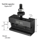 Model Number: 250-001 Turing and Facing tool holder Tool bits range: up to 1/2inch Material: Steel Matched Tool Post: 000 Wedge type Tool Post Can't use with Mini Aluminum Quick Change Tool Post