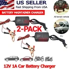 2 Pack Car Battery Chargers Maintainers Material: ABS Shell Color: Black Alligator Clips Color: Red & Black Plug: US Input: AC 110-240 V, 50-60HZ Output: DC 12V 1A LED indicator: Green=Battery full. Red =charging. Dimension: 85 x 48 x 30mm Input Wire length: 60 cm Output Wire length: 100 cm Features: 1. Short circuit protection ( LED goes out, charging stops) 2. Wrong connection protection (LED turns red, charging stops) 3. Battery is full (LED turns red, charging stops) 4. Charging time varies with the size of batteries, 12V 5- 7AH takes about 6 hours; 12V 9AH takes about 10 hours; 12V 15-17AH takes about 13-15 hours Package Including: 2 x 12V Battery Charger Maintainers with Alligator Cli ps
