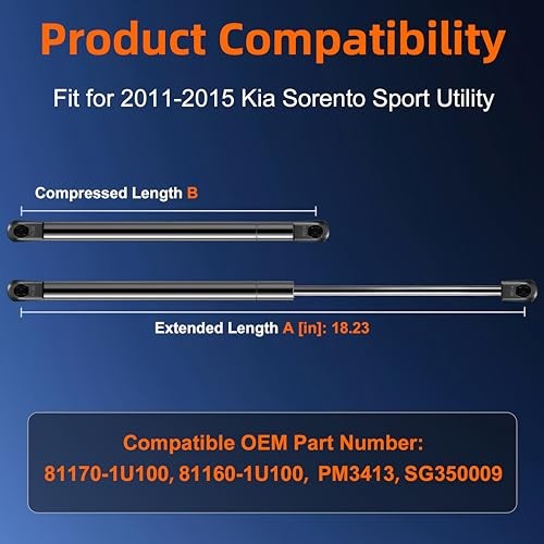 2PCS Front Hood Strut Lift Supports Replacement for Kia Sorento 2011–2015 2PCS Front Hood Strut Lift Supports Replacement for Kia Sorento 2011–2015 Directly Replacement hood struts lift support compatible with 2011,2012,2013,2014,2015 Kia Sorento. Enjoy a smooth and effortless opening and closing of the hood with our front hood support struts, free your hands! This automotive replacement shock lift supports compatible with interchange numbers 96267, 00580, 00584, 231594, 232789, 233028, 315484, 315723, 561173, 6267, 630024, 630502 811601U100, 81160-1U100, 811602P00, 81160-2P00, 811701U100, 81170-1U100, 811702P00, 81170-2P00, 917082, D96267, SG35009 24761, 5344006050, 53440-06050, 5344006050B, 5344006051, 53440-06051, 5344006052, 53440-06052, 5344006060, 53440-06060, 5345006040. Ensure compatibility by comparing the cylinder part numbers of your original gas struts before purchasing. How to choose: Determine your car model and OEM interchange number of your old cylinder, then measure the extended length of your existing gas shock lift. Compare the force, size, OE number, and measurement with our hood lift support replacement. Product Basic Information: This listing includes 2 gas shocks. Extended Length: 18.23 inches. Easy to install with just a flathead screwdriver! Enjoy 24-hour email response and a 15-month product exchange service. Feel free to reach out to us anytime with your inquiries.