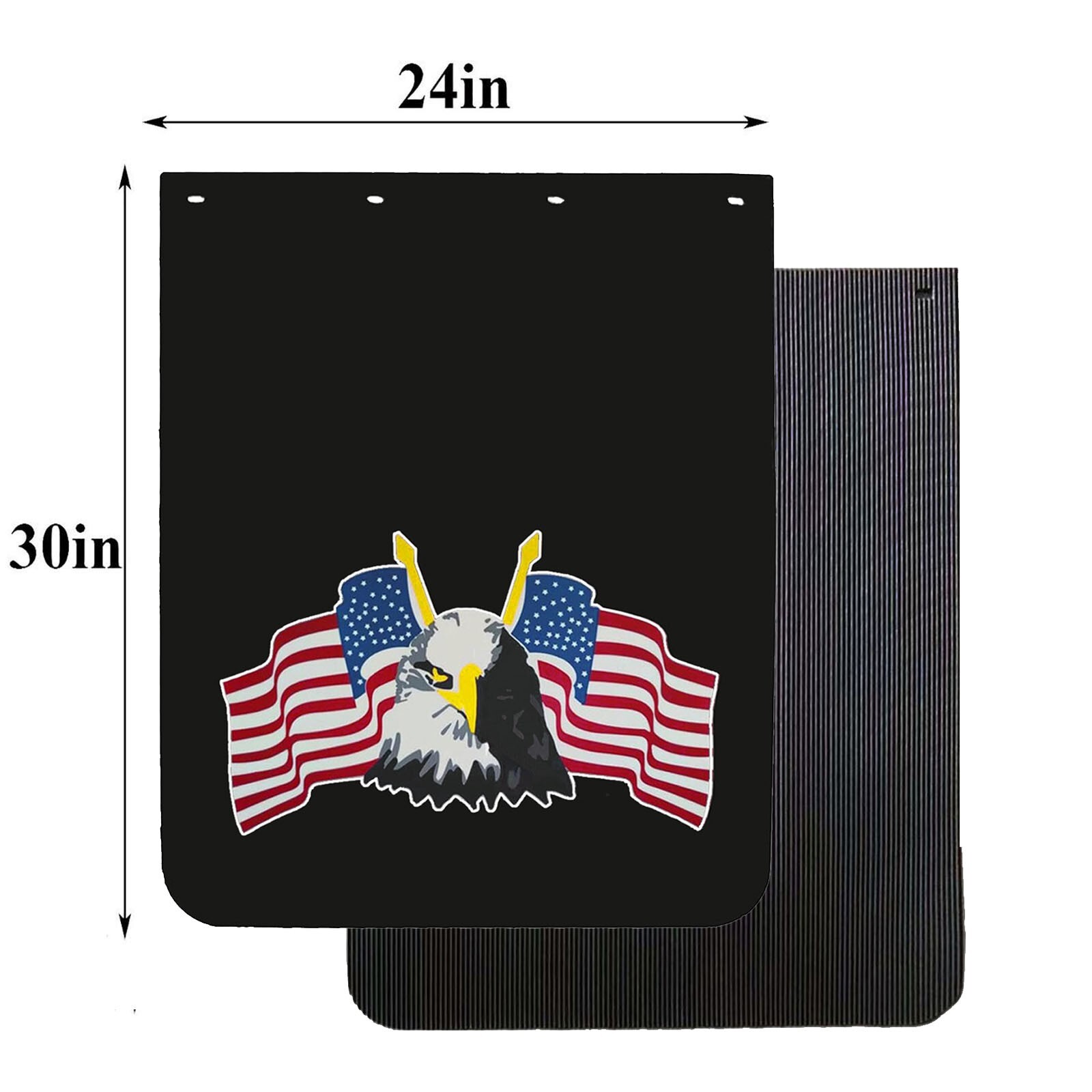 This product is a pair of 24" x 30" Black Heavy Duty Thick Rubber Mud Flaps designed for semi trucks and trailers. They are made of durable plastic material and feature a painted finish. The mud flaps come with 2 PCS included and have a universal fitment, making them suitable for various vehicles. They are designed to be car wash safe and washable, with a bolt-on attachment type for easy installation. These mud flaps are a performance part that provides protection for the rear of the vehicle from mud and debris while driving.