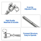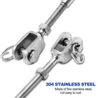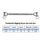【Package Includes】 -- 2PCS x M5 Jaw and Jaw Turnbuckle. Total Length: 137mm/5.4". Breaking Load: 1100lbs. 【Premium Material】-- Jaw turnbuckle is made of premium stainless steel, highly resistant to oxidation, rust free and wear resistant. 【Function】 -- Each end has open jaw with pin and safety wire for easy,secure connections. For fastening and binding rope. Simply take out the clevis pin from the rigging screw fork by removing the split ring. 【Application】 -- Jaws on each end allow easy connection to eyes with a clevis pin and cotter pin. Ideal for marine and industrial use, can also be used for recreational activities like zip lining Product Description Feature Closed body rigging screws with a Jaw and Jaw or Fork and Fork, superior rust resistance. Hot dipped hex turnbuckle body with clevis jaws at each end to provide full wrench bearings. Helps tension anything from rope to steel cable. Feature Suitable for tighten taut rope, and regulate the elastic effect. Made of 304 stainless steel, durable, high quality and waterproof. Polished oxidation-resistant layer, burr-free & smooth, waterproof & weatherproof work. Suitable for stage lighting safe rope, tent rope, corridor rope, clotheslines, hanging rope, paint exhibition display, etc. Turnbuckles