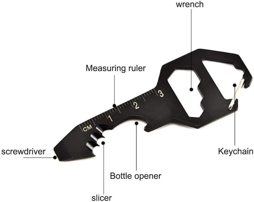 【6 In 1 Extremely Functional】Key multitool(2PCS) packs 6 tools into a key-sized key chain multi-tool including a Bottle Opener,a Flathead Screwdriver,Metric Ruler,a Cord Cutter,a Wrench of Various Inches 【A Multitool The Size Of A Key】Our super compact and lightweight multitool key can easily fit in your Keychain,you can carry it with you everywhere you go.Little key design is specifically meant to occupy as little space as possible while being your ultimate outdoor companion 【Stainless Steel Material】Made with extra-durable stainless steel, our key tool will never let you down.Its corrosion-resistant design will never bend or break and it will always remain good. Get it now and you’ll simply never have to replace it 【Handy Tools Everyday Needs】You will never know when this multipurpose key tool will come in handy.Great for normal people living their everyday lives and a necessary for travelers,backpackers,hikers,bicyclists and adventurers 【An Practical Tool】If you are looking for a suprise for your father, brother or friend. Think about this, you have just found the most unique and practical key tools that any man would appreciate. So get this key Multi-Tool for them and they will love it Product Description 2PCS Keychain Bottle Opener Multitools-Key Size Small Pocket Gadgets for Men or Women Compact Keychain Multitool: Bottle Opener, Flathead Screwdriver, Metric Ruler, Cord Cutter, Wrench Indispensable addition for outdoor enthusiasts, travelers, backpackers, cyclists, anyone needing handy tools Q:What are the different tools included in this keychain tool? A:This keychain tool includes a bottle opener, flathead screwdriver, metric ruler, cord cutter, and wrenches of various sizes Q:How many small key size tools will I receive? A:2PCS in the package, one Silver and one Black Q:Is this gadget suitable for all keychains? A:Yes, this gadget fits most keychains, and easy to use Q:Can this keychain multitool be used for emergency situations? A:This keychain tool could potentially assist in emergency situations, but it is not specifically designed for that purpose