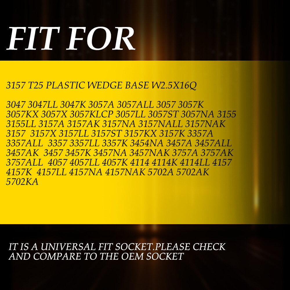 Fits for: 3157 T25 Plastic Wedge Base W2.5x16q 3047 3047LL 3047K 3057A 3057ALL 3057 3057K 3057KX 3057X 3057KLCP 3057LL 3057ST 3057NA 3155 3155LL 3157A 3157AK 3157NA 3157NALL 3157NAK 3157 3157X 3157LL 3157ST 3157KX 3157K 3357A 3357ALL 3357 3357LL 3357K 3454NA 3457A 3457ALL 3457AK 3457 3457K 3457NA 3457NAK 3757A 3757AK 3757ALL 4057 4057LL 4057K 4114 4114K 4114LL 4157 4157K 4157LL 4157NA 4157NAK 5702A 5702AK 5702KA Specifications: Material:Copper,Plastic Voltage:12V Features: *Superior quality Made of superior quality material to ensure its long service life and durability. *Stable performance 2x 3157 3357 4157 3057 3457 LED Bulb Brake Turn Signal Light Socket Harness Wire Fits for: 3157 T25 Plastic Wedge Base W2.5x16q 3047 3047LL 3047K 3057A 3057ALL 3057 3057K 3057KX 3057X 3057KLCP 3057LL 3057ST 3057NA 3155 3155LL 3157A 3157AK 3157NA 3157NALL 3157NAK 3157 3157X 3157LL 3157ST 3157KX 3157K 3357A 3357ALL 3357 3357LL 3357K 3454NA 3457A 3457ALL 3457AK 3457 3457K 3457NA 3457NAK 3757A 3757AK 3757ALL 4057 4057LL 4057K 4114 4114K 4114LL 4157 4157K 4157LL 4157NA 4157NAK 5702A 5702AK 5702KA Specifications: Material:Copper,Plastic Voltage:12V Features: *Superior quality Made of superior quality material to ensure its long service life and durability. *Stable performance The light base with stable performance provides a better shopping experience for our customer. *Easy installation Easy installation with direct replacement, other modifications are not required. *All tested before shipment All products were tested for performance and to ensure the accurate parameter for your vehicle. Packaging include: 3157 light base *2 Item Specifics Brand AUXITO Bulb Fitment Code 3157 Bulb Life Hours Up to 30,000 Hours Color Temperature 3000K Features Ballast Included CANbus Compatible Light Bulb Wiring Socket Connector Road Legal Light Color White Lighting Technology Incandescent Lumens 1000 lm Manufacturer Warranty 1 Year Number of Bulbs 2 Suitable For Front Turn Signal Light, Parking Light, Turn Signal Light Type Type Turn Signal Light Assembly Accessory Linker Universal Fitment Yes Voltage 12 V Wattage 21 W Fit bulbs size 3057 3156 3155 3157 3157A 3357 3457 3457A FAQ ♥ If you have a decoding problem or any other problems, please contact us first, we will help you with it. We will reply you within 24 hours in working days. I'm a new seller, thanks a lot for your trust and convince! I will serve you with all my heart. ♥ Q1: Will this bulb fit my vehicle? A: We can match almost any vehicle to one of our bulb sizes. eBay only lets us include some vehicle fitments per listing, but if your vehicle does not show up on the compatibility table at the top of our listings, welcome you to contact us for free consulation before purchasing a product. Q2: My item has not arrived, what's taking so long? A: Sometimes items take longer than expected, especially if it’s going far or to rural area. Check with your post office to see if your item has been held up. Sometimes Royal Mail will not update a tracking number until it has arrived at its destination. If your item still don't arrive after a few days, let us know so we can double check for you and help solve it asap. Q3: My bulbs won't fit, help! A: Special bulb holder may be required. See if you can take the holder from the stock bulb. If not, let us know. The bulb size may be wrong, double check the item you received with the item you ordered. Do you have an aftermarket lighting housing? These may not be perfectly fitted for aftermarket bulbs and will require some manual modifications. Q4: Neither side lighting up? Both sides flicker, hyper flash, or work inconsistantly. A:Check the light fuses, and then check the ballast plugs to insure correct installation. If this doesn't work, there may be a voltage problem with the vehicle. You probably just need a relay or capacitor. Even though some bulbs are builtin resistors, they may still need a decoder. Pay & Ship (1). We gladly accepts payment via PayPal, We will ship your item(s) within 24 hours. (2). Before payment, please keep the consistency of Paypal address and ebay address. (3). Quantity orders are welcome! Returns (1). We offer 60 days free return policy. Please contact us within 60 days from the date you receive your order if you have any issues with the product or want return. Refund will be send after we got your resend package. (2). All returned items should be in the original packaging , return tracking information should be provided . Contact Us (1).Negative feedback will not help resolve any problems you have, please contact us via eBay messages before leaving negative feedback , our customer service will make best effort to help you with the issues. (2).We maintain high standards of excellenceand strive for 100% customer satisfaction! Feedback is very important to us. We request that you contact us immediately before you give us neutral or negative feedback, so that we can satisfactorily address your concerns. About us We're professional in car and motorcycle accessories, especially in LED bulbs. We have our own factory and R&D team. Our belief is to sell top quality items that fit your car and serve you with our heart. Anything please feel free to contact us! Our customer service is very responsibility. Come and follow us! DESCRIPTION NEW ARRIVED HOT SALE CONTACT US SAVE US Store Category Store Home Other Hot Item 1000pcs Headliner Star Light kit Roof Twinkle Ceiling Light Optic Fiber Home Car USD 72.99 For 03-15 GTR 370Z 350Z G35 G37 Q60 Q40 2X 18-LED License Plate Tag Lights 6000K USD 14.99 RGB LED Car Neon Light Chassis Atmosphere Lamp Kit For Honda Nissan Subaru Audi USD 32.99 LED License Plate Tag Lights For 2014-18 Chevy Silverado GMC Sierra 6000K White USD 14.15 LED License Plate Light For 88-00 Chevy C/K 1500 2500 3500 BRIGHT WHITE Tag Lamp USD 13.99 New List Item Fits 2010-2017 Mitsubishi I-Miev HA3W Flowing LED Side Marker Trun Lights Signal USD 15.99 Rear LED License Plate Lights Fit Chevy Silve