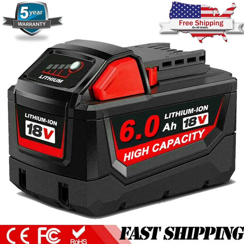 Product Description 2 PACK 6.0 AH For Milwaukee M18 Lithium High Output Extended Capacity Battery Product Details : Battery Voltage: 18 V Battery Capacity: 6000mAh Battery Type: Lithium lon Package: 2 × Repalcement M18 High Output Battery Replace PN: 48-11-1811, 48-11-1815, 48-11-1820, 48-11-1822, 48-11-1828, 48-11-1840, 48-11-1841, 48-11-1850, 48-11-1852, 48-59-181, 48-59-1850 Compatible With: For MILWAUKEE M18 Cordless LITHIUM-ION System Tools 2646-22CT, 2643-21CT, 2641-21CT, 2646-21CT, 2646-20, 2642-21CT, 2641-20, 2729-22, 2629-22, 2729-20, 2729-21, 2629-20, 2706-22, 2705-20, 2705-22, 2704-20, 2787-22, 2702-20, 2701-20, 2656-22CT, 2707-22, 2708-22, 2607-22, 2603-22CT, 2601-21, 2615-20, 2602-22DC, 2606-20, 2604-22CT, 2706-20, 2704-22, 2788-22, 2702-22CT, 2701-22CT, 2707-20, 2708-20, 2607-22CT, 2607-20, 2603-20, 2603-22, 2615-21CT, 2615-21, 2606-22CT, 2604-22, 2604-20 Please fully charge the battery first so that the battery can discharge the most efficiently and steadily! The charger Indicator light description 1. Turn on the power, it will not display 2. Charging the battery, the green light flashes 3. The battery full of charging, it will bright green light 4. If the battery has problem, The red and green lights flash alternately