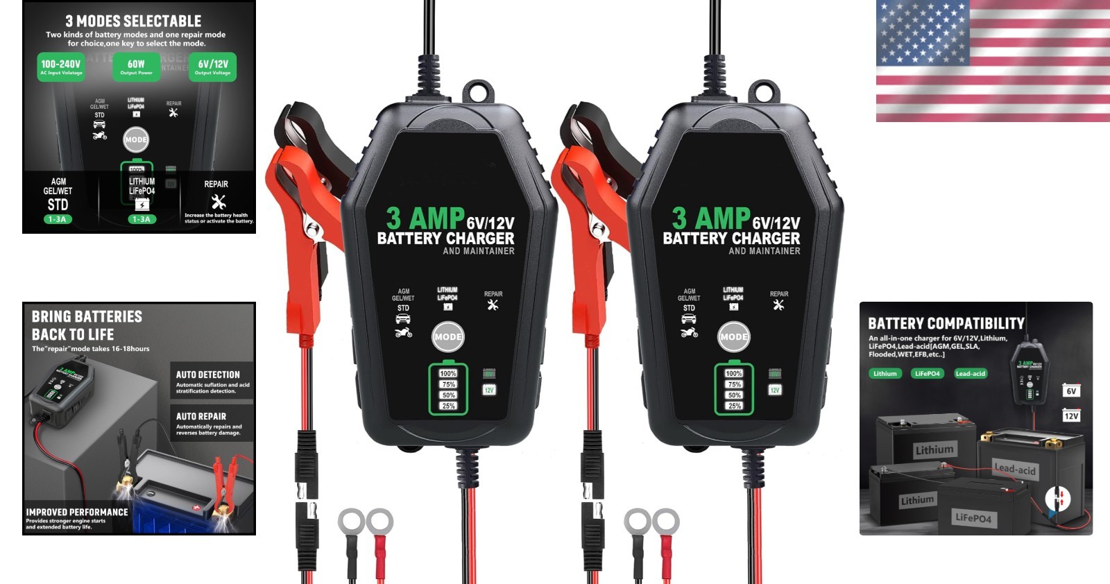 Comprehensive Car and Motorcycle Battery Charger - 2 Pack 6V/12V Smart Design ‹ › ‹ › ‹ › ‹ › ‹ › ‹ › ‹ › ‹ › ‹ › ‹ › ‹ › Comprehensive Car and Motorcycle Battery Charger - 2 Pack 6V/12V Smart Design Product Features: Widely Used: Our 6V/12V 3A car battery charger automatically identifies voltage and adjusts the charging current. Compatible with various battery types including Lead-Acid (AGM, Gel, SLA, Flooded, VRLA, EFB, MF, WET, etc.), Lithium, and LiFePo4. Stay Charged: Provides a full charge to your car, SUV, or truck battery before switching to float mode to maintain proper voltage levels without overcharging. All-in-One Battery Charger: Functions as a battery charger, maintainer, trickle charger (for lead-acid batteries), and pulse repair charger. No complicated settings—just plug in and charge. Multi-Protection: Equipped with overcharge, overcurrent, overheating, reverse polarity, and short circuit protection; sparks-free contact ensures safety. Activate Battery & Pulse Repair: Automatically detects and activates batteries, with a one-key repair option for lead-acid batteries that have been idle for an extended period. Safety Charging: Made from ABS flame-retardant shell, it's fireproof, electric shock, and corrosion resistant, ensuring longevity and safety. Trickle Charging: Automatically cuts off power after a full charge. During a power outage, it locks in the current mode and resumes charging upon power restoration. What You Can Get: Two smart battery chargers, ring terminals, alligator clip cable connections, and a comprehensive manual. Why Choose Our Charger? Don’t let a dead battery ruin your plans. Invest in our Comprehensive Car and Motorcycle Battery Charger and experience the peace of mind that comes with maintaining fully charged batteries. Designed for versatility, with the capability to charge various battery types and featuring multiple safety mechanisms, this charger is the must-have tool for any automotive enthusiast, DIYer, or casual user. Stay prepared for all your adventures—order your 2-pack battery charger today! Shipping Free & Fast Shipping - We offer free shipping to most of the USA with a normal delivery time of 3-7 days. However, due to the current situation, additional delivery time (up to 3 weeks) may be required for some items. Alternative Carriers - We may use alternative carriers (e.g. USPS, FedEx, UPS, etc.) to ensure your package arrives safely and on time. Due to the use of multiple carriers, we are unable to provide a tracking number automatically. Handling Time - Orders are processed and shipped within 1-2 business days of receiving cleared payment. Shipping Restrictions - Shipping to Alaska, Hawaii, Puerto Rico, Guam, and other US territories may incur shipping charges or delivery restrictions. Please contact us before ordering, or your order can be refunded/cancelled. State Restrictions - There may be restrictions based on your state of purchase. For example, certain items may not be shipped to California due to state regulations. Contact for Tracking Updates - If you require tracking updates or have any concerns about the delivery of your order, please feel free to contact us, and we will be happy to assist you. Return 30-Day Hassle-Free Returns - We want you to be completely satisfied with your purchase. If you are not, you can return the item within 30 days of receiving it for a full refund or exchange. Easy Return Process - To start a return, simply contact us and we will provide you with a prepaid return shipping label and detailed instructions. Restocking Fee - There are no restocking fees for returns. However, the buyer is responsible for return shipping costs if the return is not due to a seller's error. Refund Processing Time - Refunds will be processed within 5 business days of receiving the returned item in its condition. Payment We accept all major credit cards, PayPal, and Apple Pay for your convenience. Your payment information is secure and encrypted to ensure a safe and seamless transaction. Please complete your payment within 3 days of purchase to avoid any delays in shipping. Feedback Your feedback is extremely important to us. We strive to provide the best products and customer service possible. If you are satisfied with your purchase, please take a moment to leave us a positive review. If you have any concerns or issues with your order, please contact us before leaving negative feedback. We are committed to resolving any problems and ensuring your satisfaction. Contact Us If you have any questions or concerns, please feel free to out to our customer support team. You can contact us through the eBay messaging system. We are available Monday to Friday, 9:00 am to 5:00 pm EST, and we will do our best to respond to your inquiry within 24 hours. Buy it now and enjoy a pleasant shopping experience! Manufacturer Part Number: Car Battery Charger Unit Quantity: 2 Pack Features: Reverse Polarity Protection,Fully Automatic,Smart Battery Charger,Automotive Battery Maintainer,Trickle Charger,Pulse Repair Charger,AC Input 100-240V 50/60Hz,Overcharge Protection,Over Current Protection,Over Heating Protection,Short Circuit Protection,Sparks Free Contact,Activate Battery,Repair Mode,Multifunctional Accessories: User Manual,Ring Terminals Type: Charger Voltage: 6V/12V Peak Amps: 3Amp Capacity: 0mAh Unit Type: Unit