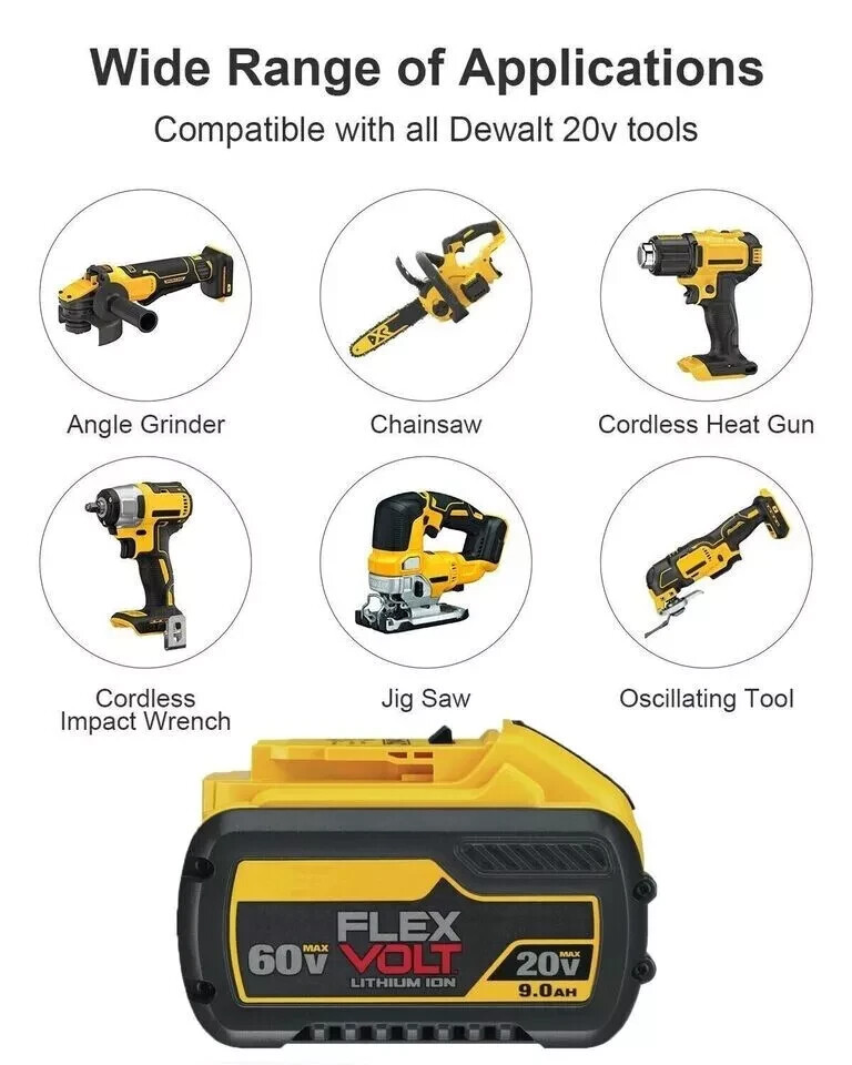 Product Description 2 Packs 9.0Ah Flex Volt DCB609 Battery Replace for Dewalt 20V/60V Max Battery Replacement for Dewalt 60v max battery DCB606, DCB606-2, DCB609, DCB609-2, DCB612, DCB612-2 Replacement for Dewalt 20v max battery DCB200, DCB201, DCB203, DCB204, DCB206, DCB207, DCB208, DCB201-2, DCB181-XJ, DCB181, DCB180 Compatible with Dewalt 20V/60V MAX Tools Compatible with Compatible with Dewalt DCD Series: DCD740, DCD740B, DCD780, DCD780B, DCD780C2, DCD780L2, DCD785C2, DCD785L2, DCD980L2, DCD980M2, DCD985B, DCD985L2, DCD985XR, DCD785C2, DCD780C2, DCD780B, DCD740C1, DCD740B Compatible with Compatible with Dewalt DCF Series: DCF883B, DCF883L2, DCF885, DCF885B, DCF885C2, DCF885L2, DCF895B, DCF895C2, DCF895L2, DCF895L2, DCF895C2, DCF895B, DCF885L2, DCF885C2, DCF885B, DCF883L2, DCF883B, DCF880C1-JP, DCF883B, DCF880C1-JP Compatible with Compatible with Dewalt DCS Series: DCS331B, DCS331L1, DCS331L2, DCS331N, DCS380B, DCS380L1, DCS381, DCS391B, DCS391L1, DCS393, DCS393, DCS391L2, DCS391L1, DCS391B, DCS381, DCS380L2, DCH214L2 Compatible with Compatible with Dewalt DCG Series: DCG412, DCG412B, DCG412L2 Compatible with Compatible with Dewalt 60V MAX Tools: DCS578X2, DCBL772X1, DCK299D1T1, DCS578B, DCS690X2, DCC2560T1, DCG414B, DCD460T2, DCG418X1, DCS389B, DCS388T2, DCH481B, DCS7485B, DCD130B, DCS520T1, DCS388T1, DCS520B, DCBL772B, DCG414T2, DCS574W1, DCS388B, DCS389X1, DCD470B, DCG418X2, DCS575B, DCS7485T1, DCS373B, DCBL770X1 Compatible with Dewalt 20v/60v max lithium ion battery charger DCB107, DCB115, DCB118, DCB104, DCB102, DCB101, DCB103, DCB119, DCB1112, DCB1800B