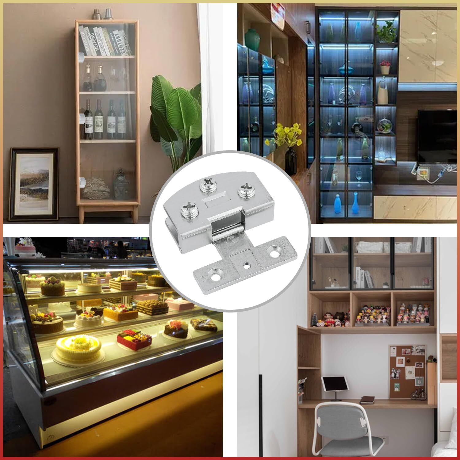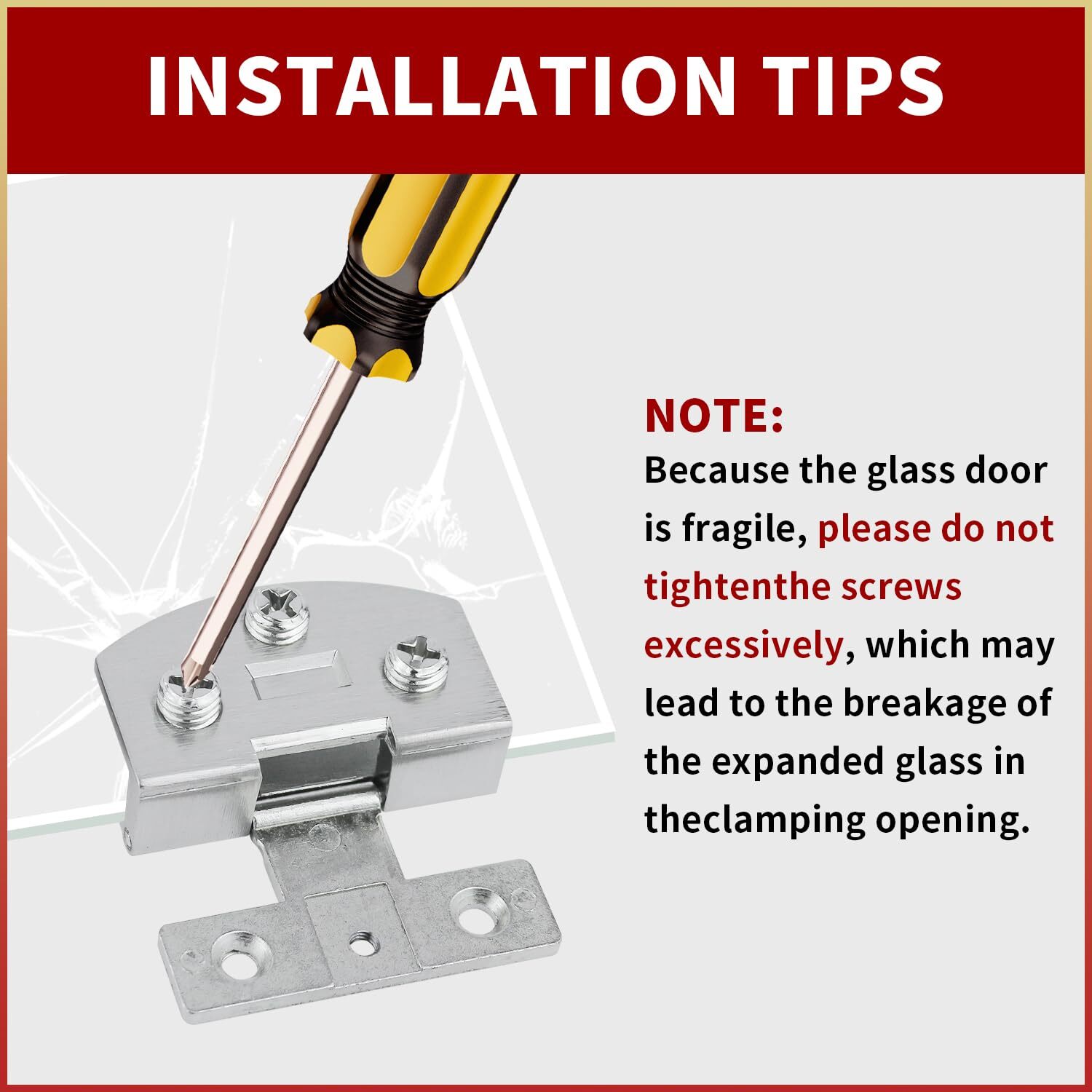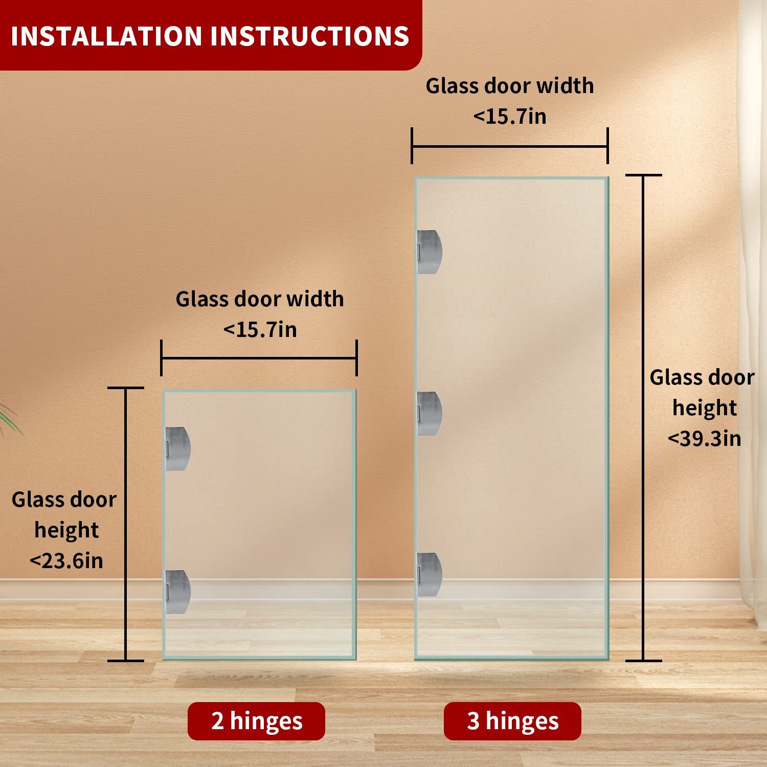 Cabinet Glass Door Hinge Without Drilling The package includes two hinges, equipped with screws, anti slip gaskets, and snap tabs. Color: Silver Note: 1. First determine the installation position and then install the screws, so as to avoid errors and cause the installation to fail. 2. The hinge installation has certain challenges. It is recommended that people with installation experience or strong hands-on ability buy it. HIGH QUALITY MATERIAL: Made of preferred zinc alloy material, it is sturdy and wear-resistant, with strong bearing capacity.Using a positioning slot design, when the hinge is at right angles, it can be fastened and fixed to avoid the wind blowing door swing. Anti slip gasket with toughness to increase friction and protect glass from damage WIDE APPLICATION: Cabinet glass door hinge widely used on frameless glass cabinet doors.Suitable for small cabinet doors such as cake cabinet doors,cupboard display cabinet doors,display cabinet doors,showcase wine cabinet doors,bookcases doors,lockers doors,etc NOTE: The available glass size is 5-8mm (0.19-0.31 inch), and maximum bearing weight of the two hinges is 33 pounds. Generally, glass doors have a width of less than 15.7 inches and a height of less than 23.6 inches,a door requires at least 2 hinges.It is recommended to install 3 hinges on each door, and the height of the door should not exceed 39.3 inches INSTALLATION TIPS: First determine the installation location, with a 0.2 inch clearance between the glass door and the cabinet, and then install the screws to avoid errors and installation failures.Glass door hinge adopts a U-shaped bayonet design without opening holes. Because the glass door is fragile, please do not tighten the screws excessively, which may lead to the breakage of the expanded glass in the clamping opening SAVE TIME SAVE MONEY: Every piece of product has been carefully checked before packaging. Making you more satisfied is our unremitting pursuit