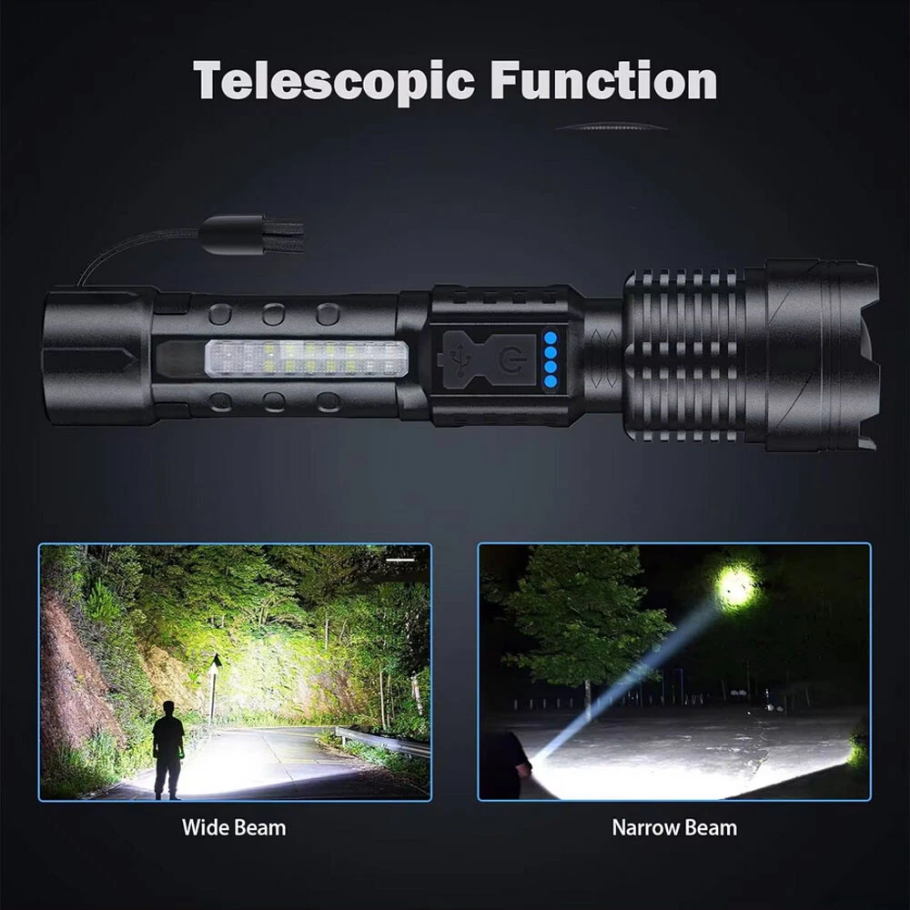 Product Description Specifications: Bulb: XHP50 High beam LED Size:16.5*4*4CM Net weight:150G Battery:Built-in lithium battery Zoom method: telescopic zoom Charging method: USB charging Material: aluminum alloy+ABS Switch: Push the switch Gear position: 7 gears Waterproof grade: IPX-4 life waterproof Features: 1. Equipped with XHP50 lamp beads , and a service life of 100,000 hours.White High beam LED can illuminate more than 2000 meters 2. Ideal for hunting, adventure and other outdoor adventure activities. 3. This product has a power reminder function, You can know the power status of the flashlight anytime, anywhere 4. Waterproof in accordance with IPX-4, waterproof, can be used in rainy weather, but can not be placed in water 5.Battery capacity display, Micro usb for computer USB, car USB, USB charging plug, charging flashlight.And support USB output function 6.7 lighting modes, super bright headlights equipped with floodlights can meet most of the lighting needs 7.Suitable for work, hunting, climbing, fishing, camping and outdoor activities, etc. Package list: 2 * Flashlight 2 * Battery 2 * Type C charge cable