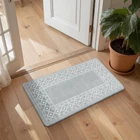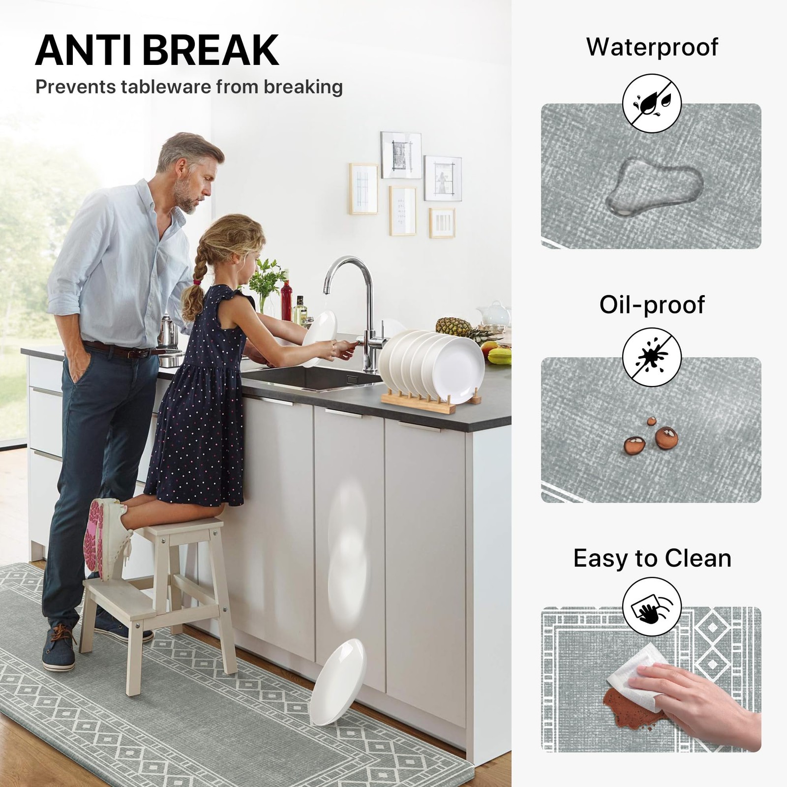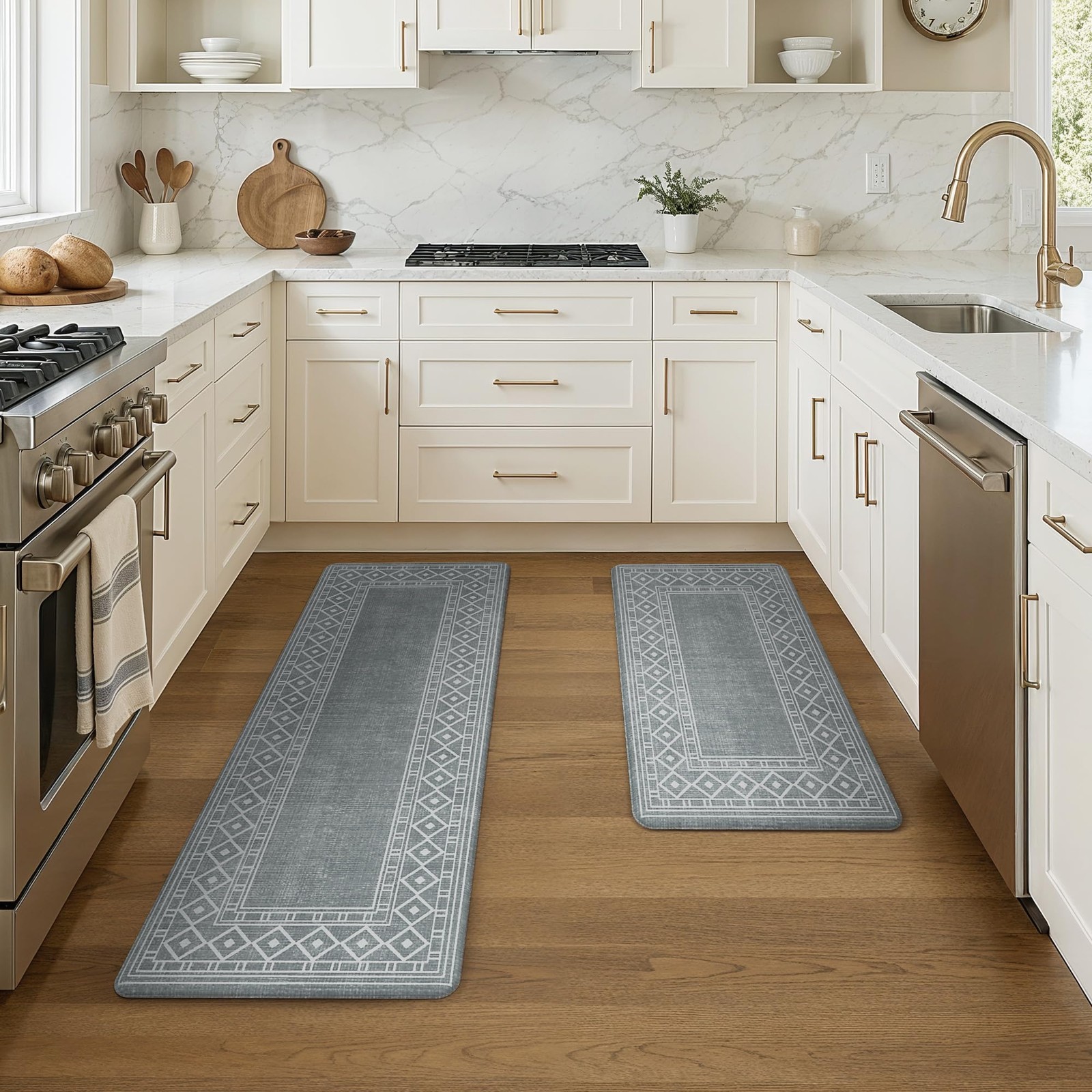 Kitchen Mats for Floor 2 PCS Cushioned Anti-Fatigue, Geometric Waterproof Kitchen Rugs Non Slip Washable, Comfort Standing Mat Rug for Kitchen, Office, Desk, Laundry, Grey, 17"x 47"+17"x 30" Anti-Fatigue: Discover lasting comfort with 's ergonomic kitchen mat. Crafted with premium rebound memory foam, its triple-layer cushioning targets feet, knees and back while reducing joint pressure. The smart design supports proper posture for hours of comfortable standing, perfect for prepping meals, washing dishes, or marathon cooking sessions, a true kitchen essential for new home comfort.Works equally well at standing desk, making it essential desk accessories Effortless Cleaning: Our kitchen runner stays securely in place with its upgraded bottom - no more annoying slips or slides! When messes happen, just give it a quick wipe and you're done. Spills, splatters, and everyday kitchen accidents clean up in seconds, saving time on home essentials Waterproof & Oil-Proof: kitchen rug set features a waterproof and oil-proof surface that effortlessly repels everyday spills and stains. Made from durable materials, it withstands wear and maintains its shape over time, protecting your house and keeping your kitchen clean and fresh Classic Geometric Design: Designed with a timeless geometric pattern, this kitchen rugs set of 2 effortlessly enhances your space with a modern and stylish touch. It perfectly complements your home decor, kitchen decor, house decor, and apartment decor, while providing extra comfort and reliable protection. A top choice for kitchen decor and accessories and apartment must haves Versatile for Daily Comfort: Perfect home and kitchen accessories for sink, stove, or counter, this cushioning foam mat also shines as a laundry room rug, in home offices as standing desk companion and hallways. The durable, low-profile design transitions seamlessly between spaces, acting like supportive floor cushions wherever you stand, reducing joint strain. Top new home essentials and kitchen essentials for new home