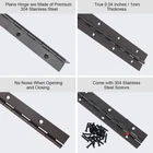 Product Description: Introducing our 16Inch Black Continuous & Piano Hinges, designed for durability and versatility. Crafted from heavy-duty stainless steel, these hinges provide reliable strength for your woodworking projects. The black finish adds a touch of elegance to your cabinets and doors, making them stand out. With easy installation and a wide range of applications, these hinges are a must-have for DIY enthusiasts and professionals alike. Premium Quality: Crafted from high-quality stainless steel, these hinges are resistant to corrosion, ensuring long-lasting performance and durability. Enhanced Stability: With a thickness of 0.05 inches, these heavy-duty hinges offer superior stability and support for your cabinet doors, preventing sagging or misalignment. Smooth Operation: The continuous hinge design ensures a smooth and effortless opening and closing experience, providing convenience and ease of use. Versatile Applications: Suitable for folding cabinet doors, toolboxes, storage boxes, and more, these hinges offer versatility for various woodworking projects. Complete Package: Each pack includes 2 hinges and 32 screws, providing everything you need for quick and hassle-free installation.