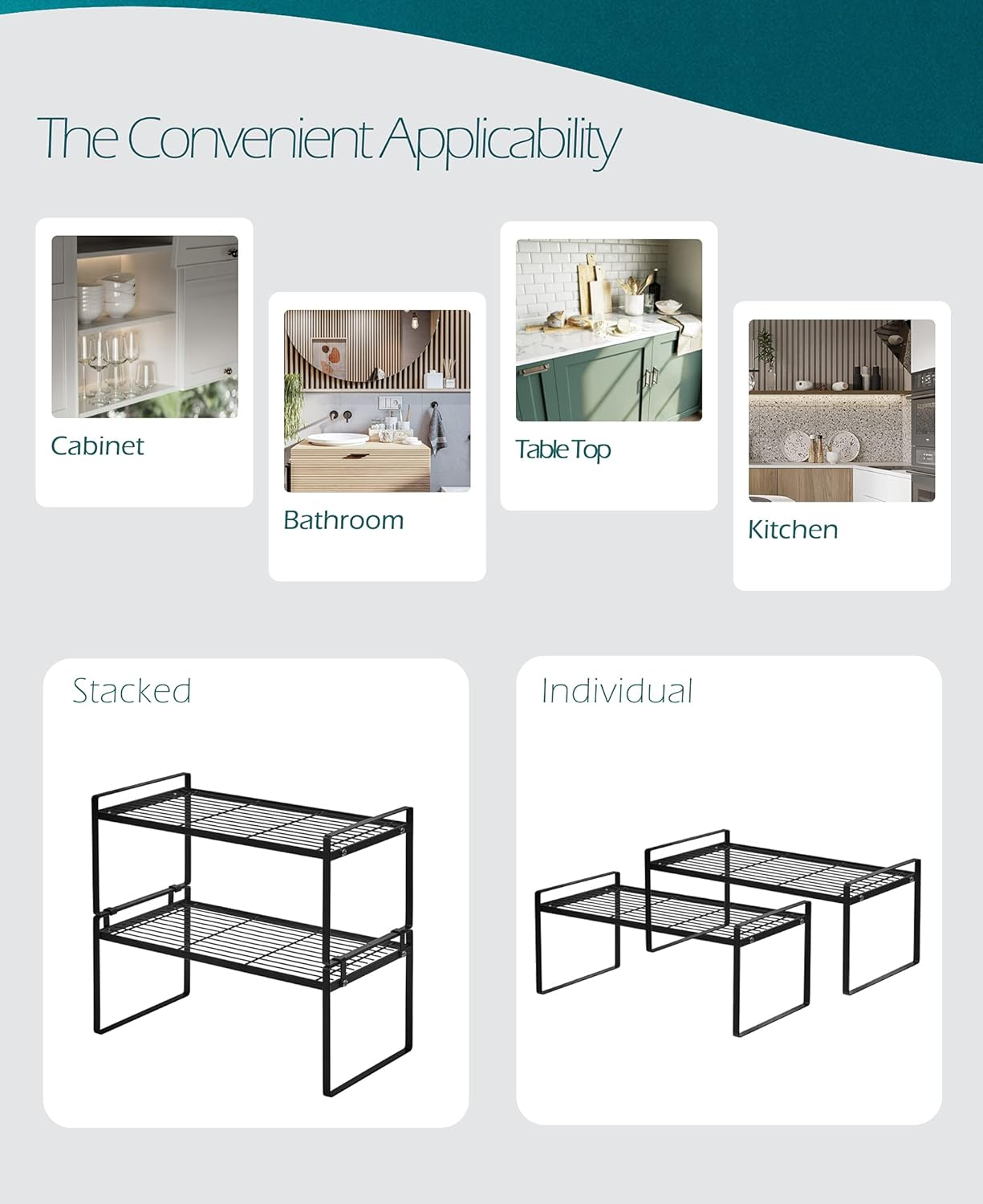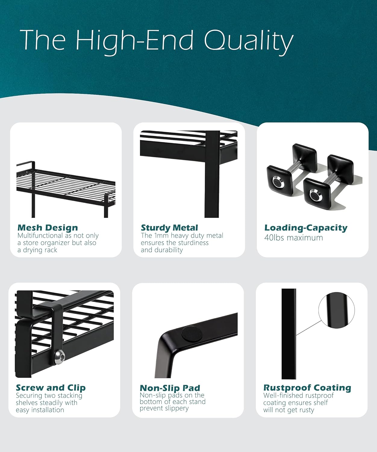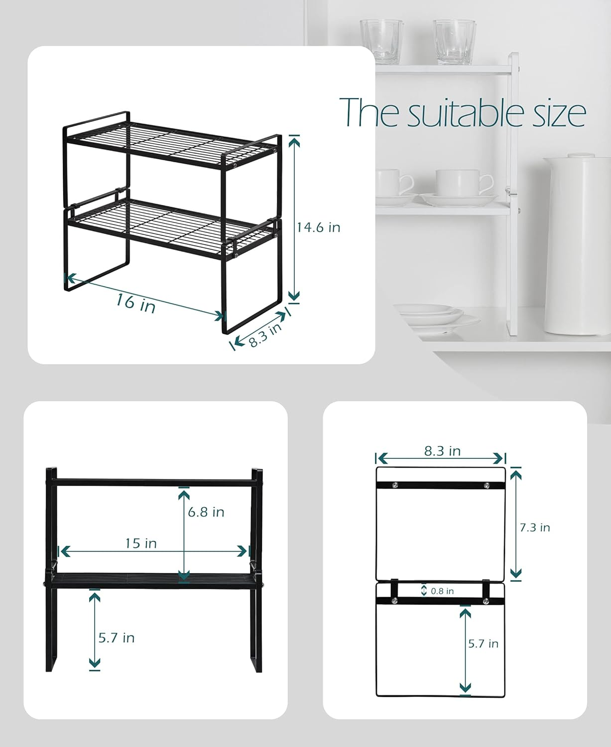 MULTIFUNCTIONAL: These cabinet shelves can be used individually or stack one to the other to become a 2 tiers shelves to organize your items. They are great organizers for your cabinet, pantry, cupboard, closet, drawer or counter top in kitchen, bathroom, bedroom and under the sink. With the mesh design board, it can be a drying rack for dishes, bottles, plates. EXTRA SPACE: These stackable cabinet shelves maximize storage efficiency, providing more spaces as a riser which allows you to use the upper space. The added storage space helps organization and tidiness. All the wee little bottles, tins, vials, pans and a myriad of other kitchen utensils could go underneath, the middle or the top of the cabinet shelf, reaching with ease. STURDINESS and RELIABILITY: Made with heavy duty metal that built to last. With the well-finished coating on so won’t get rusty and smooth to the touch. The bottoms of the stand frame with non-slip pads attached so it will stay securely and won’t slip off the surface. They are an absolute beautiful addition to your home or office. MAX UTILITY: It can be a shelf or rack to serve your organizing purpose. It’s a great organizer for dishes, bottles, cans, pots, pans. It’s also a rack for snacks, spices, seasonings, fruits and so on. It helps to make spaces more efficient and tidier. SPECIFICATION: Individual one shelf: 16 * 8.3 * 7.3 inches. Stacked two shelves: 16 * 8.3 * 14.6 inches. Loading Capacity: 40lbs. Manual and assembly parts includes in the package. You’re welcome to if you have any problems with our products. Product Description Shantton Kitchen Cabinet Shelf 2Pack Stackable-Great Storage Idea for Your Home Imaging use these cabinet shelves to organize your messy house. Every disorganized items will be placed in order and can be reached easily ever after. They are delicately designed to be not only a organizing unit but also a modern decoration to your home. Their paint of cover are massy, specially-made paint makes matt white and matt black, turning them to be a special one. Great gift for Thanksgiving Day, Boxing Day, Cyber Monday, Christmas, Mother's Day, Black Friday. Prodcut Name: Cabinet Shelf / Cupboard Organizer / Countertop Organizer / Storage Stand / Space Riser Specification: Standard version: One Shelf - 16.1 * 8.3 * 7.3 inches , Stacked Two Shelves - 16.1 * 8.3 * 14.6 inches Tall Version: One Shelf - 16.1 * 8.3 * 9.5 inches , Stacked Two Shelves - 16.1 * 8.3 * 19 inches 1 Easy Installation 2 Non-Slip 3 Quality Coating 4 Great Loading-Capacity Uses: Cabinet, Pantry, Cupboard, Kitchen, Bathroom, Under sink, Bedroom, Office desk, Countertop, Table, Dish, Bottle, Cup, Spice, Pot, Plate, Book, Shoe, Accessories Cabinet Shelves with different Sizes Add to Cart Add to Cart Add to Cart Add to Cart Add to Cart Add to Cart Add to Cart Customer Reviews 4.7 out of 5 stars 2,522 4.7 out of 5 stars 2,522 4.7 out of 5 stars 2,522 4.7 out of 5 stars 2,522 4.7 out of 5 stars 2,522 4.7 out of 5 stars 2,522 4.7 out of 5 stars 2,522 Price $33.99 $ 33 . 99 $36.99 $ 36 . 99 $38.99 $ 38 . 99 $39.99 $ 39 . 99 $33.99 $ 33 . 99 $35.99 $ 35 . 99 $29.99 $ 29 . 99 Color White & Black White & Black White & Black White & Black White & Black White & Black White & Black Seperate Unit Size L13.1'' W10.6'' H7.3'' L13.1'' W10.6'' H9.5'' L16.1'' W10.6'' H7.3'' L16.1'' W10.6'' H9.5'' L16" W8.3" H7.3" L16" W8.3" H9.5" L13" W8.3" H7.3" Stacked Unit Size L13.1'' W10.6'' H14.6'' L13.1'' W10.6'' H19'' L16.1'' W10.6'' H14.6'' L16.1'' W10.6'' H19'' L16" W8.3" H14.6" L16" W8.3" H19" L13" W8.3" H14.6" Stackable ✔ ✔ ✔ ✔ ✔ ✔ ✔ Loading-Bearing 40LBS 40LBS 40LBS 40LBS 40LBS 40LBS 40LBS